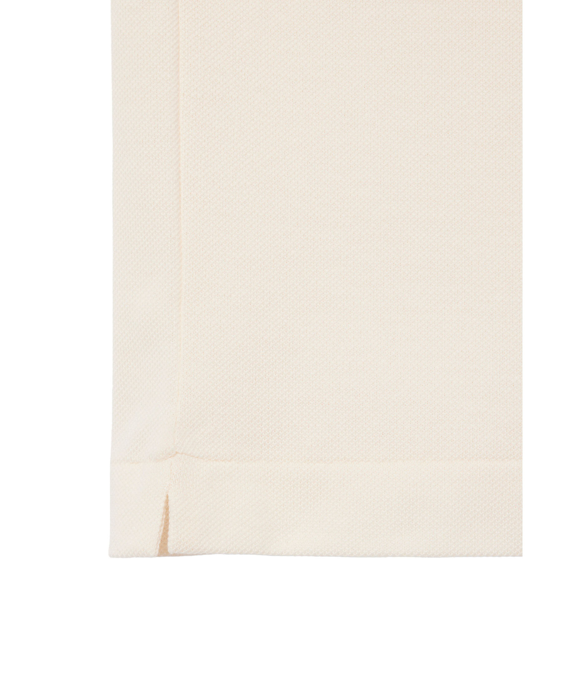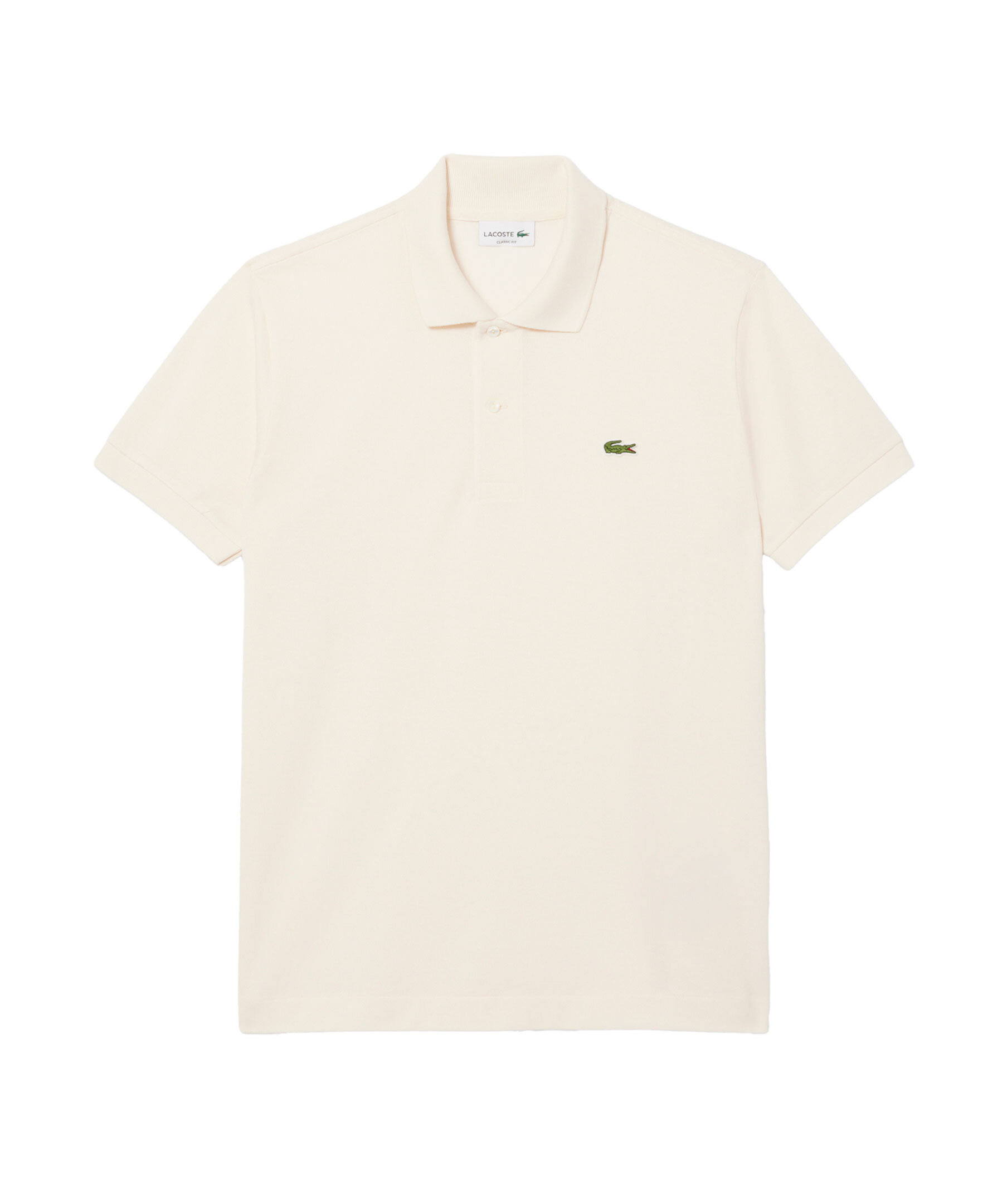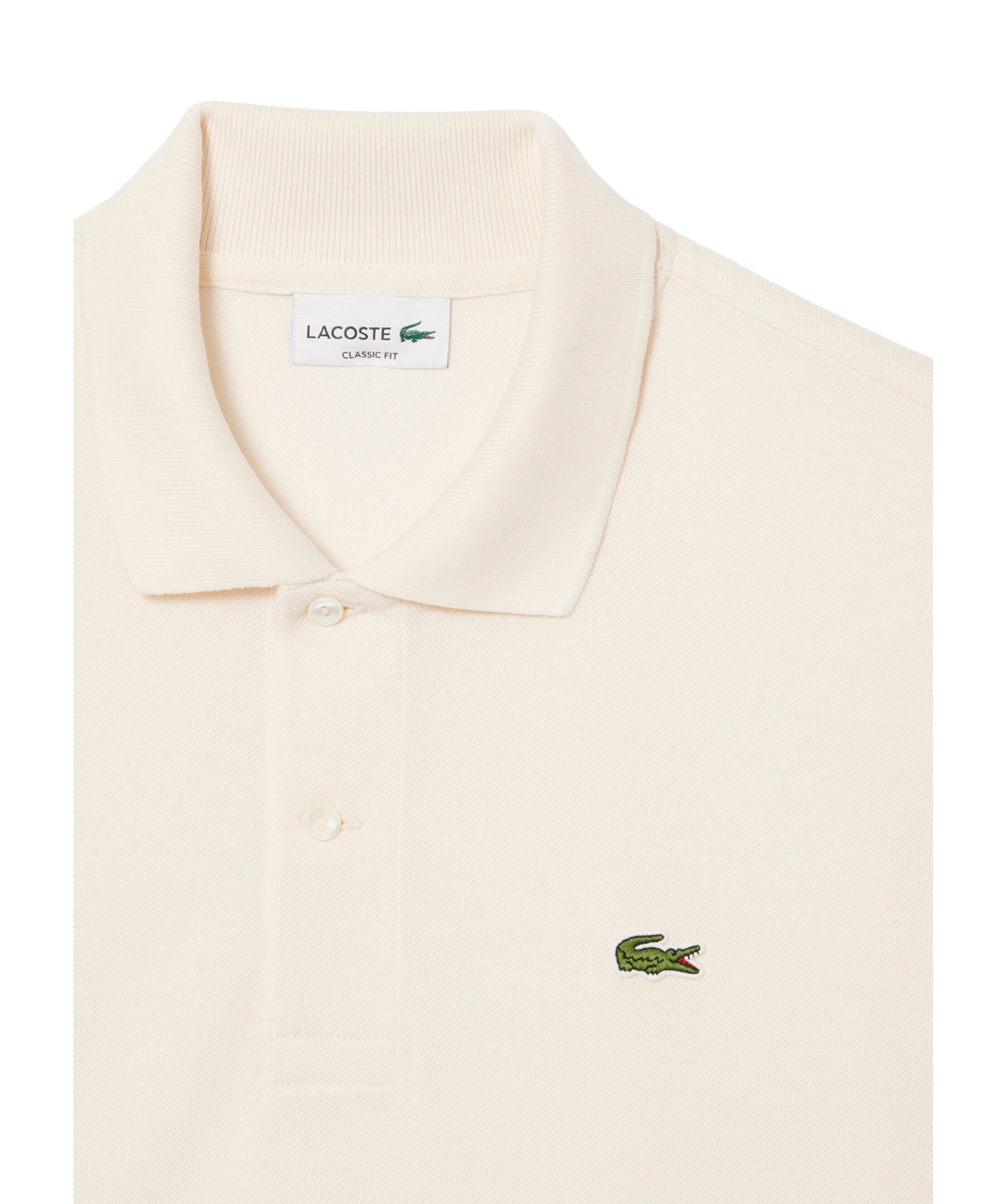 Benvit pikétröja från Lacoste. Broderad logotyp på bröstet, två knappar fram, spetsig krage och korta slitsar i sidorna. Tillverkad i 100% bomull.