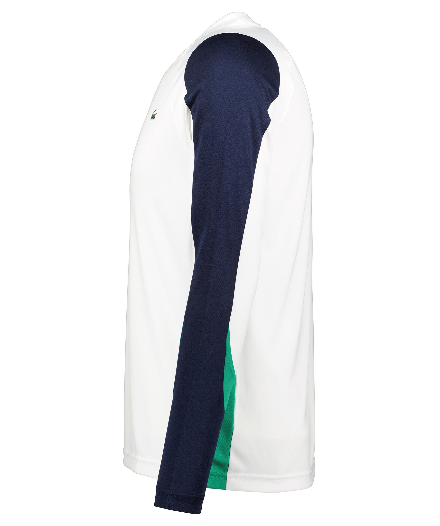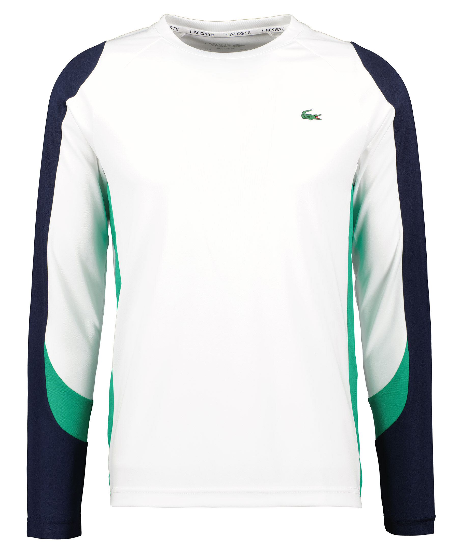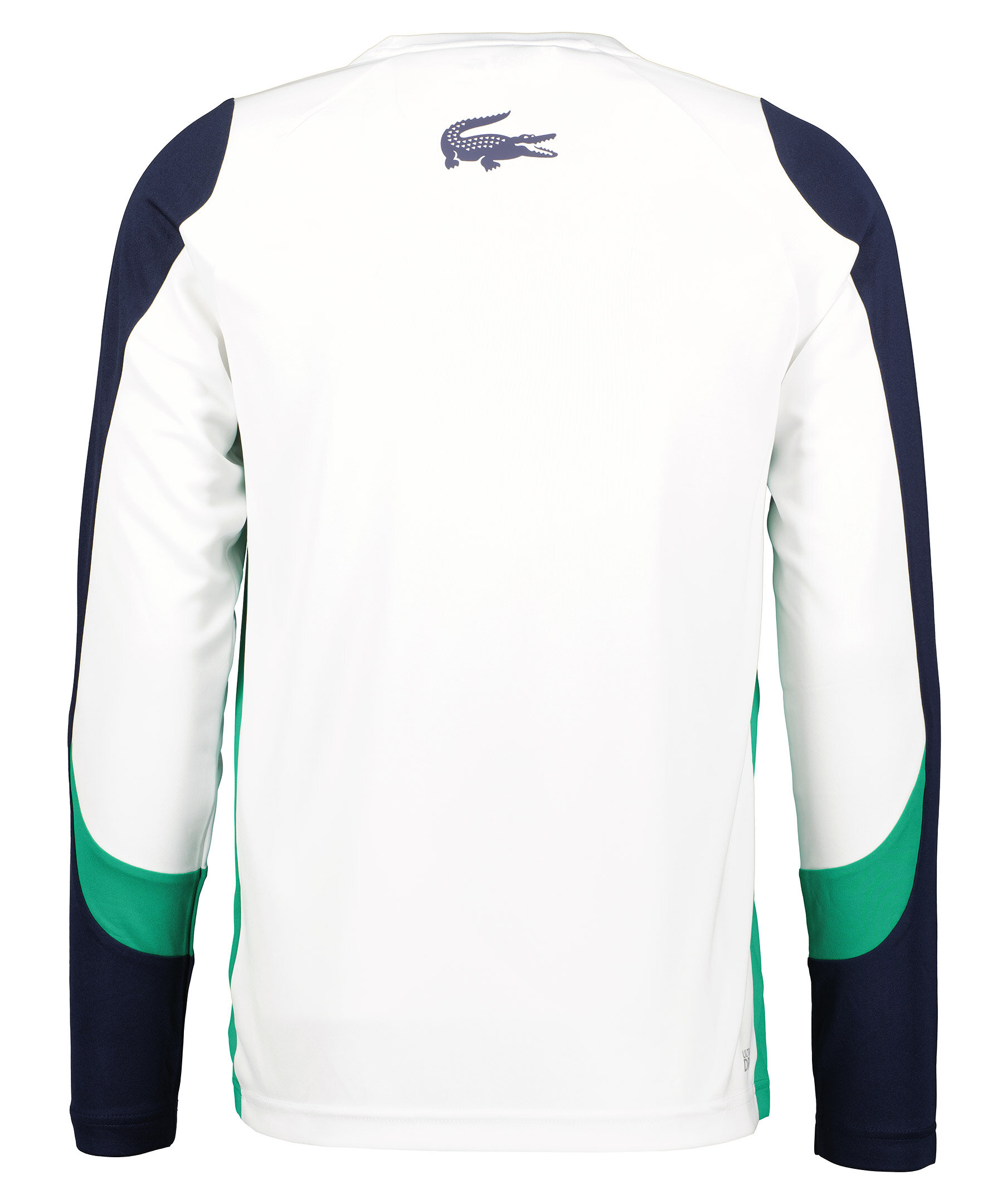 Vit, blå och grön träningströja från Lacoste. Rundad halsringning. Mörkblå och gröna revärer på ärmarna och i tröjans sidor. Gummerad logotyp på vänster bröst.