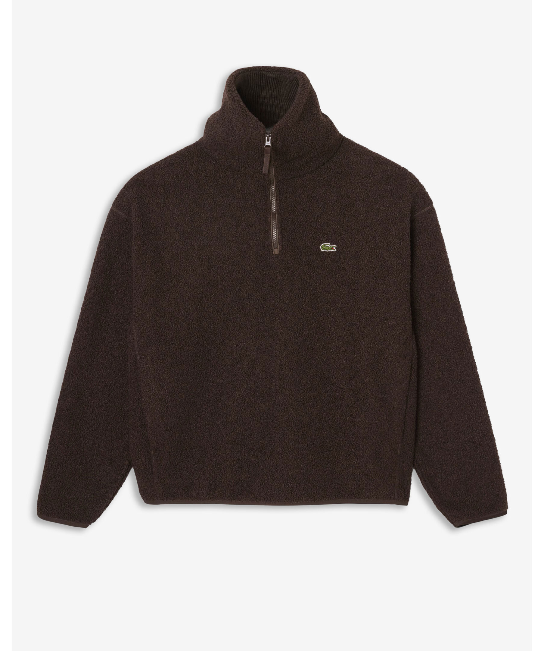 Brun fleecetröja med half-zip från Lacoste. Den ikoniska krokodilen är broderad på bröstet. Två sidfickor och elastiska band vid ärm och plaggslut.