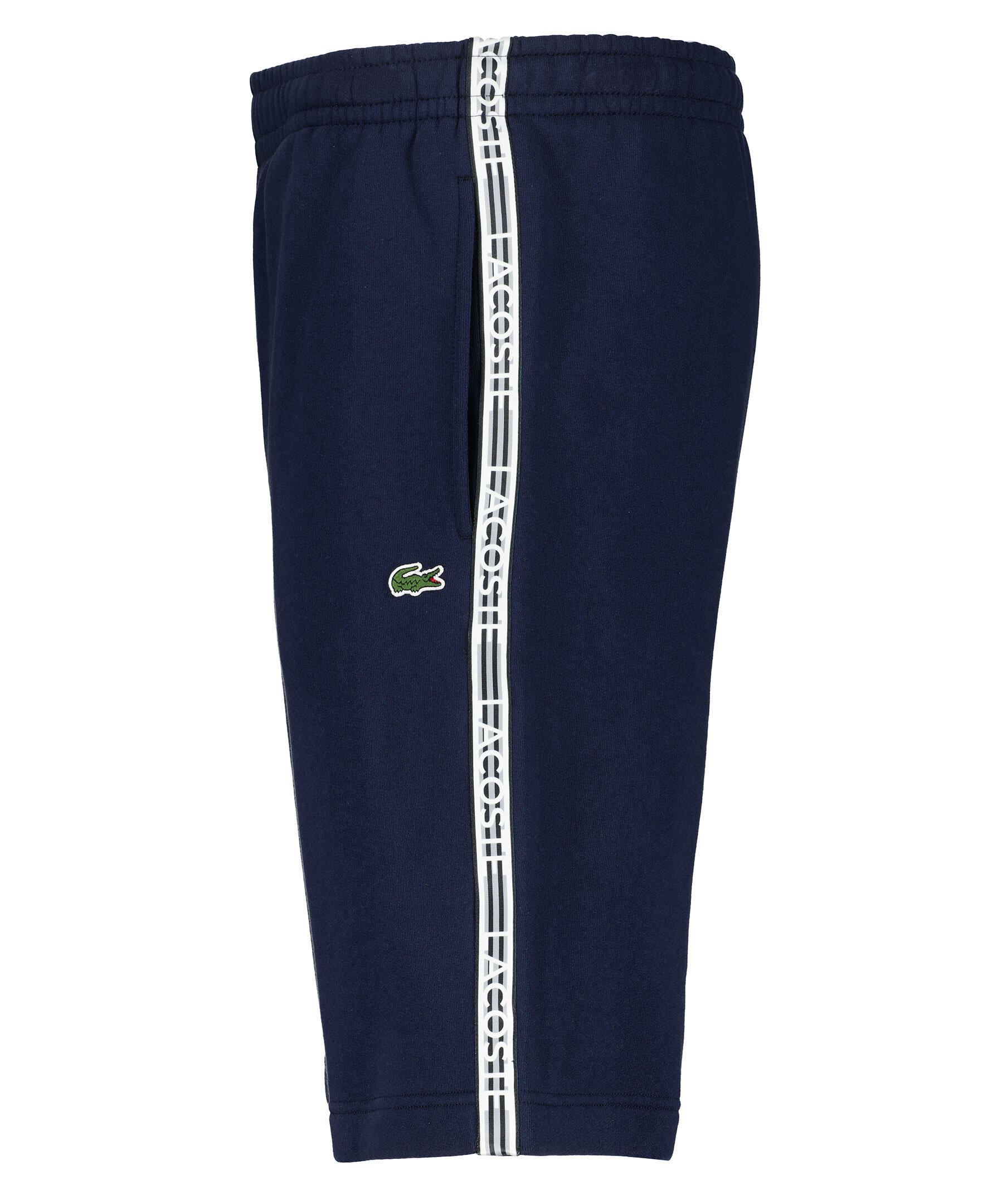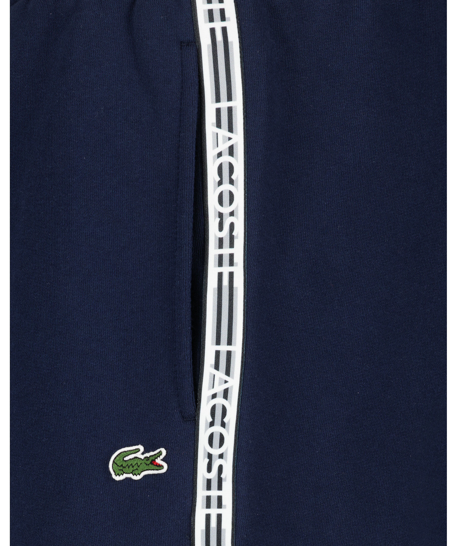 Marinblåa mjukisbyxor från Lacoste. Dragsko i midjan. Två fickor framtill. Broderad patch på vänster ben. Revärer med logotyp längs benen i vitt, grått och svart. Tillverkad i bomullsblandning.