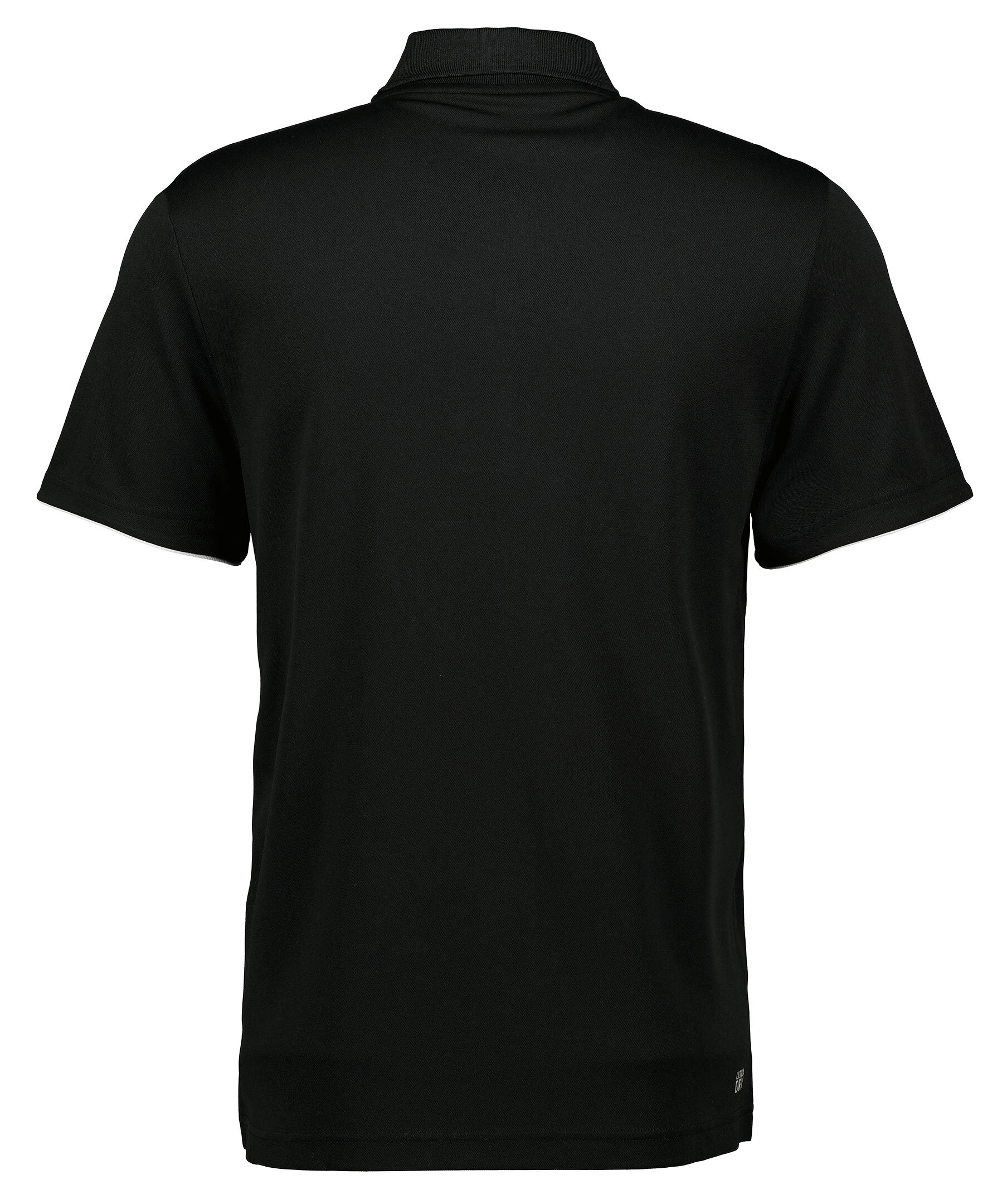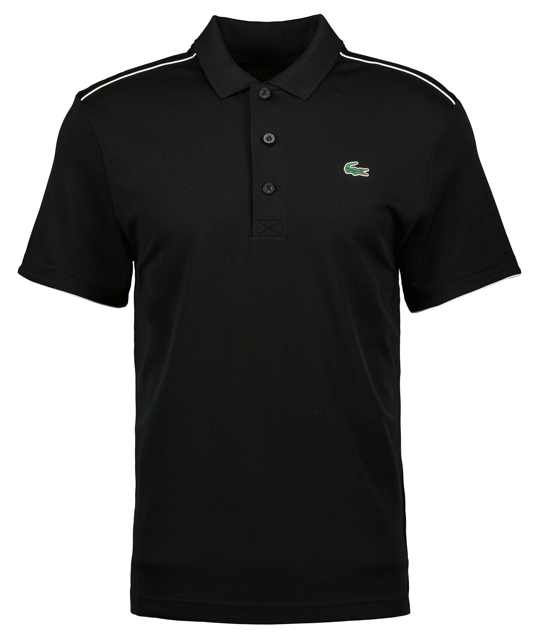 Svart piké från Lacoste. Vita detaljer. Gummerad logotyp på vänster bröst. Tre knappar. Spetsig krage.
