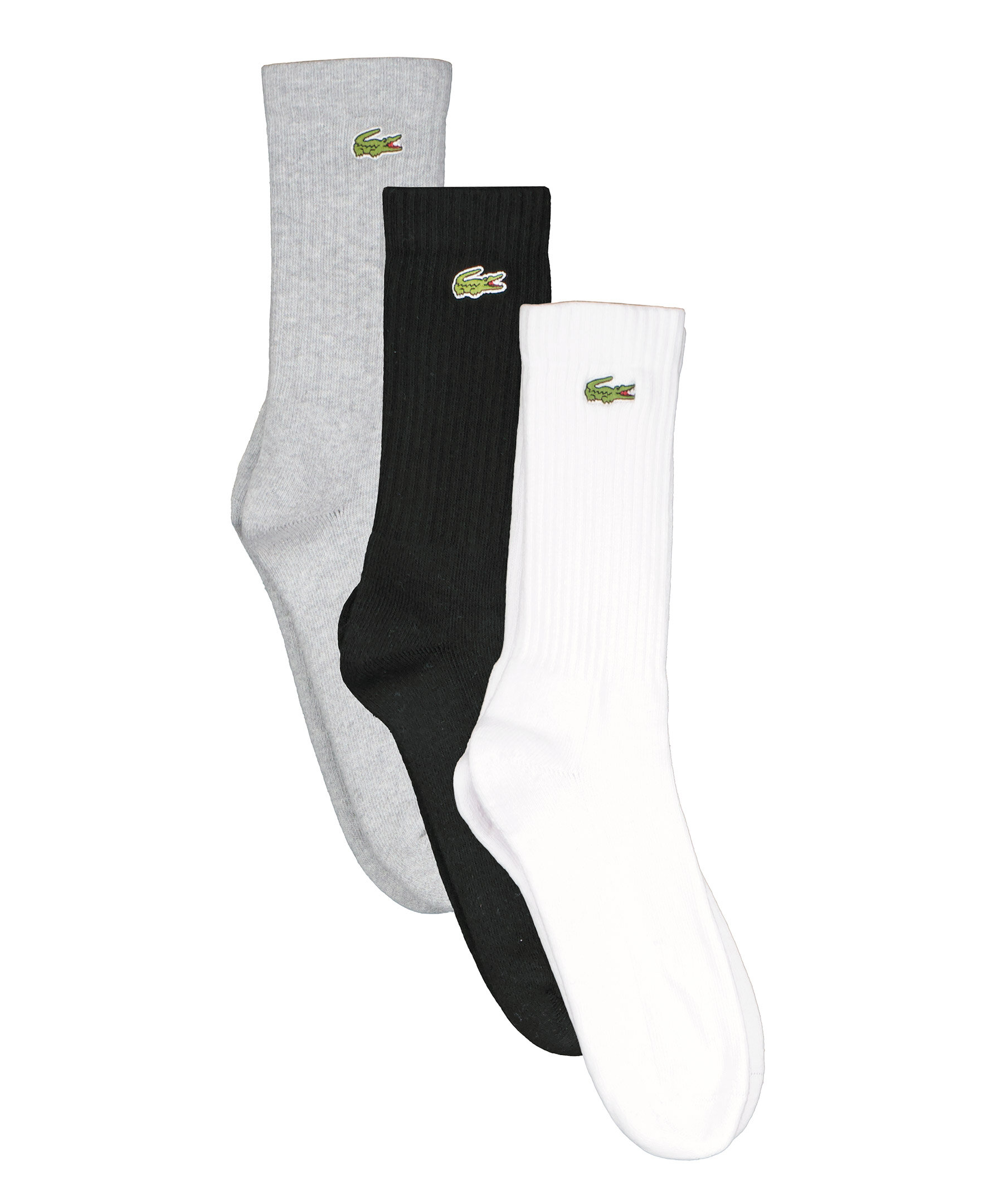 Tre-pack med höga ribbade strumpor från Lacoste. Kommer med färgerna svart, grå och vit. Broderad krokodil på toppen av strumpan.