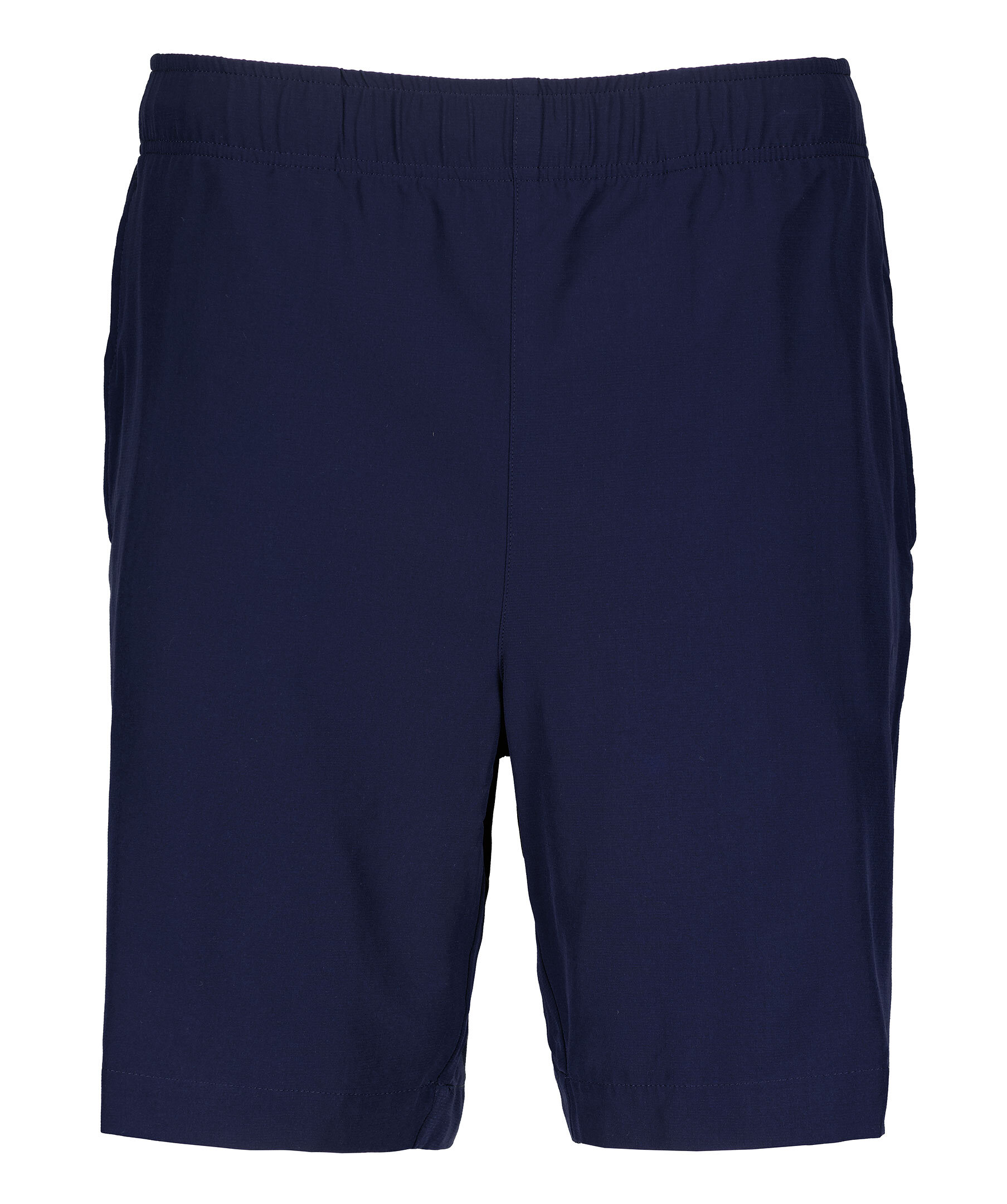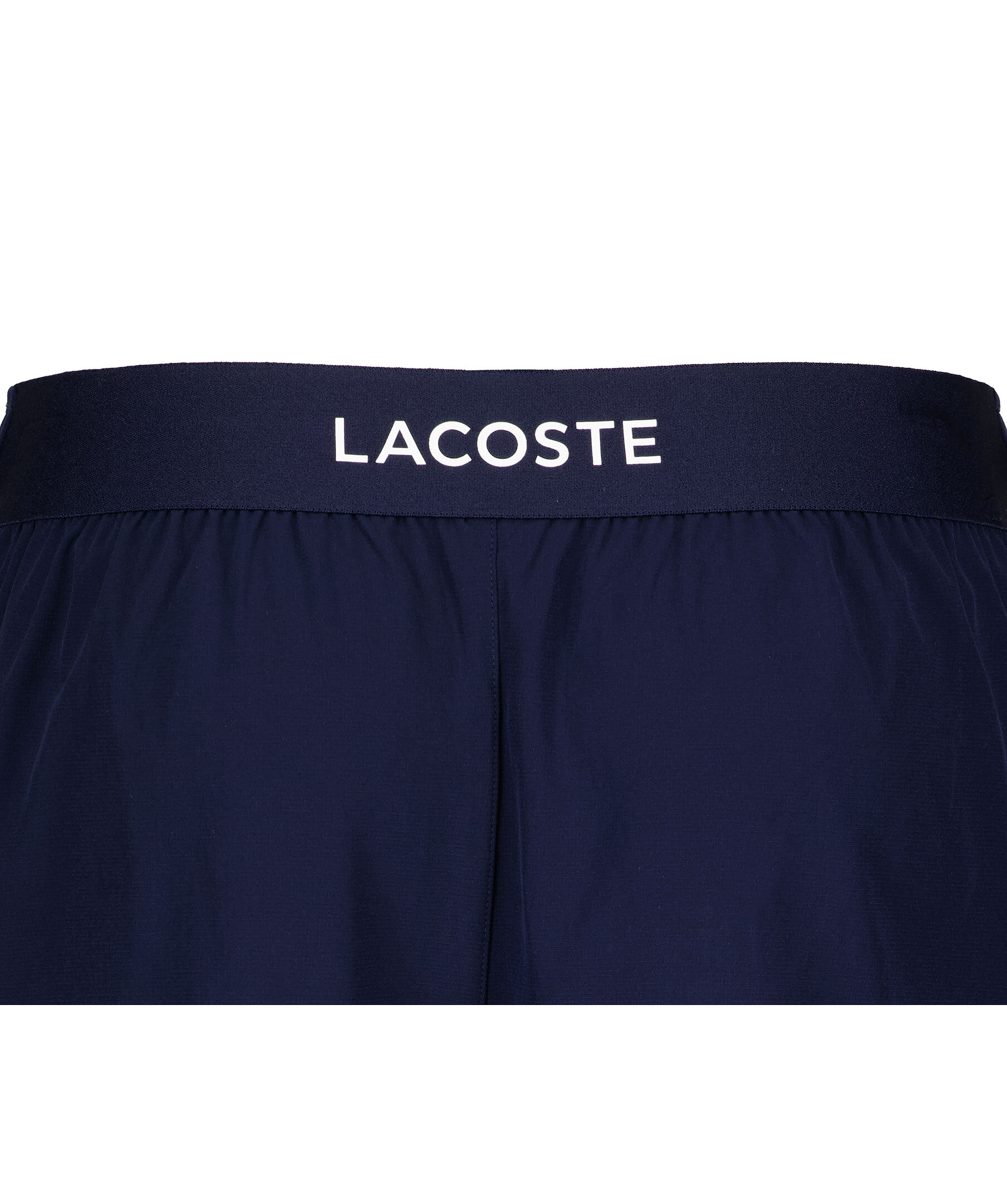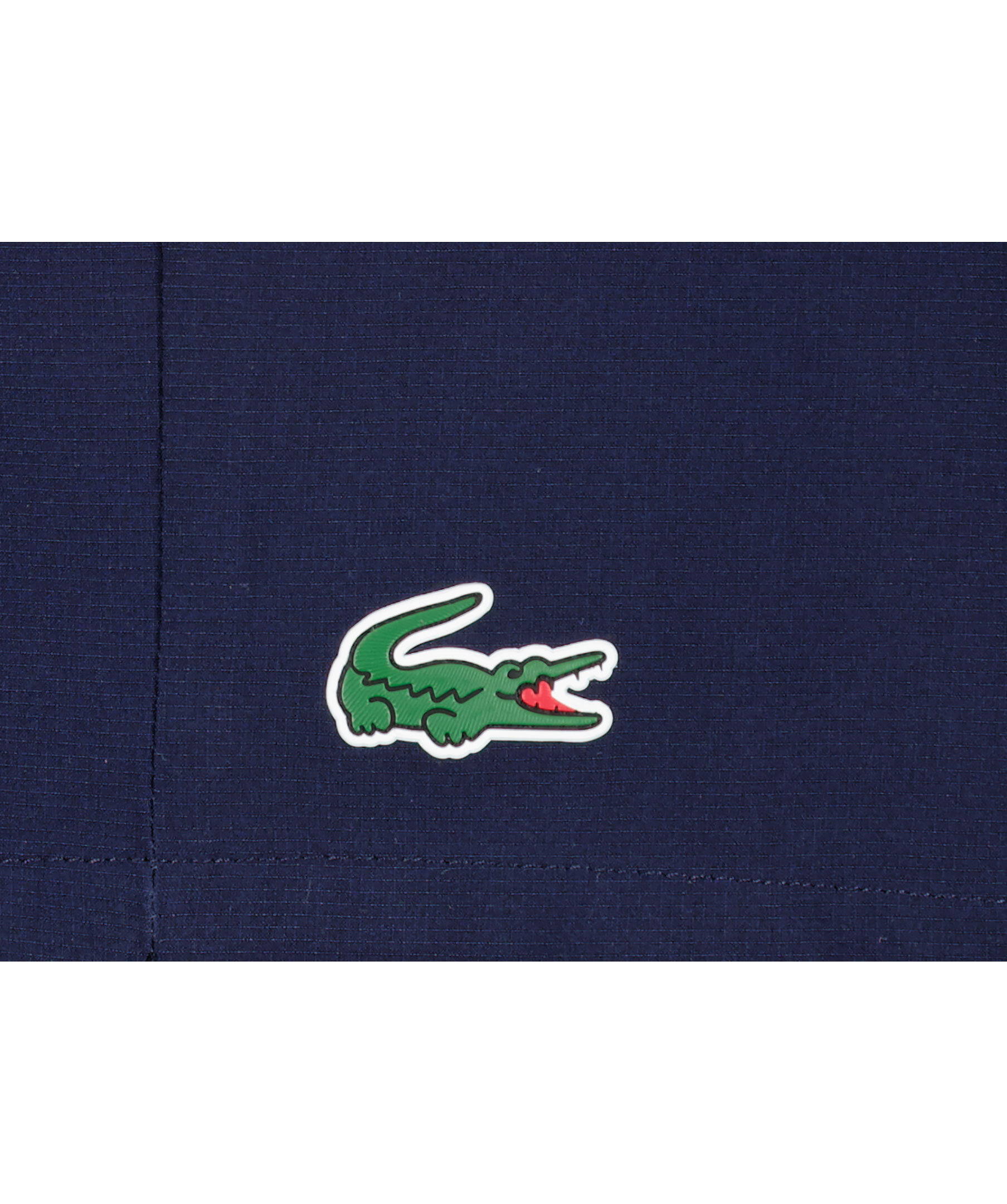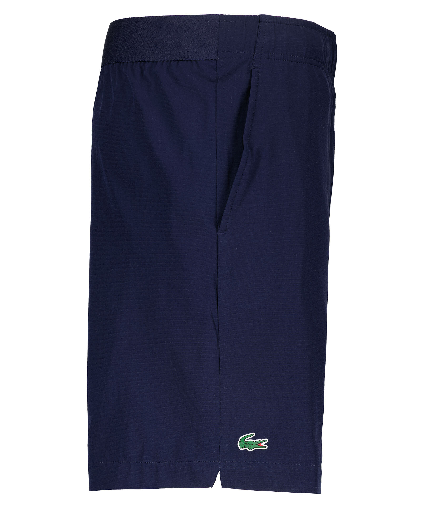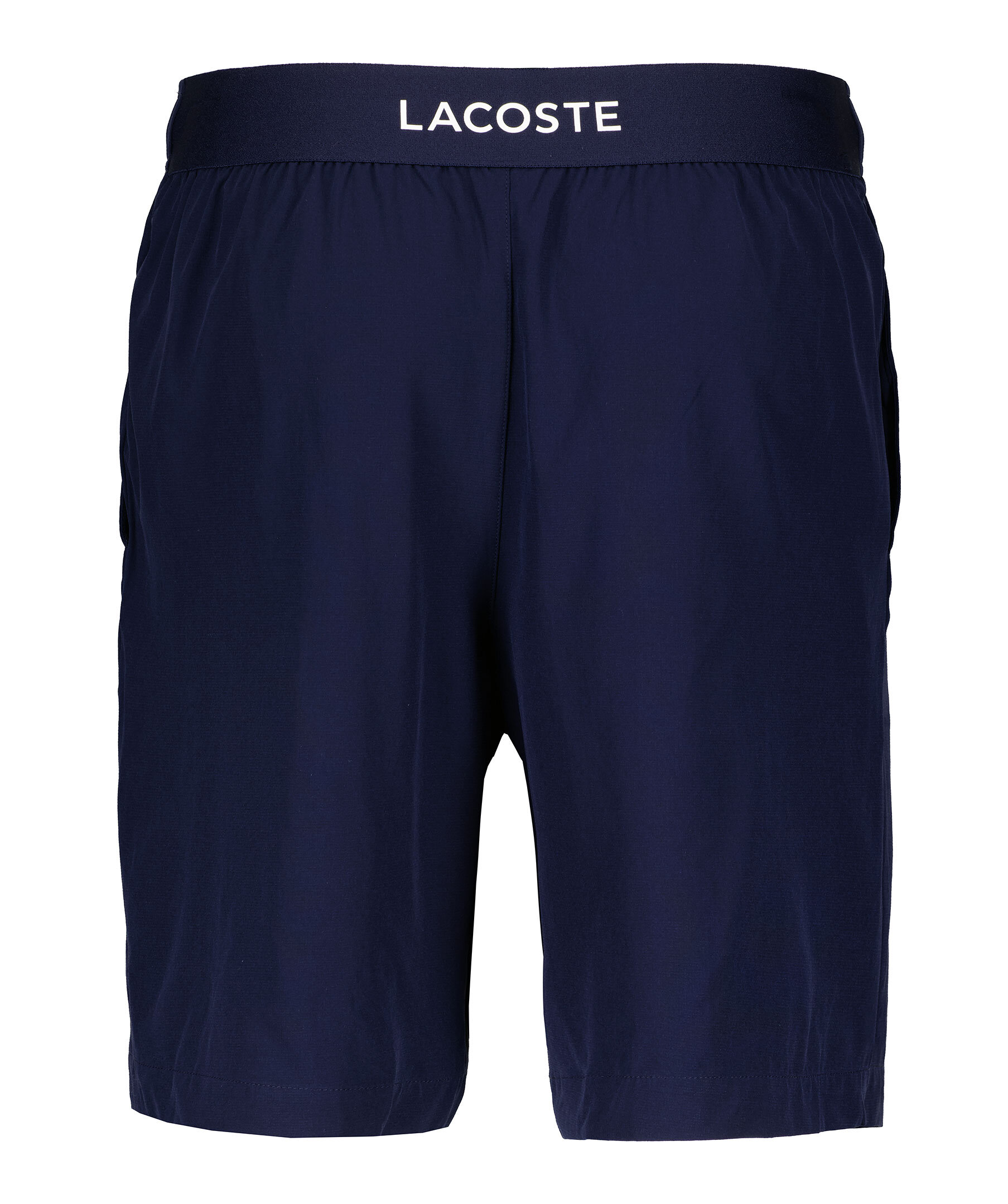 Marinblåa shorts från Lacoste. Resår och dragsko i midjan. Två fickor framtill. Gummerad logotyp vid höger benslut. Tryckt logotyp baktill på resåren i midjan.