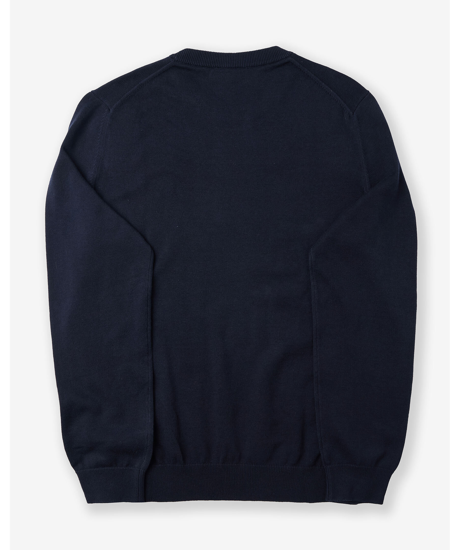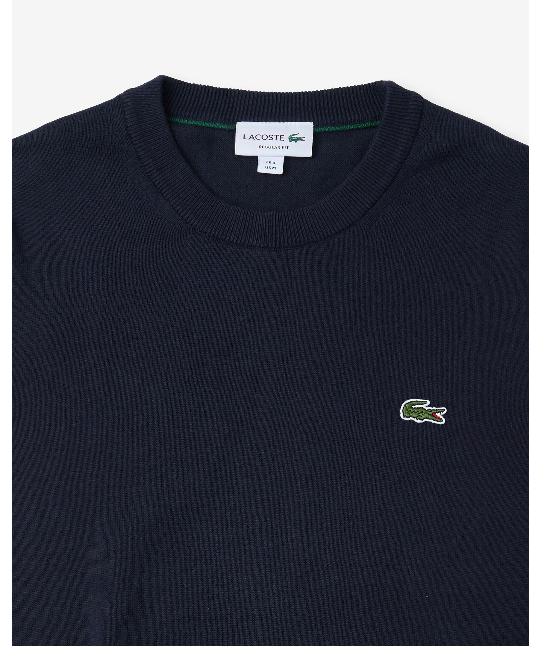 Mörkblå, finstickad pullover från Lacoste. Tröjan har en rundad och ribbstickad halsringning samt ribbstickade muddar vid ärm- och plaggslut. Liten logotyp på bröstet. Tillverkad i en bomullsblandning.