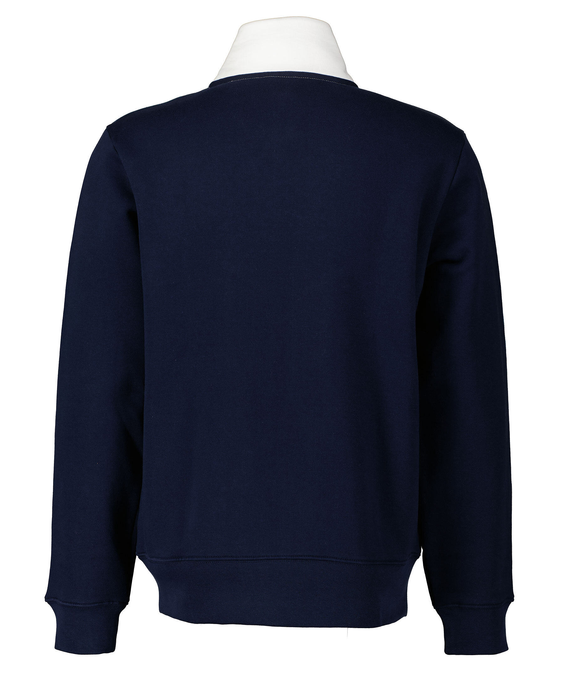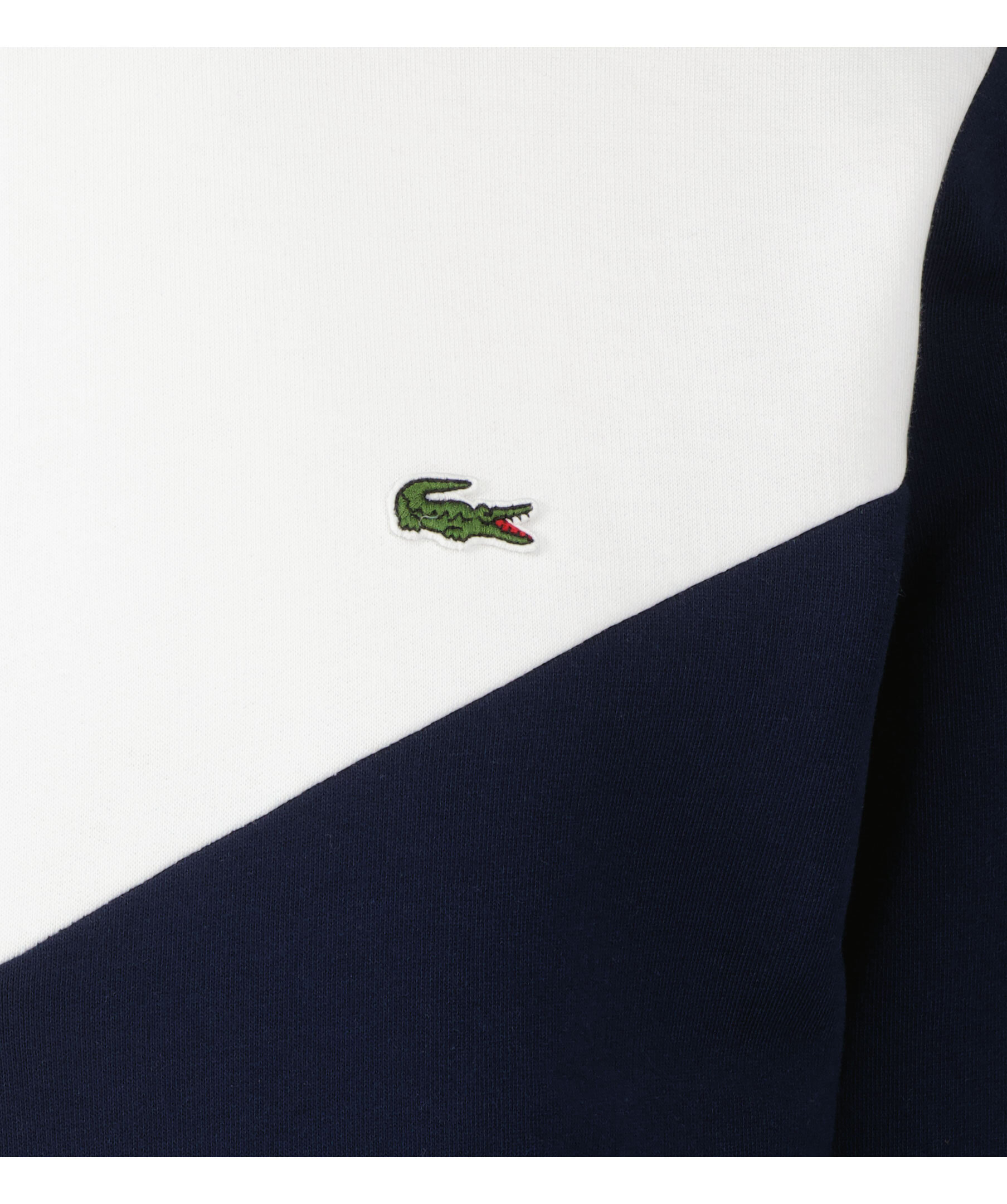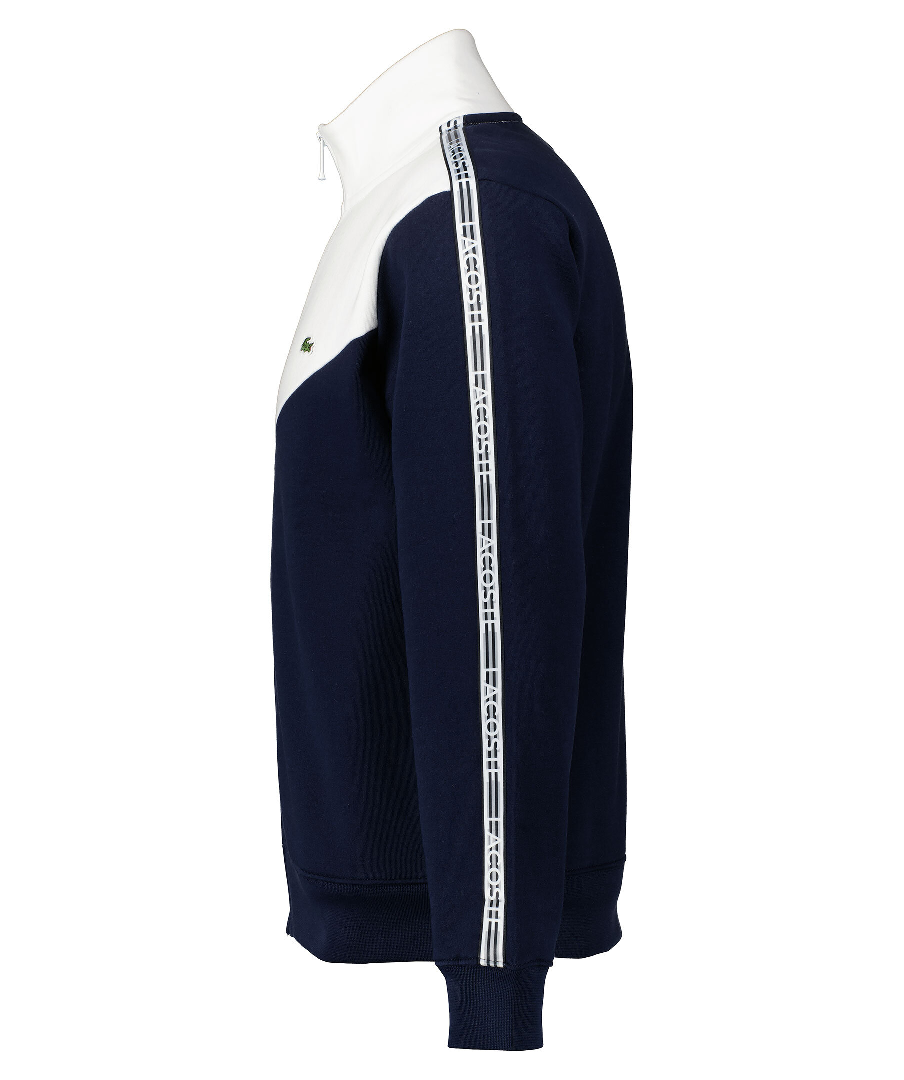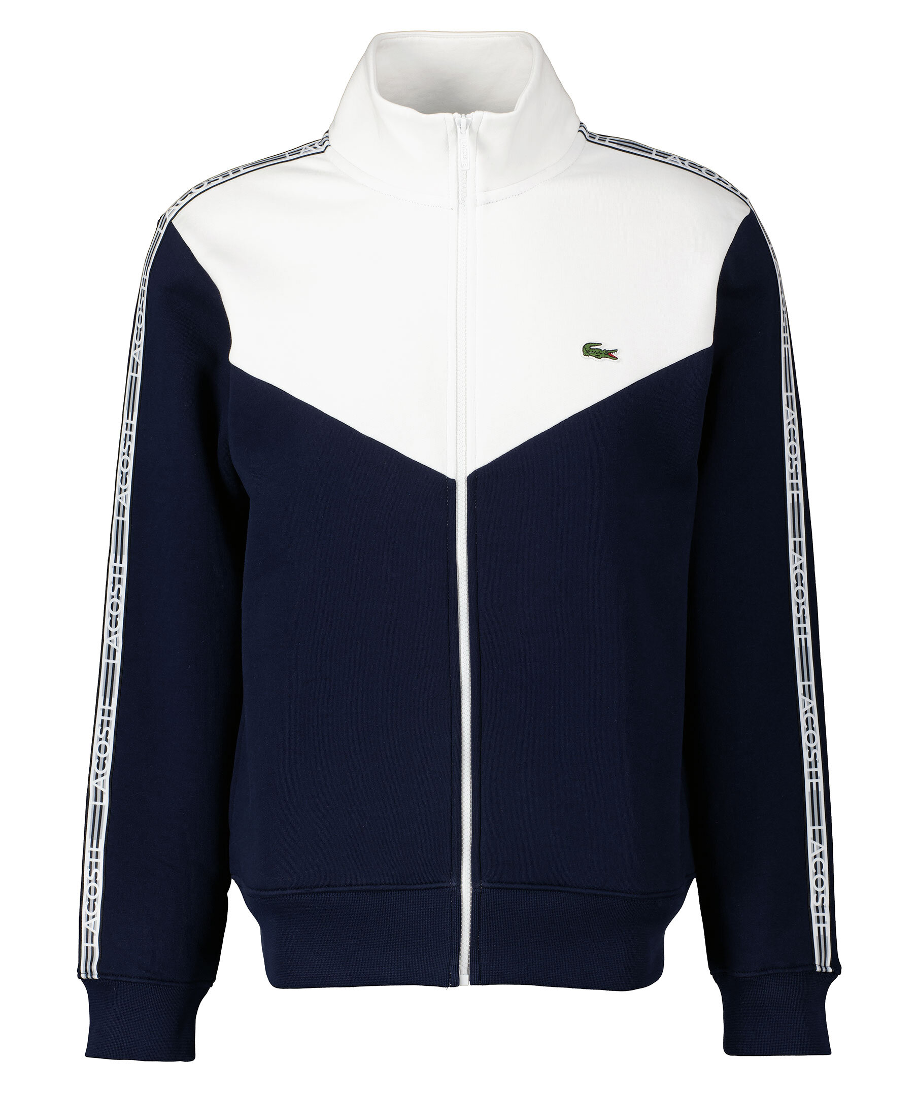 Marinblå tracksuitjacka från Lacoste. Vita revärer längst ärmarna med logotyper på och vitt block upptill. Stängs framtill med tvåvägsdragkedja, har två fickor framtill och broderad krokodil på vänster bröst. Ribbstickade muddar vid kragen, ärm- och plaggslut.