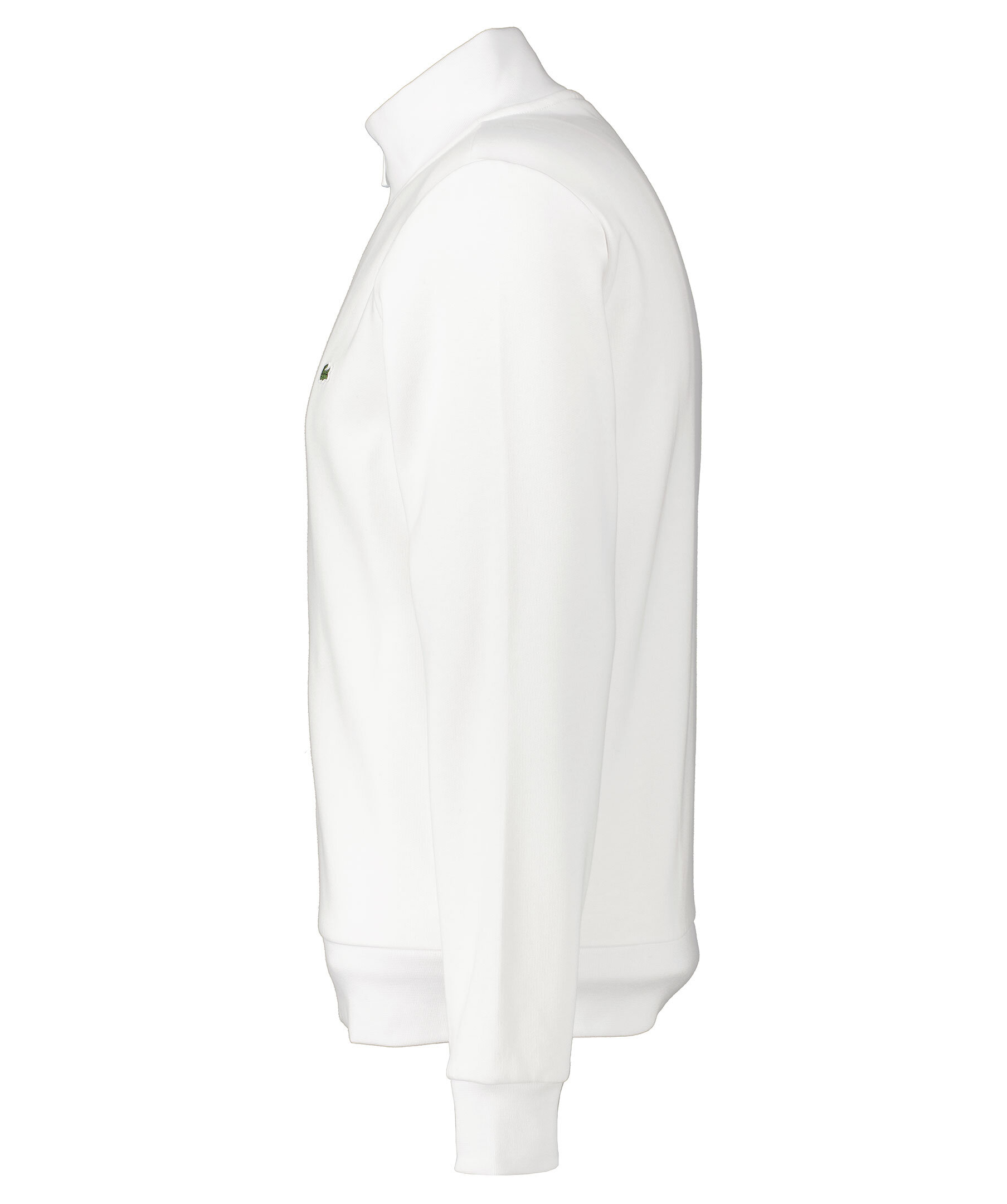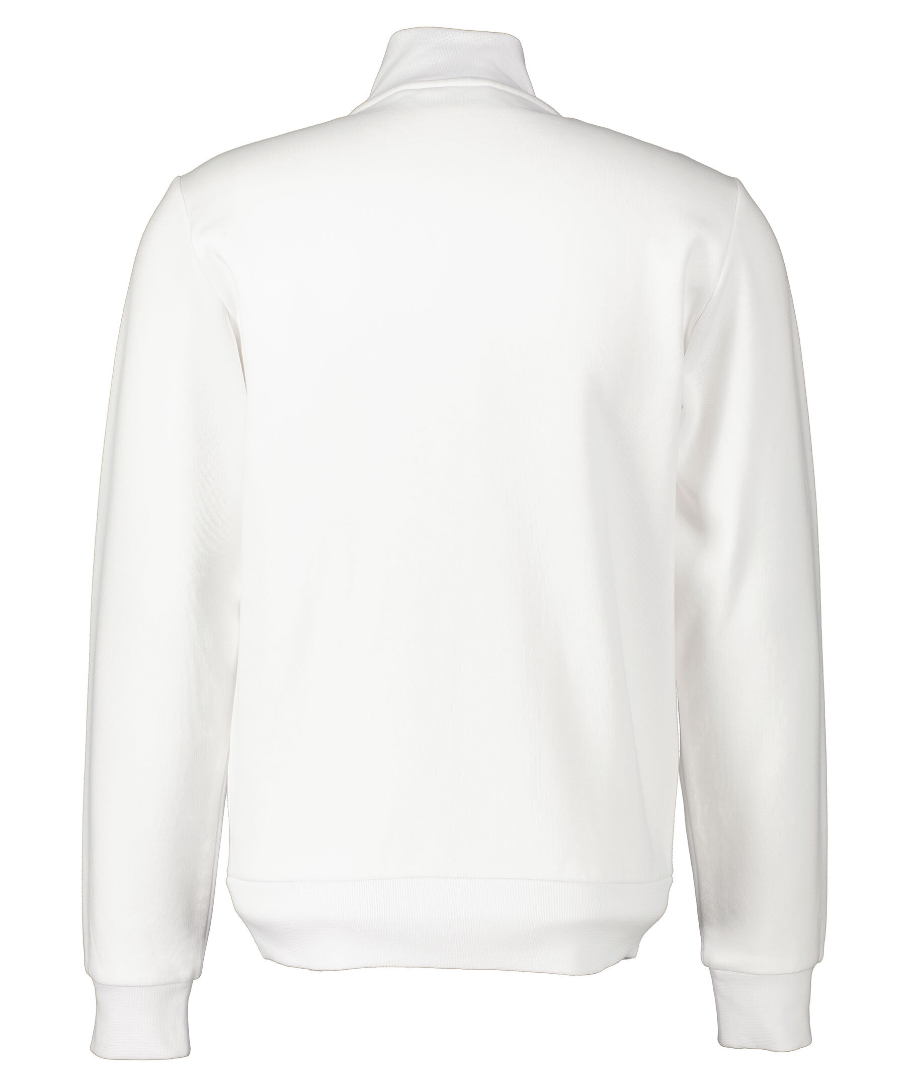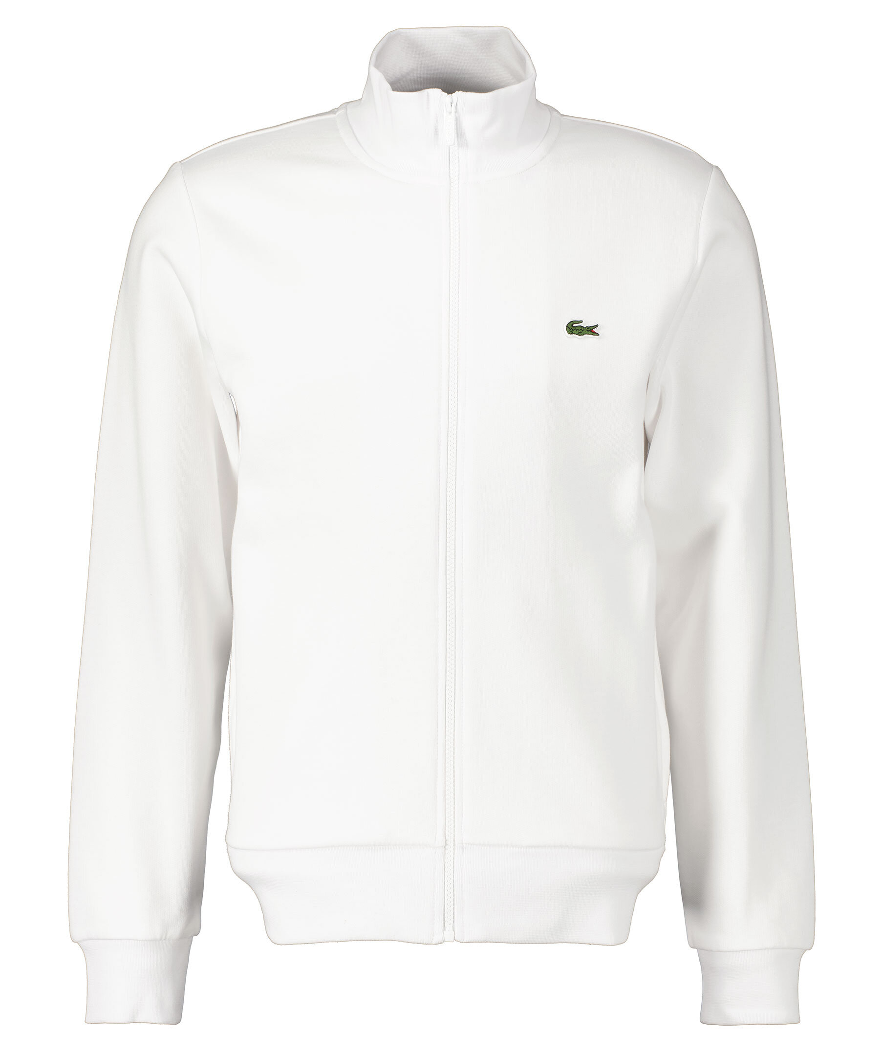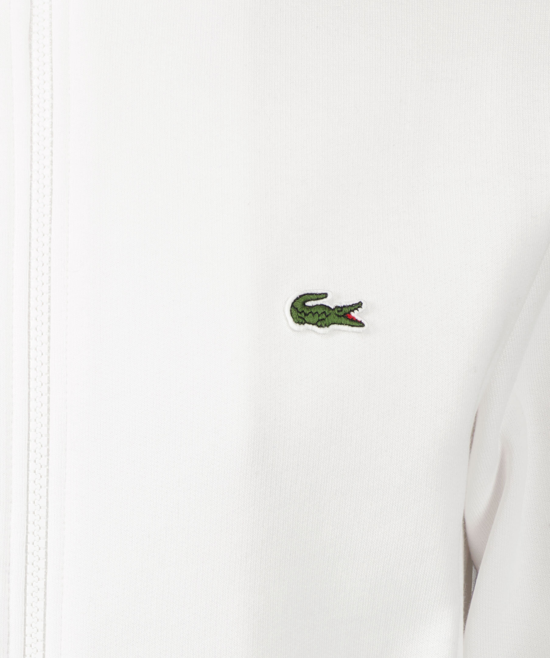 Vit, tracksuitjacka från Lacoste. Tröjan stängs framtill med dragkedja och har två fickor framtill. Broderad krokodil på vänster bröst. Ribbstickade muddar vid kragen, ärm- och plaggslut.