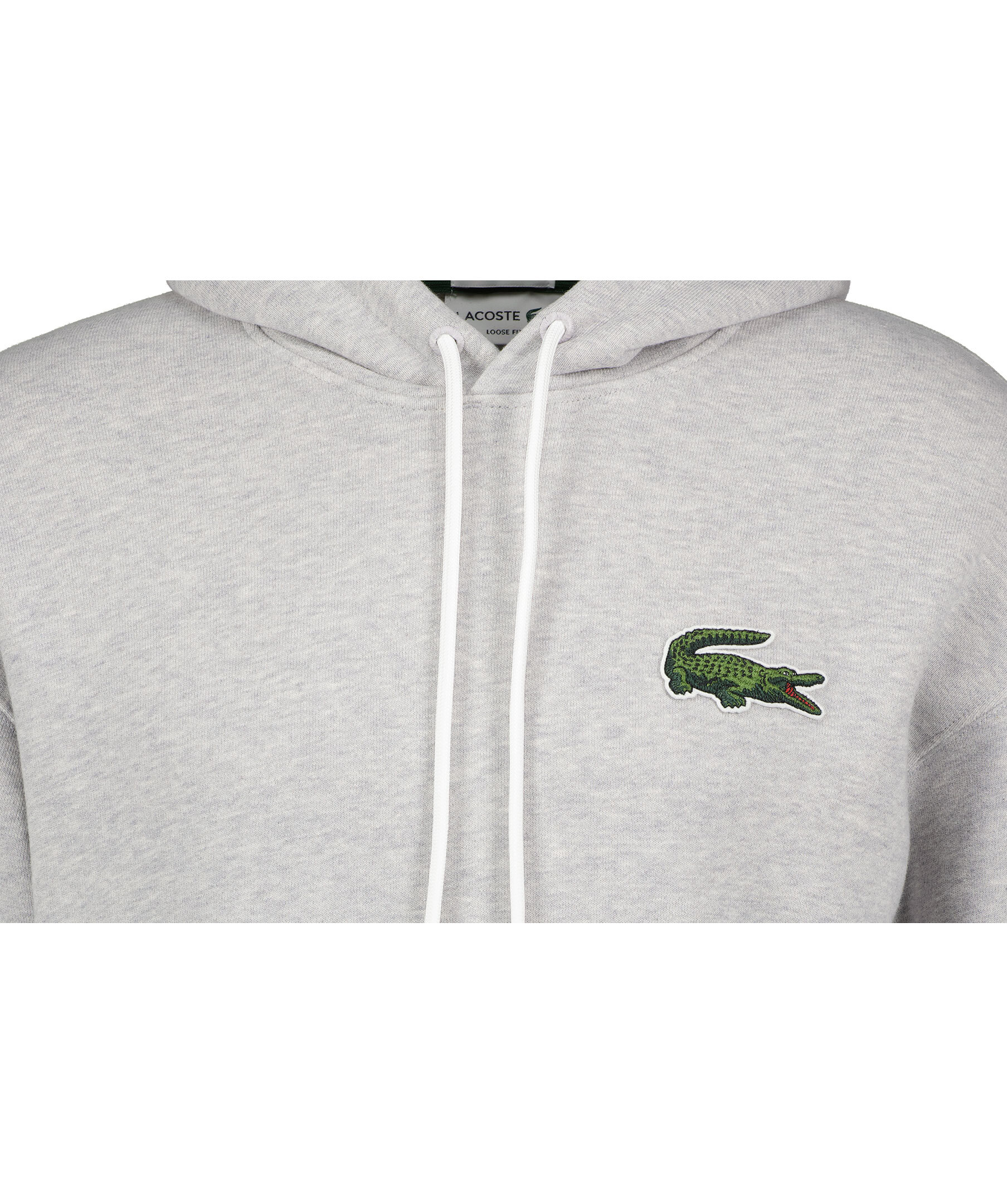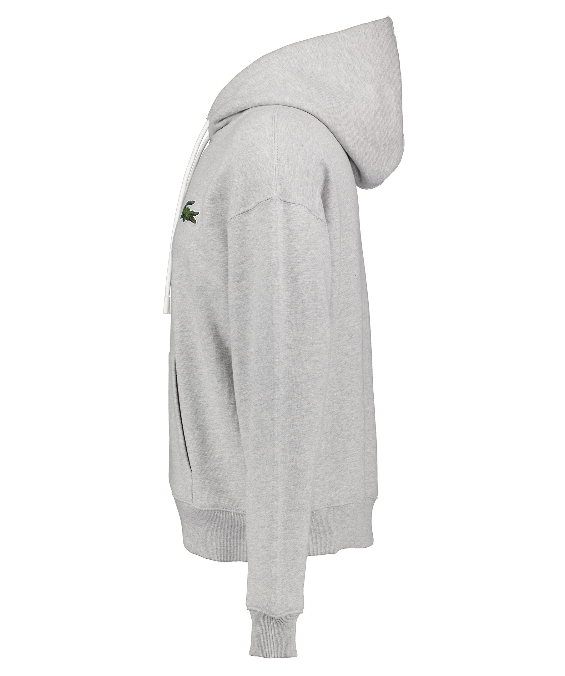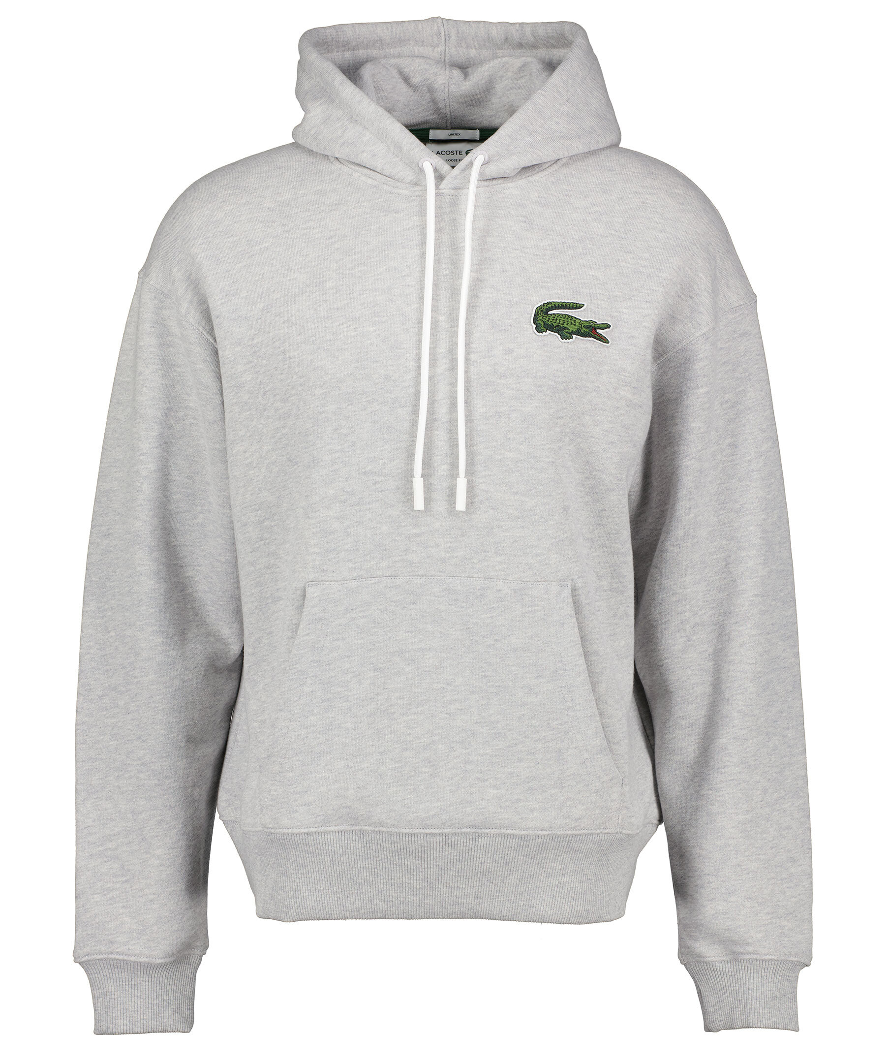 Ljus grå hoodie med loose fit från Lacoste. Luva med dragsko och ribbstickade muddar vid ärm och plaggslut. Broderad krokodil logotyp vid bröstet. Känguru ficka på magen. Tillverkad av 100% bomull.
