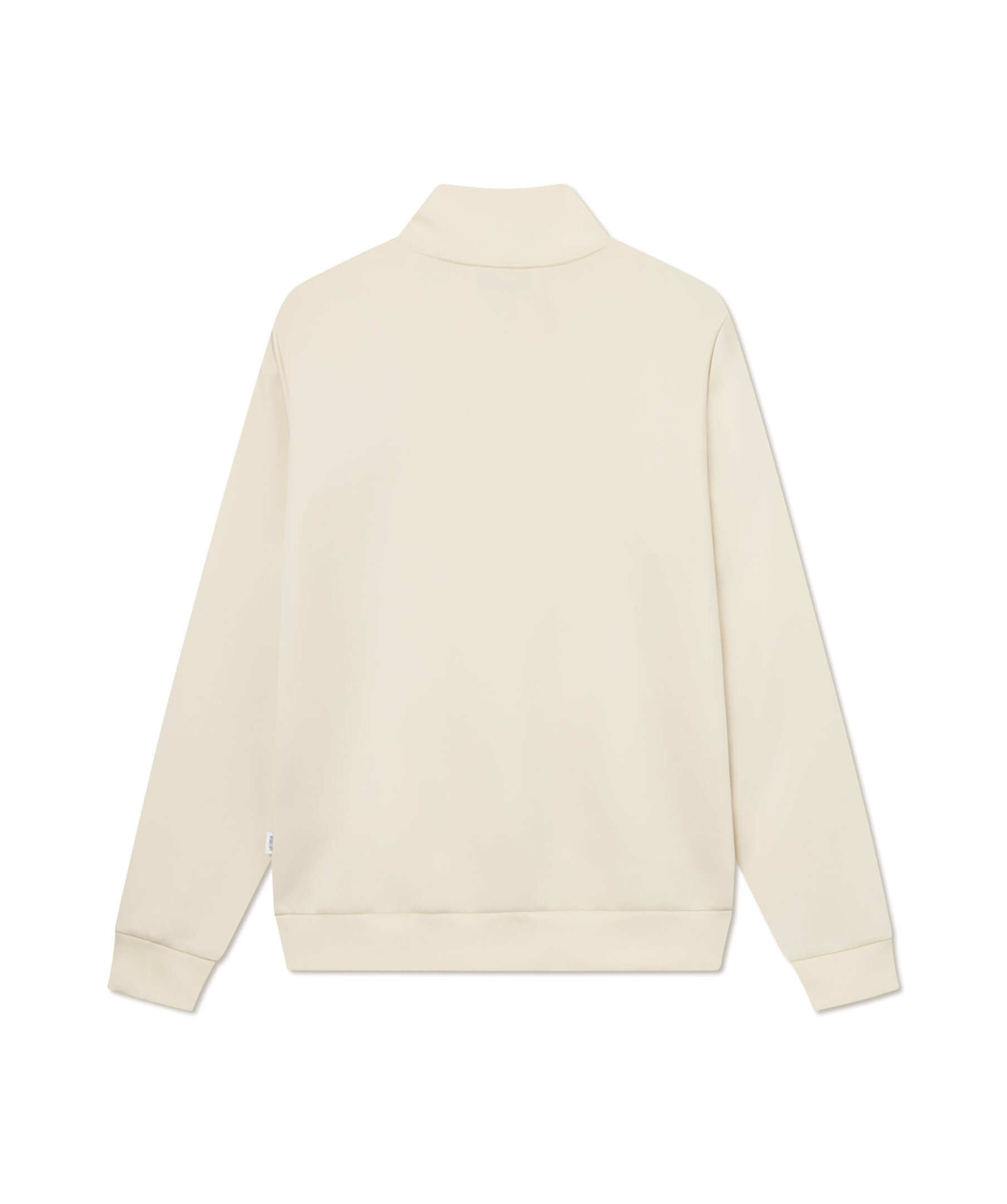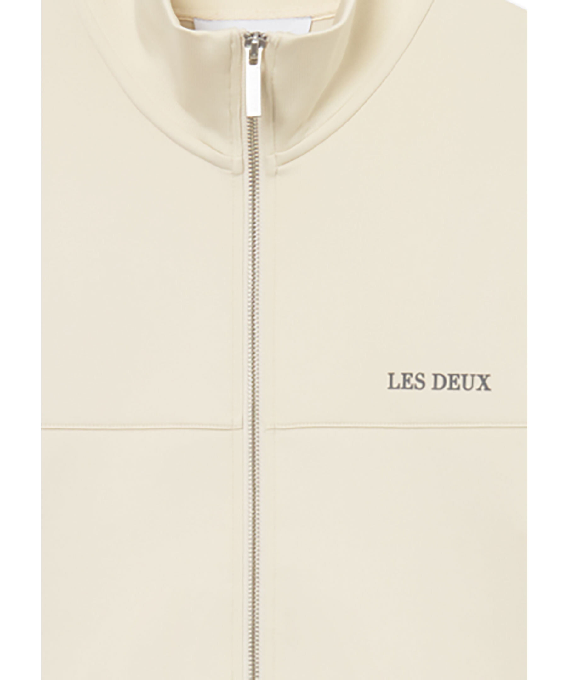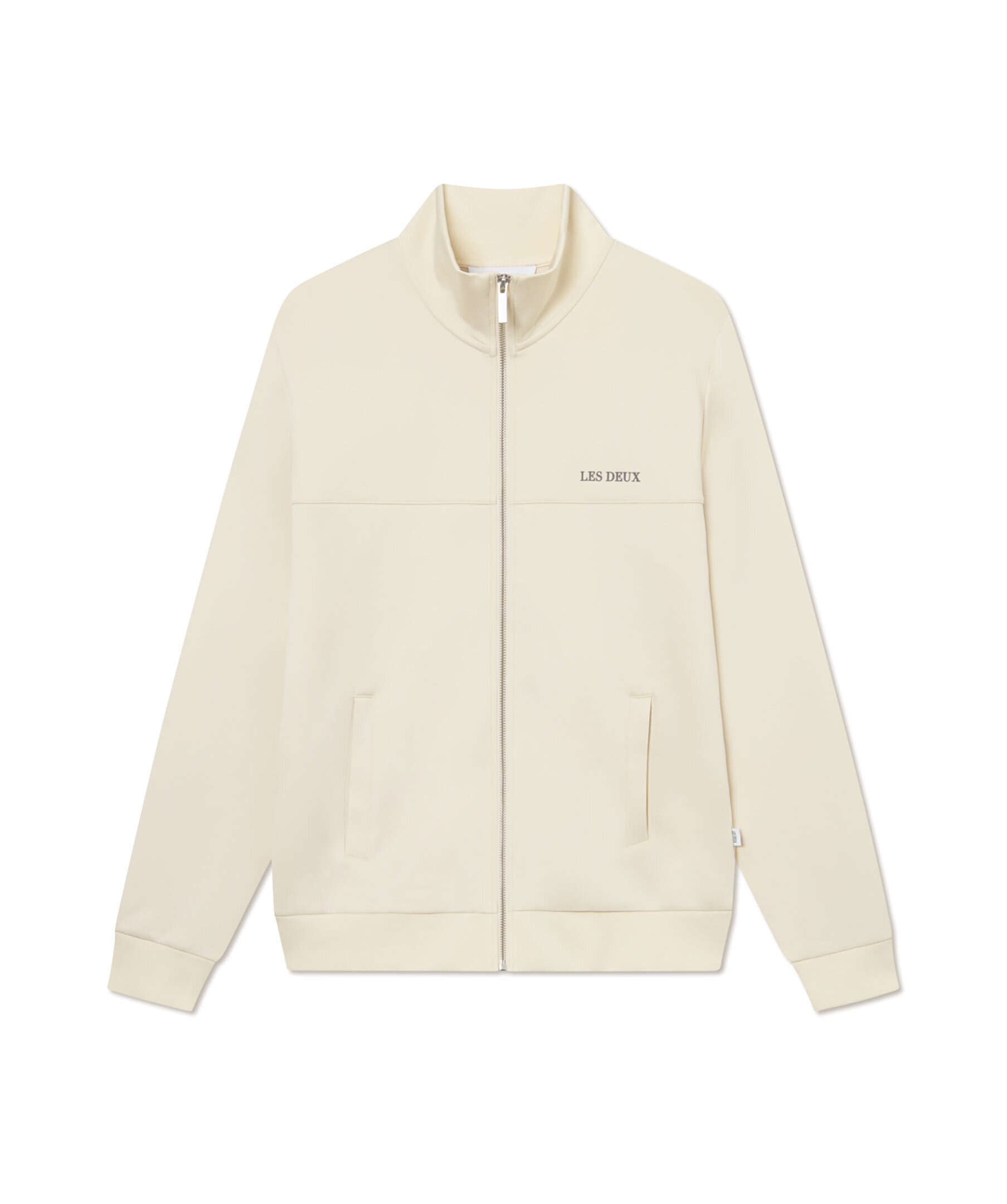 Krämvit träningsjacka från Les Deux. Jackan stängs med dragkedja framtill och har trattformad krage, två fickor på sidan, ribbstickade muddar och logotyp på vänster bröst. Tillverkad i en polyesterblandning.