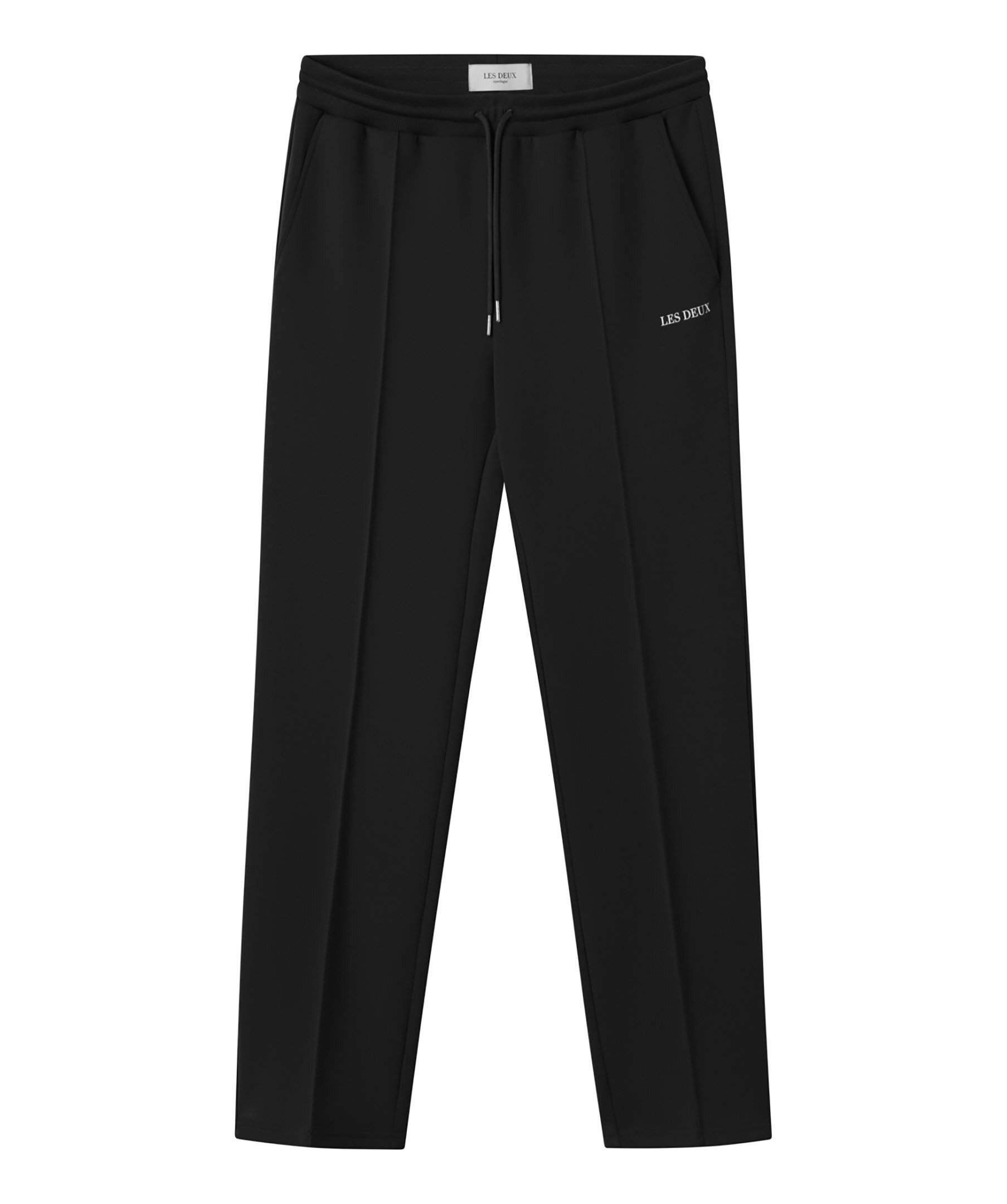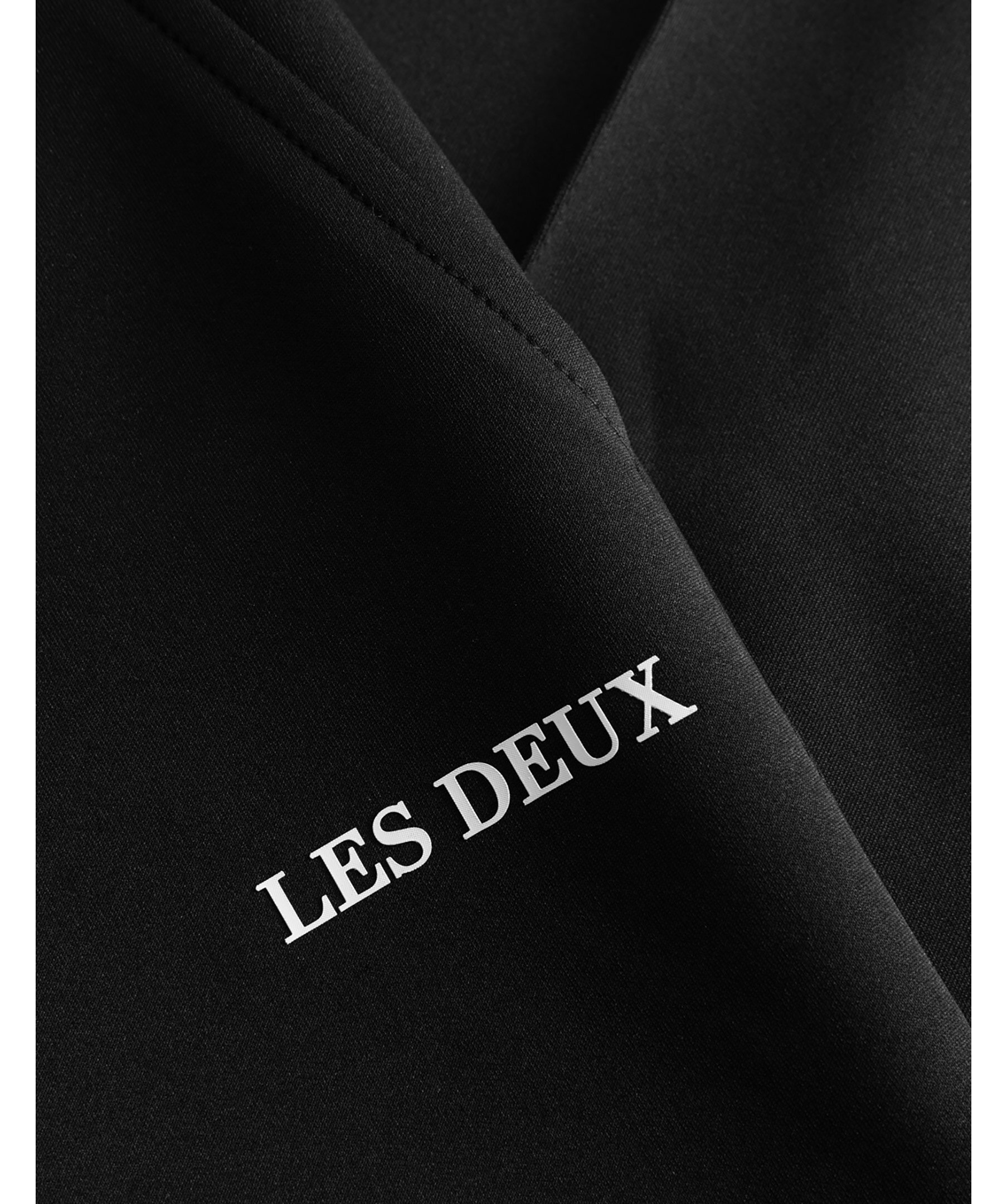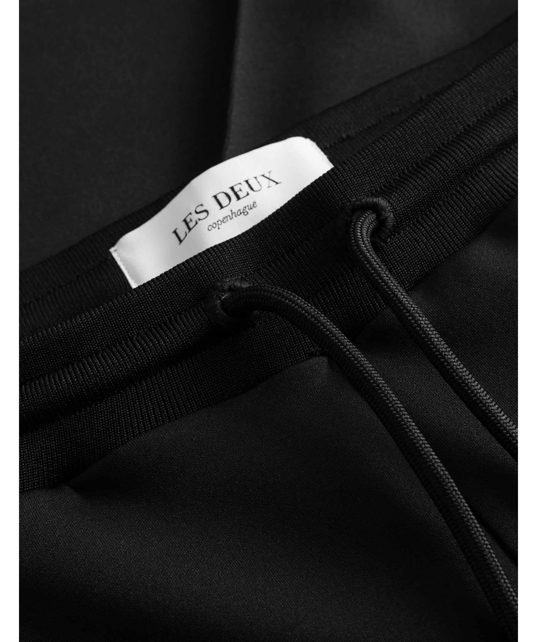 Svarta mjukisbyxor med stil som en kostymbyxa från Les Deux Ballier-kollektion. Mjukat material och lodräta veck i kostymstil fram och bak. Slimmad passform, märkesbokstäver i gummi på låret, elastisk dragsko i midjan och sidofickor.