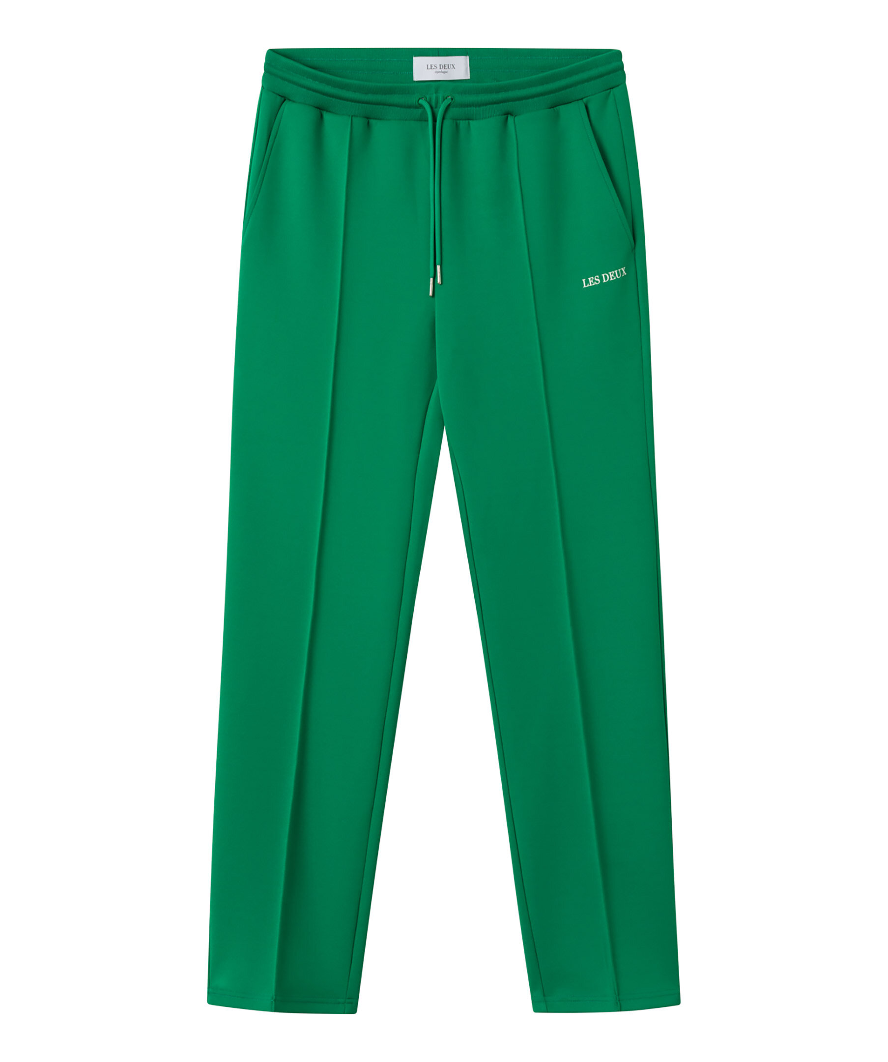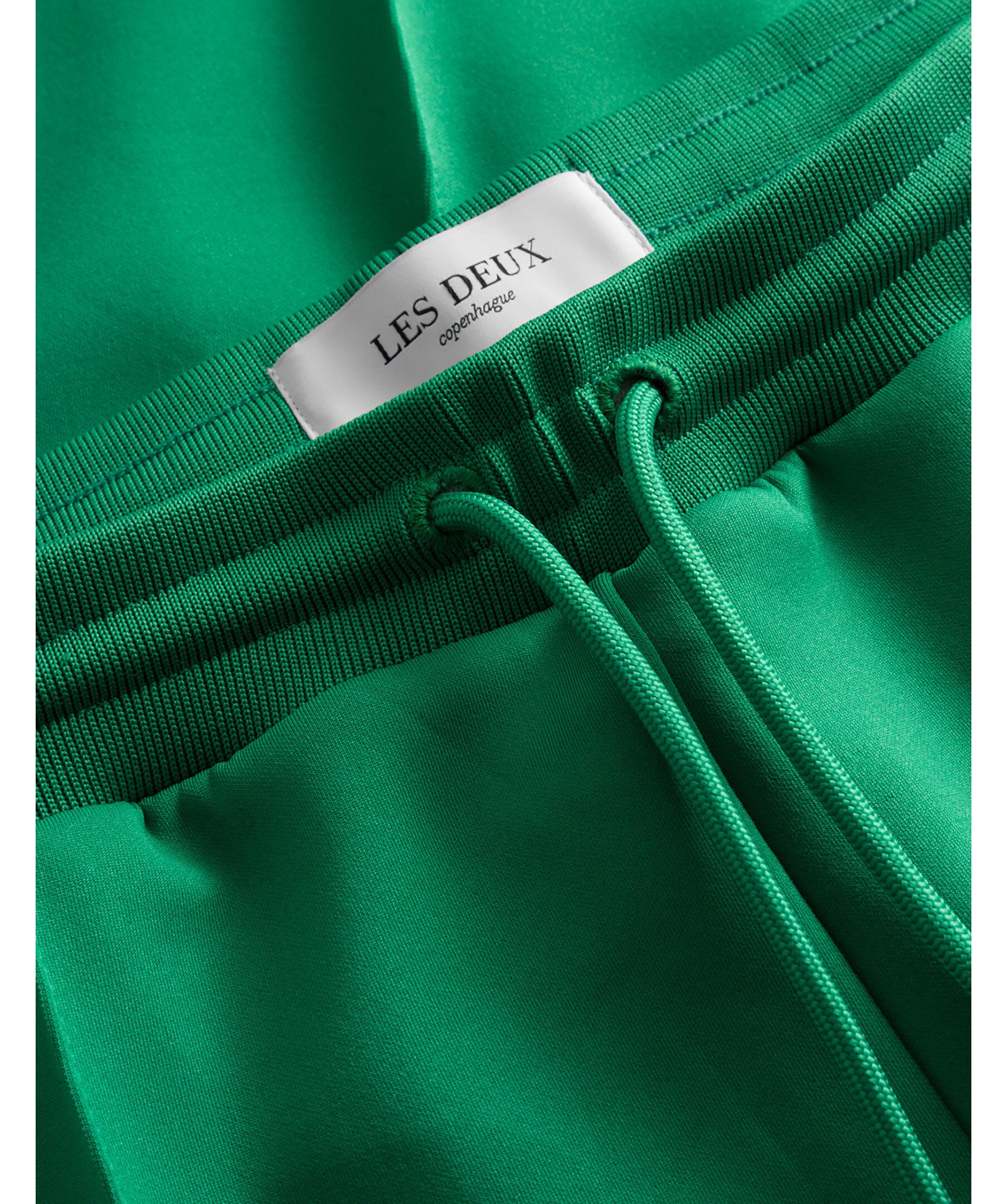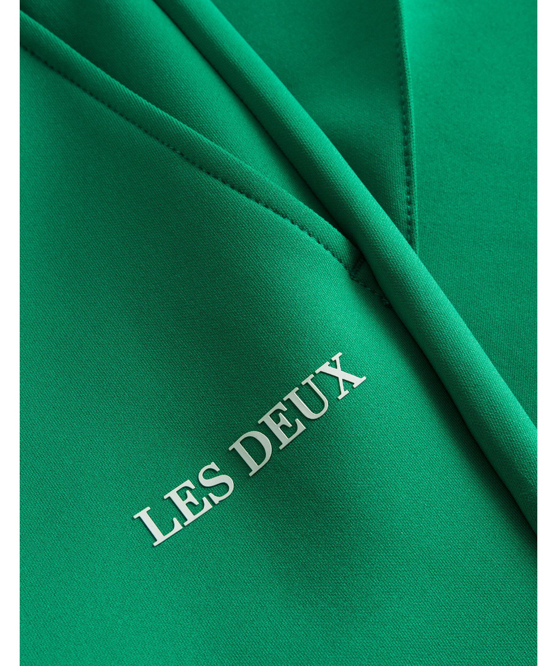 Gröna mjukisbyxor med stil som en kostymbyxa från Les Deux Ballier-kollektion. Mjukat material och lodräta veck i kostymstil fram och bak. Slimmad passform, märkesbokstäver i gummi på låret, elastisk dragsko i midjan och sidofickor.