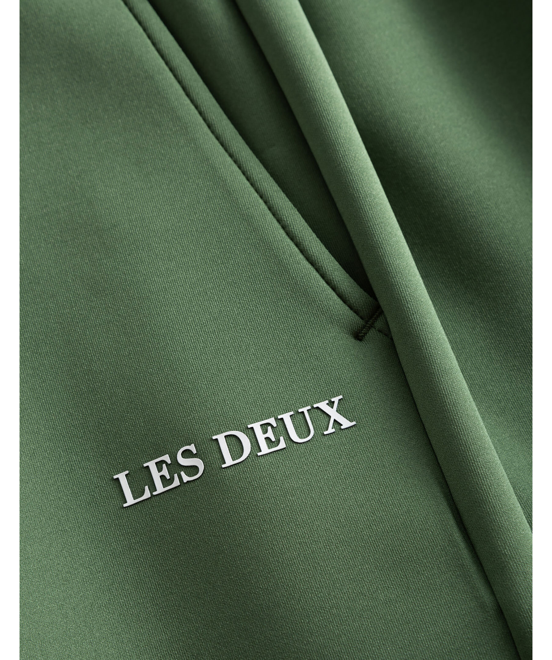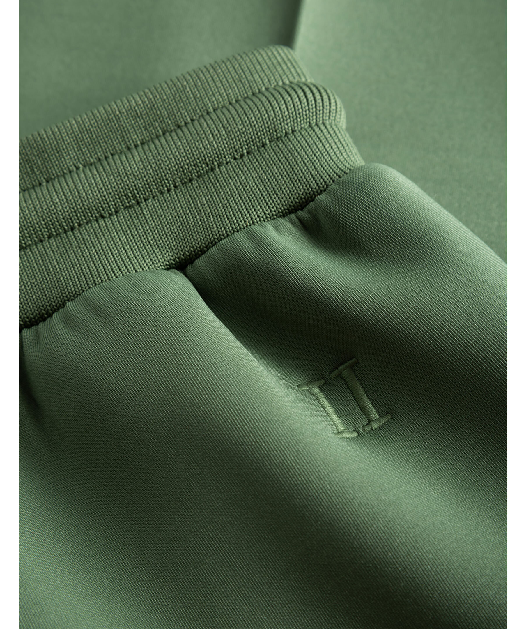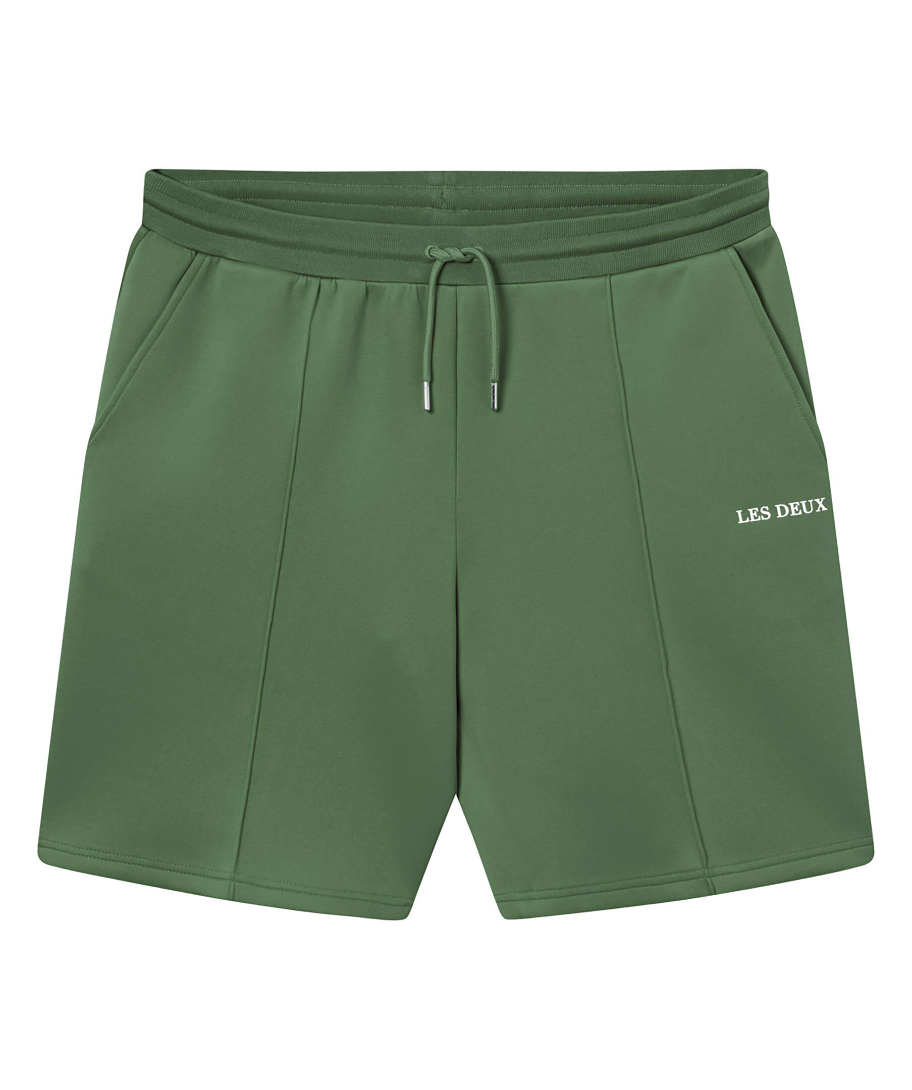 Gröna mjukisshorts med dressad stil från Les Deux Ballier-kollektion. Mjukat material och lodräta veck i kostymstil fram och bak. Slimmad passform, logotyp i gummi på låret, elastisk dragsko i midjan och sidofickor.