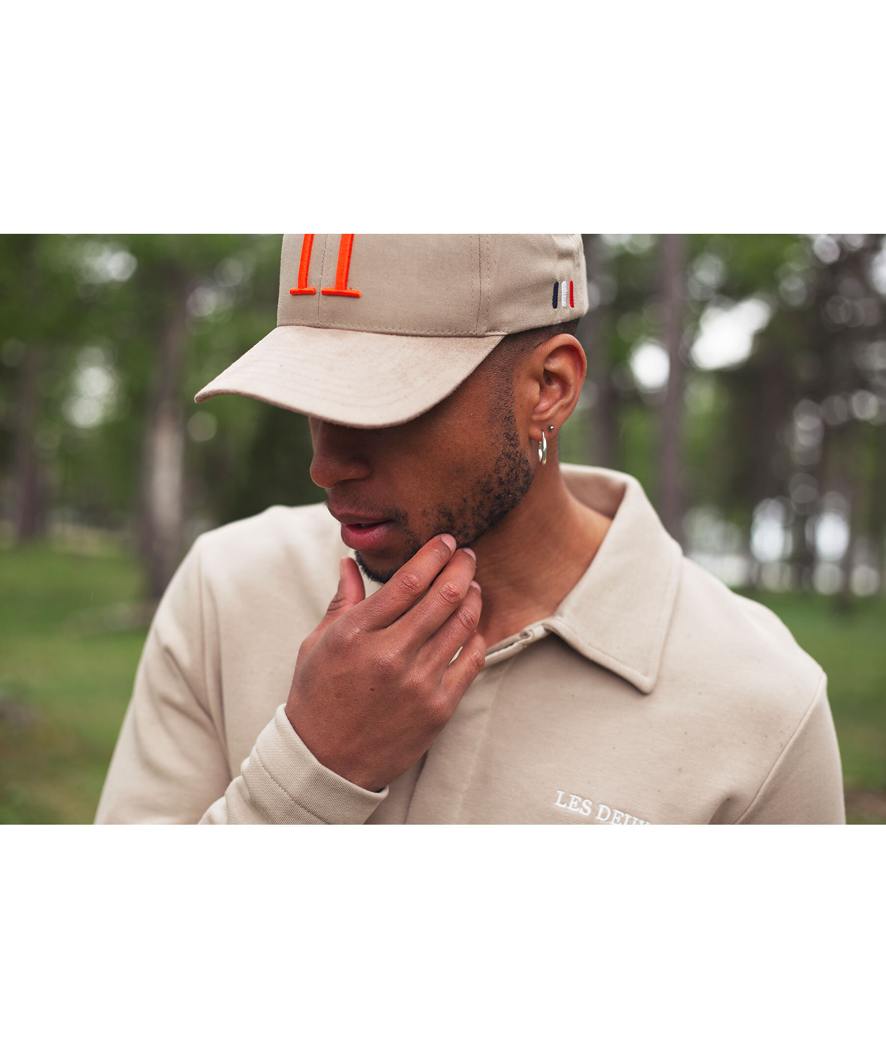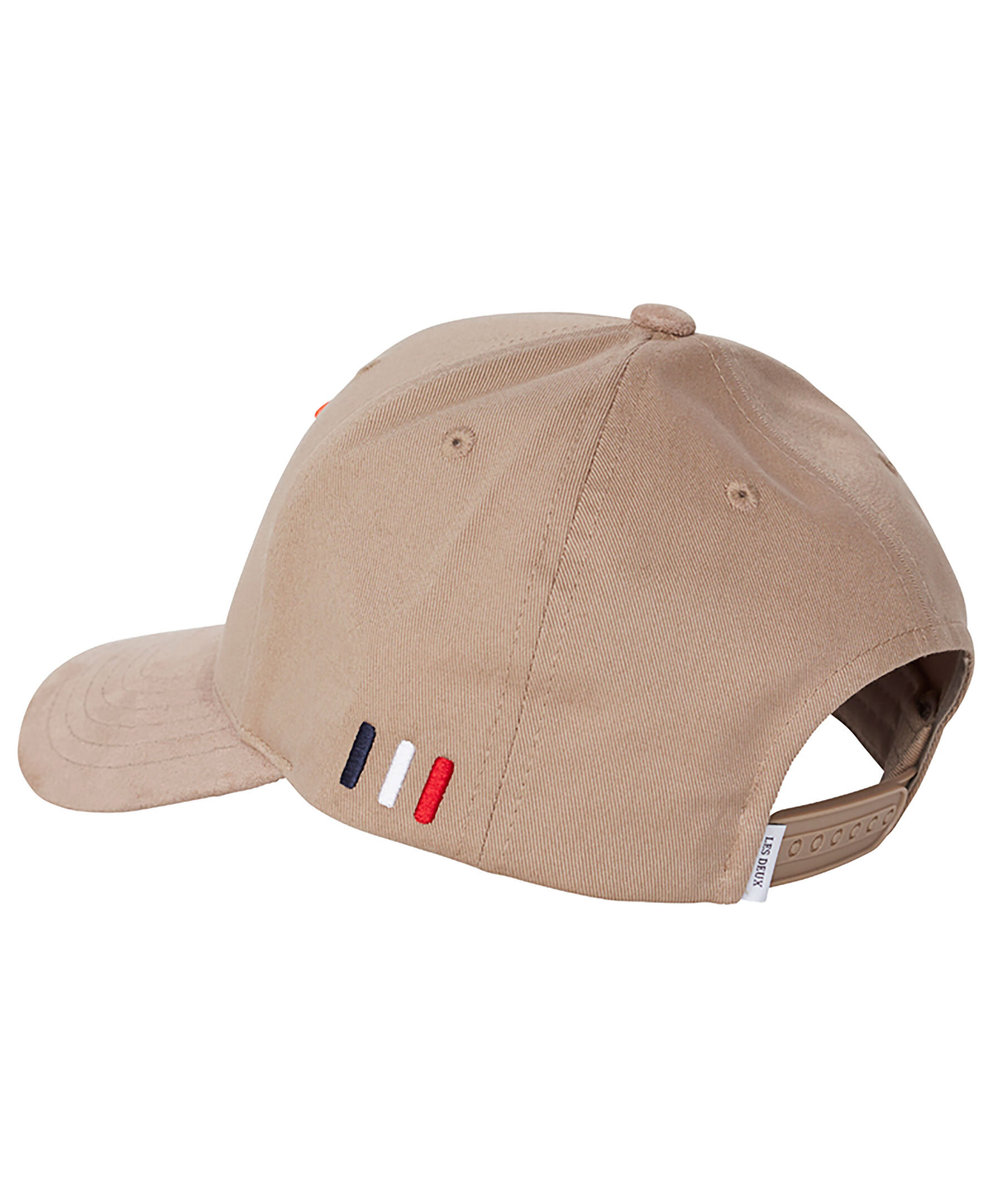 Beige keps från Les Deux med broderad, orange logotyp på framsidan. Justerbart spänne bak och tre broderade streck i vitt, rött och blått på den vänstra sidan. Tillverkad i 100% bomull.