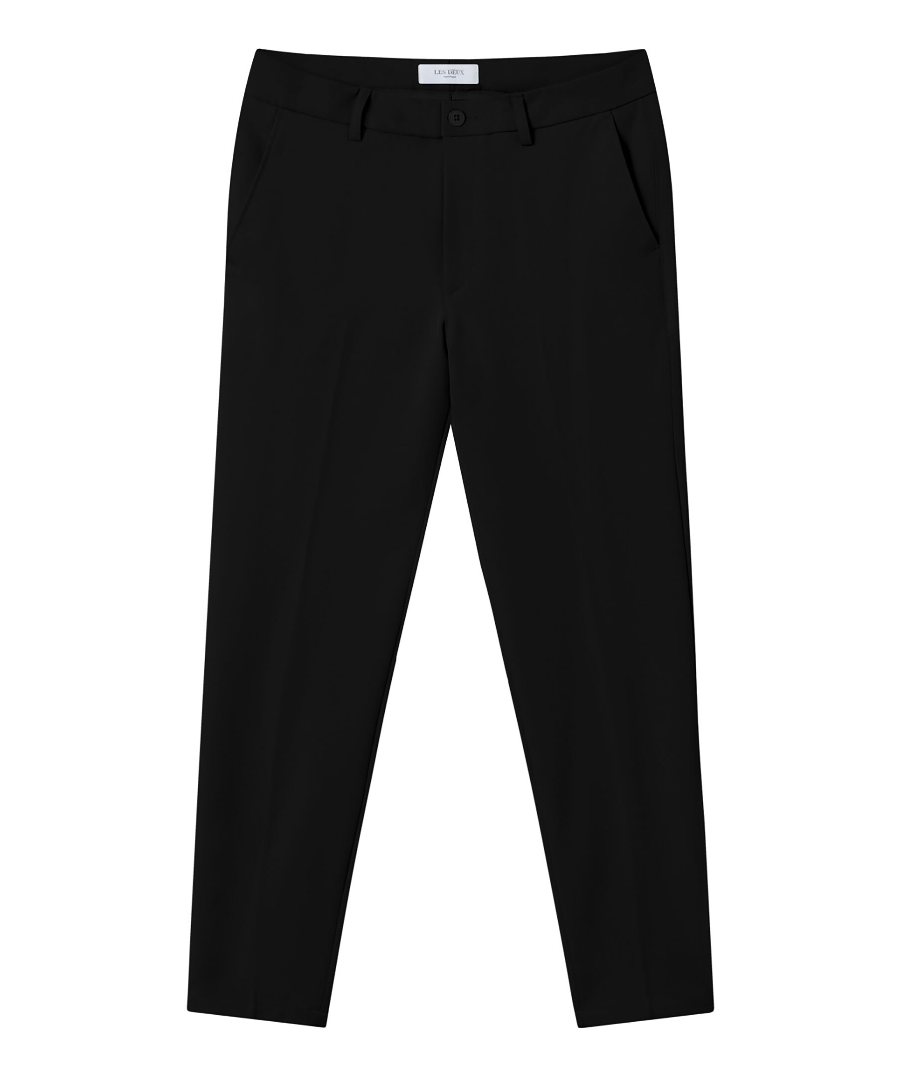 Svarta kostymbyxor från Les Deux. Regular fit modell, stretchigt material, pressveck, snedställda fickor fram, två bakfickor, stängs med dragkedja i gylfen.