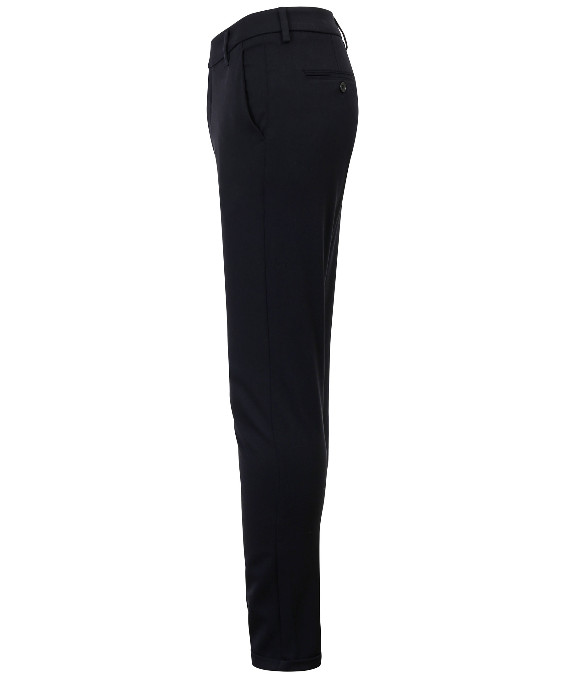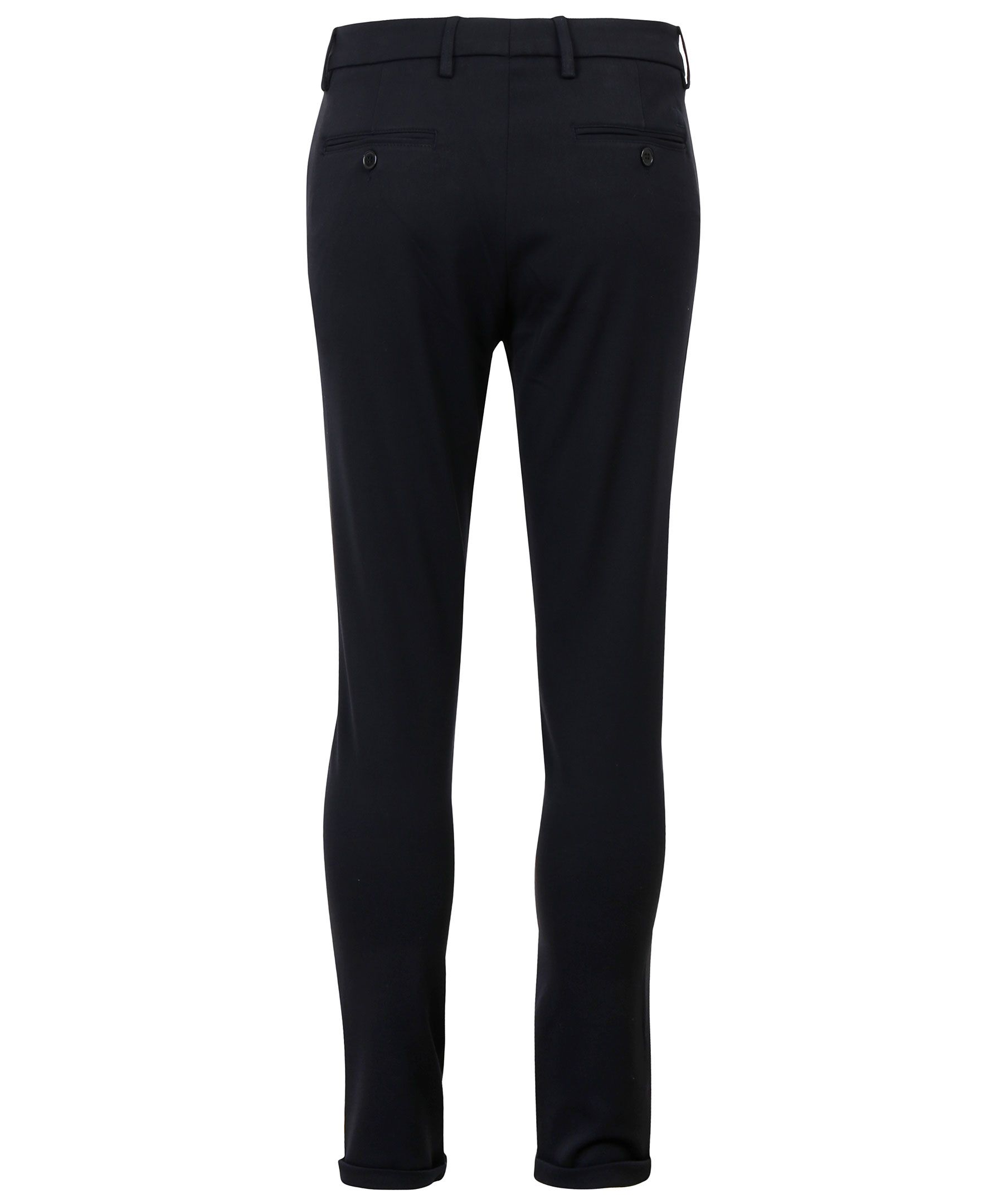 Mörkblåa slim-fit byxor från Les Deux. Stretchmaterial och en smal fotöppning med uppvikt kant. Två framfickor samt två bakfickor med knapp. Gylf med dragkedja och knappar.