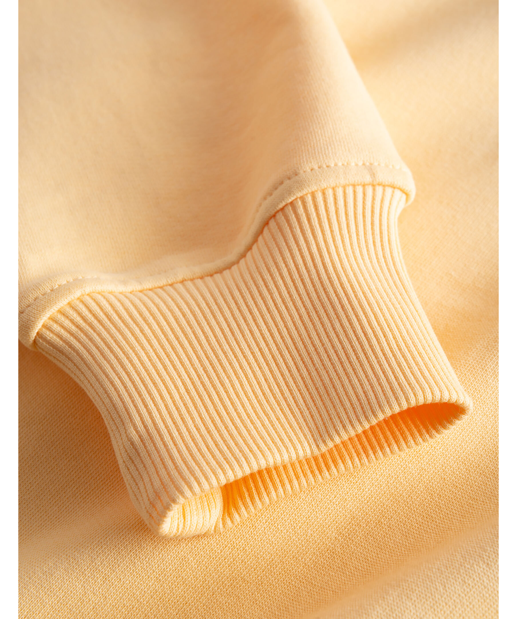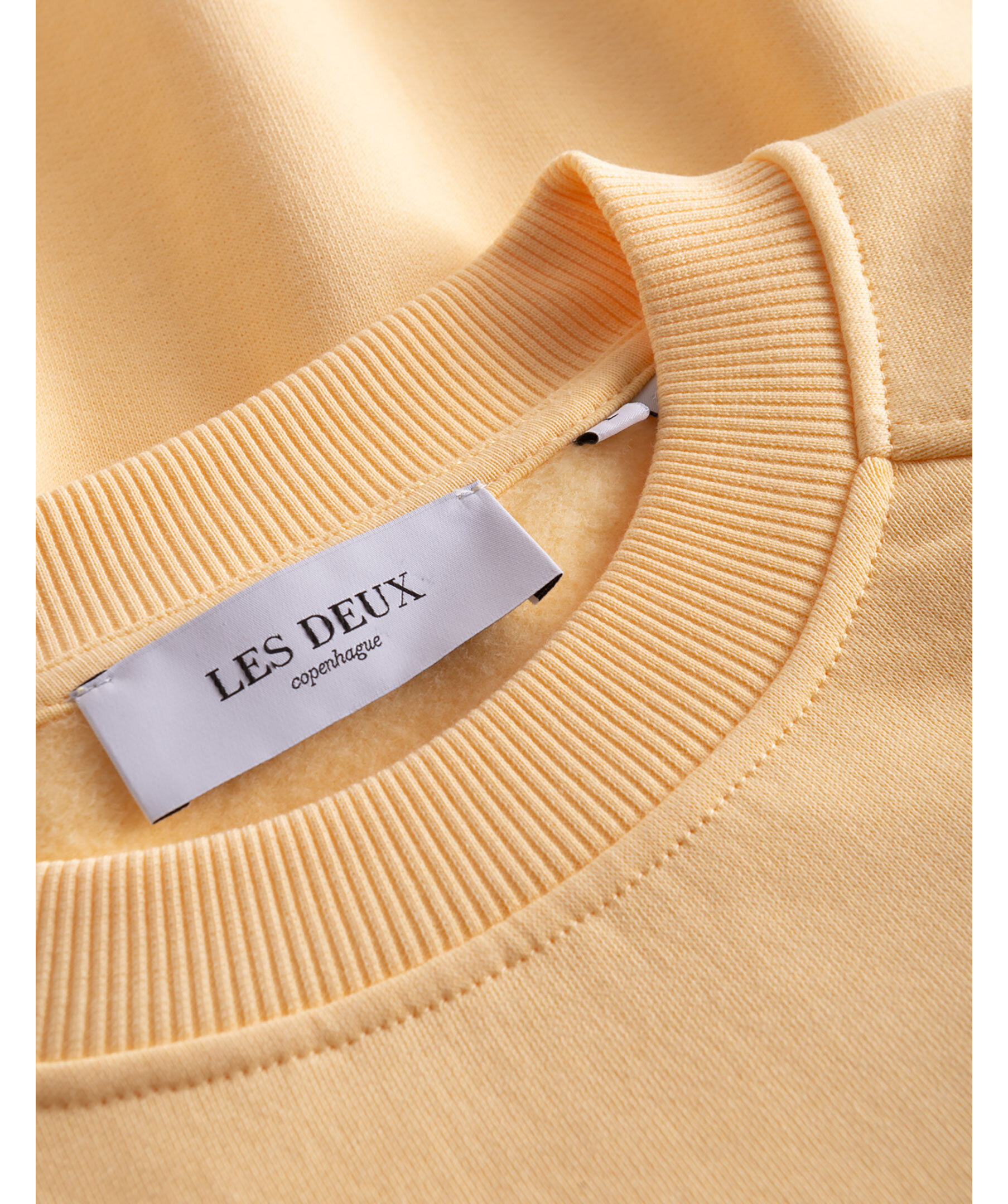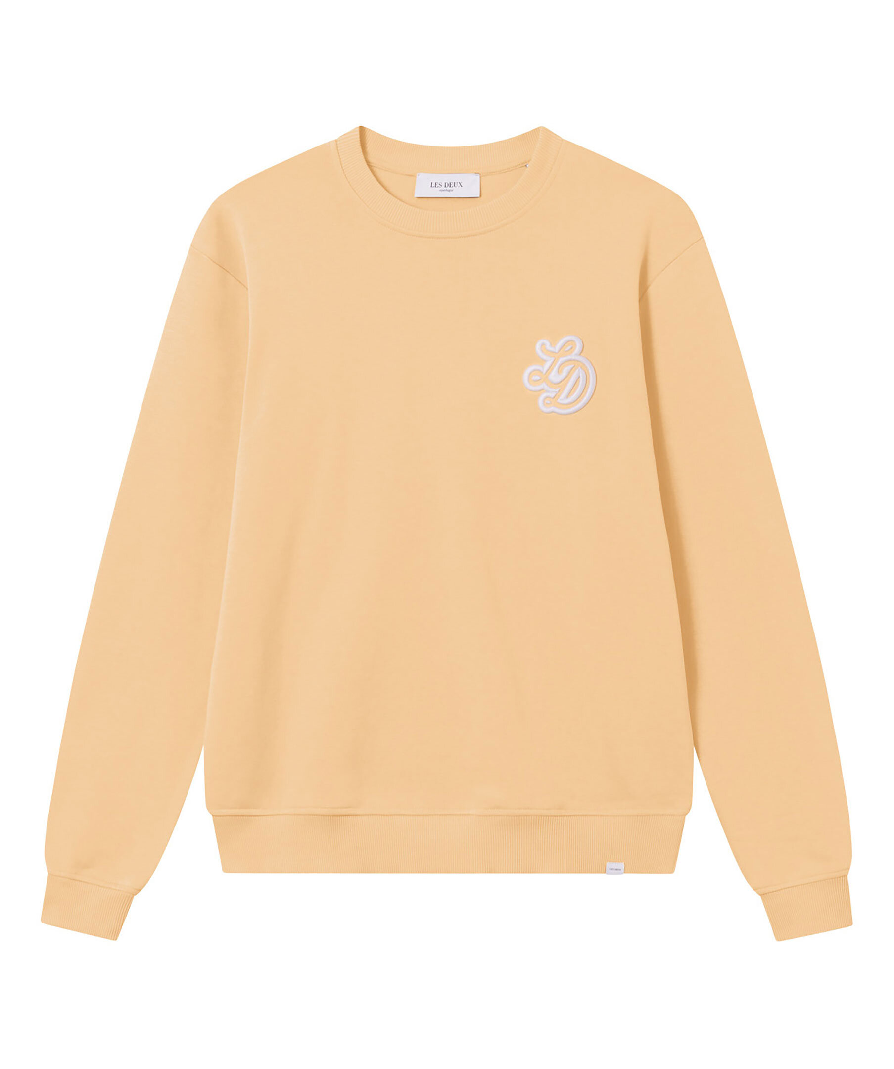 Ljusgul sweatshirt med rundad halsringning från Les Deux. Utsmyckad med kursiva Les Deux-initialer på vänster bröst och har ribbade muddar i ärmslut, vid halsringning och vid fållen. Tillverkad i 100% bomull.