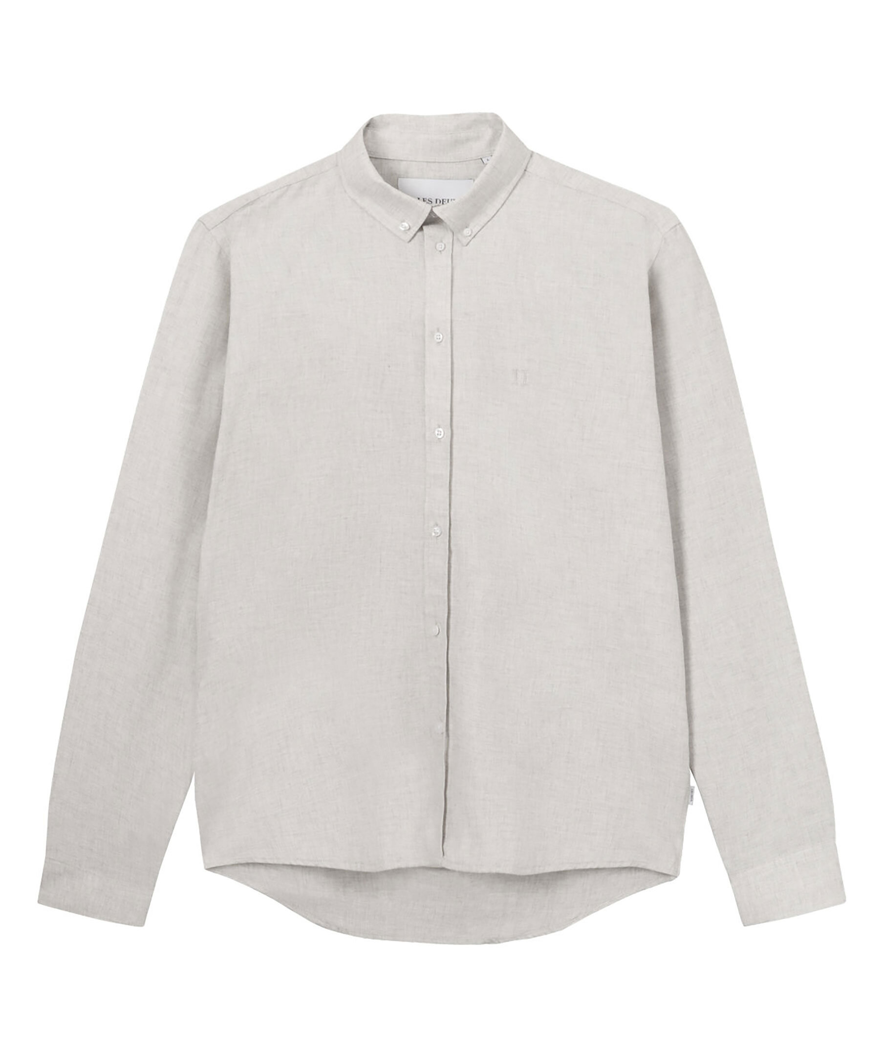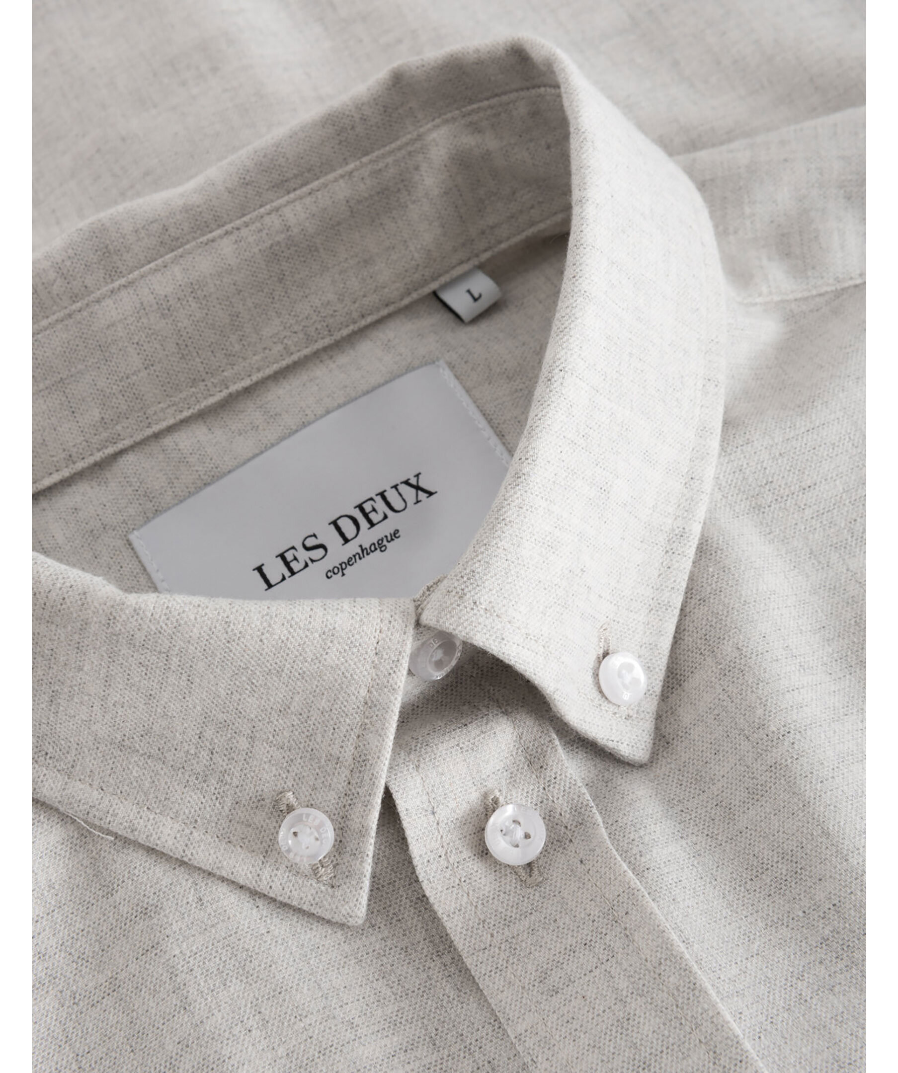 Ljusgrå melerad skjorta från Les Deux. Button-down krage. Tillverkad i 100% Ekologisk bomull. Broderad ton-i-ton logotyp på bröstet och har en något avslappnad passform.