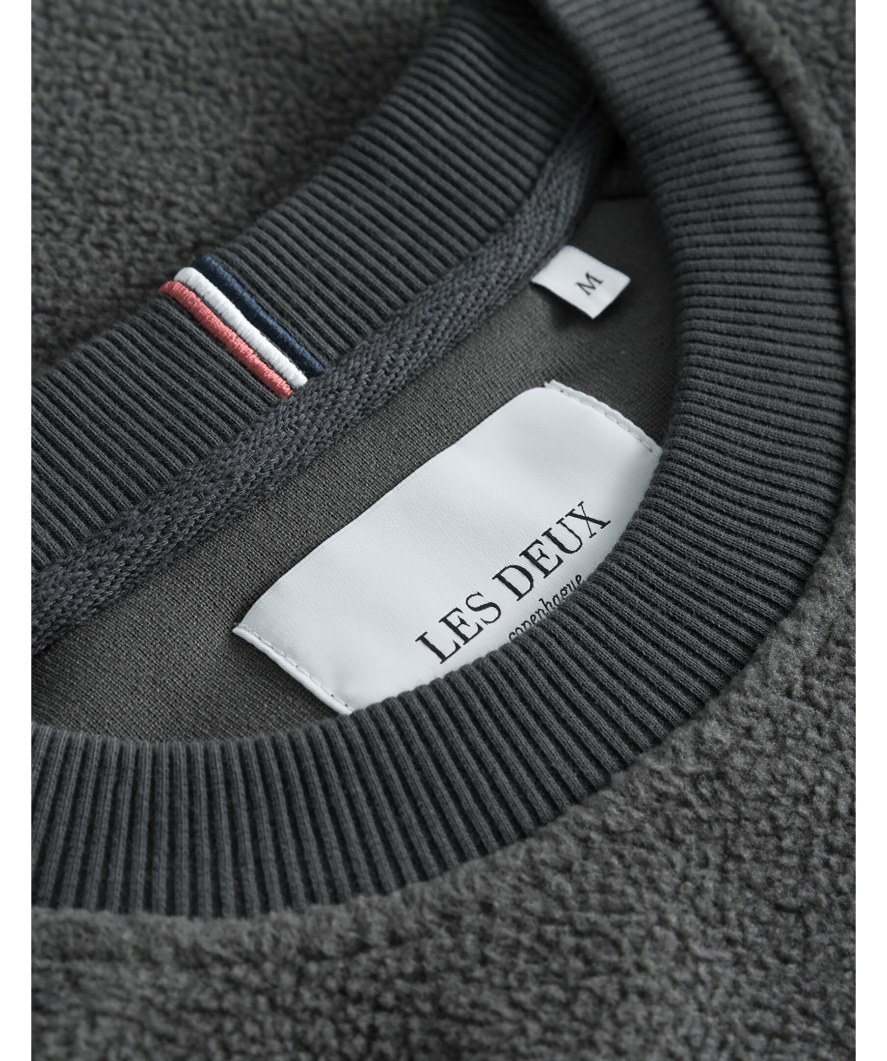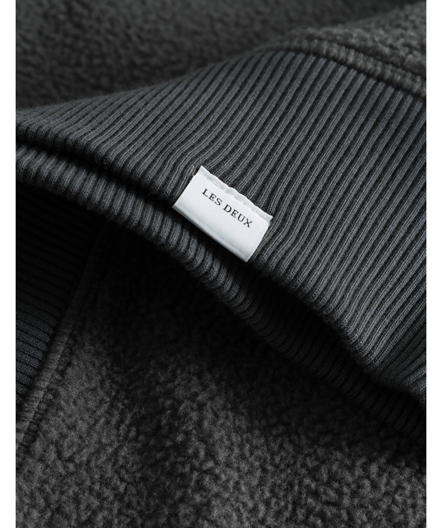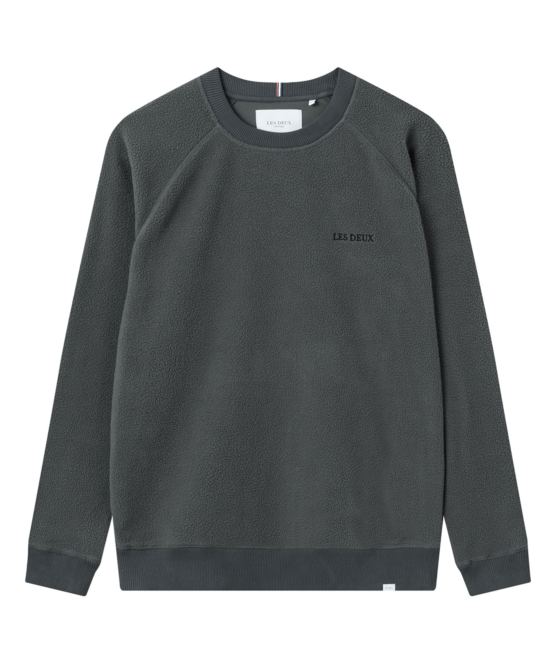 Mörkgrå sweatshirt i pilematerial från Les Deux. Ribbstickade muddar i kragen, ärm- och plaggslut. Broderad logotyp på vänster bröst.