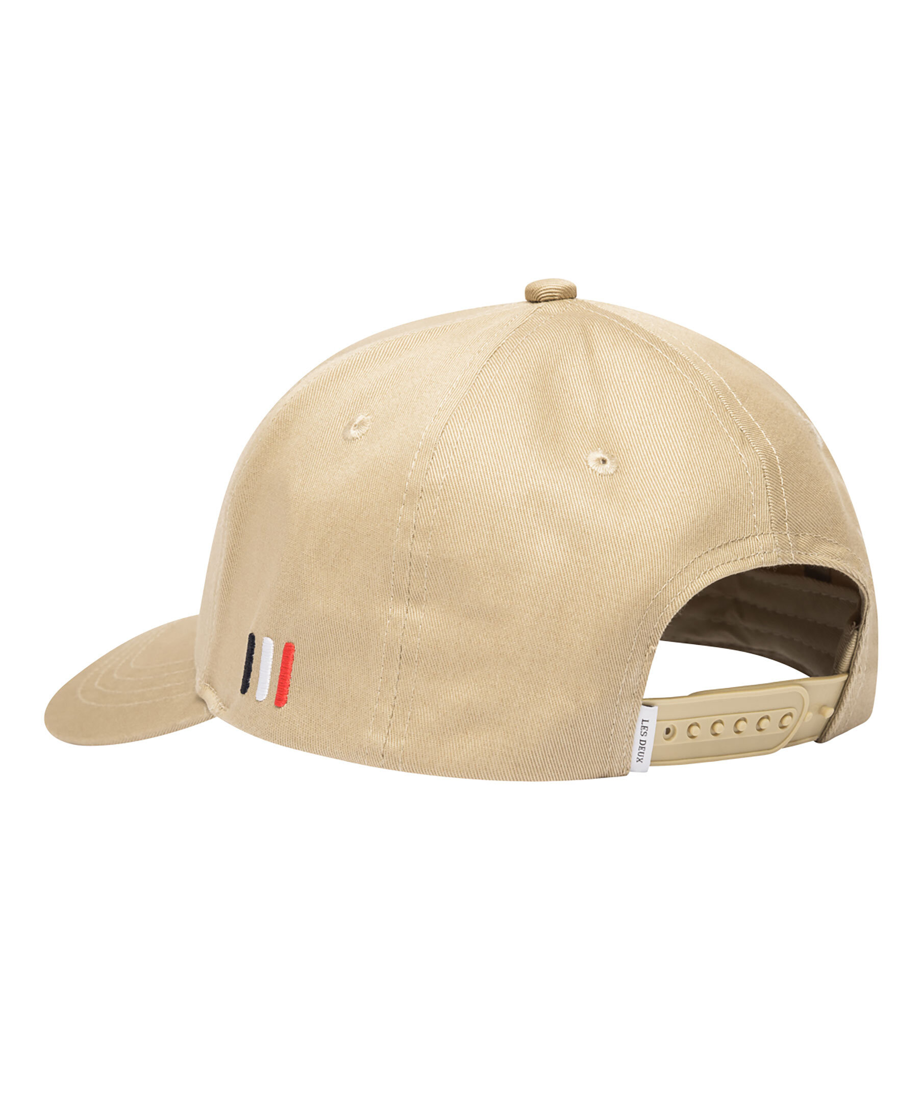Sandfärgad keps från Les Deux med broderad logotyp på framsidan. Justerbart spänne bak och tre broderade streck i vitt, rött och blått på den vänstra sidan. Tillverkad i 100% bomull.