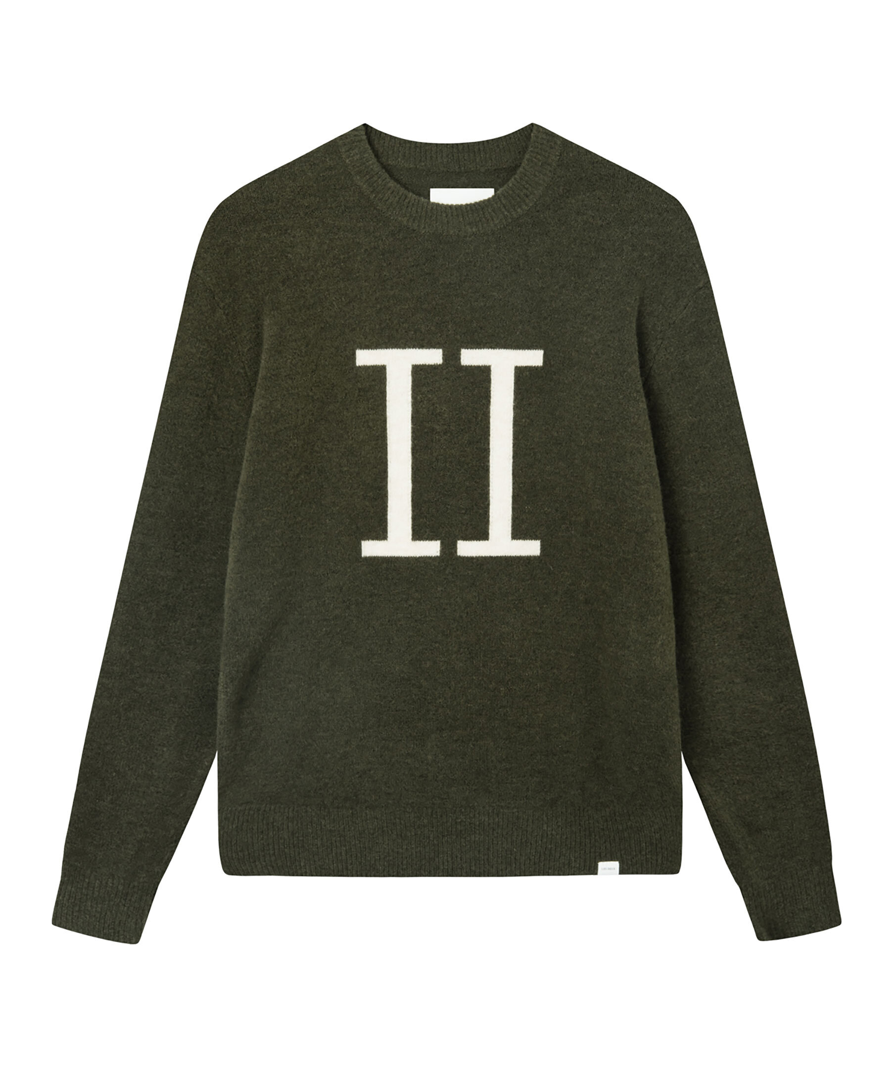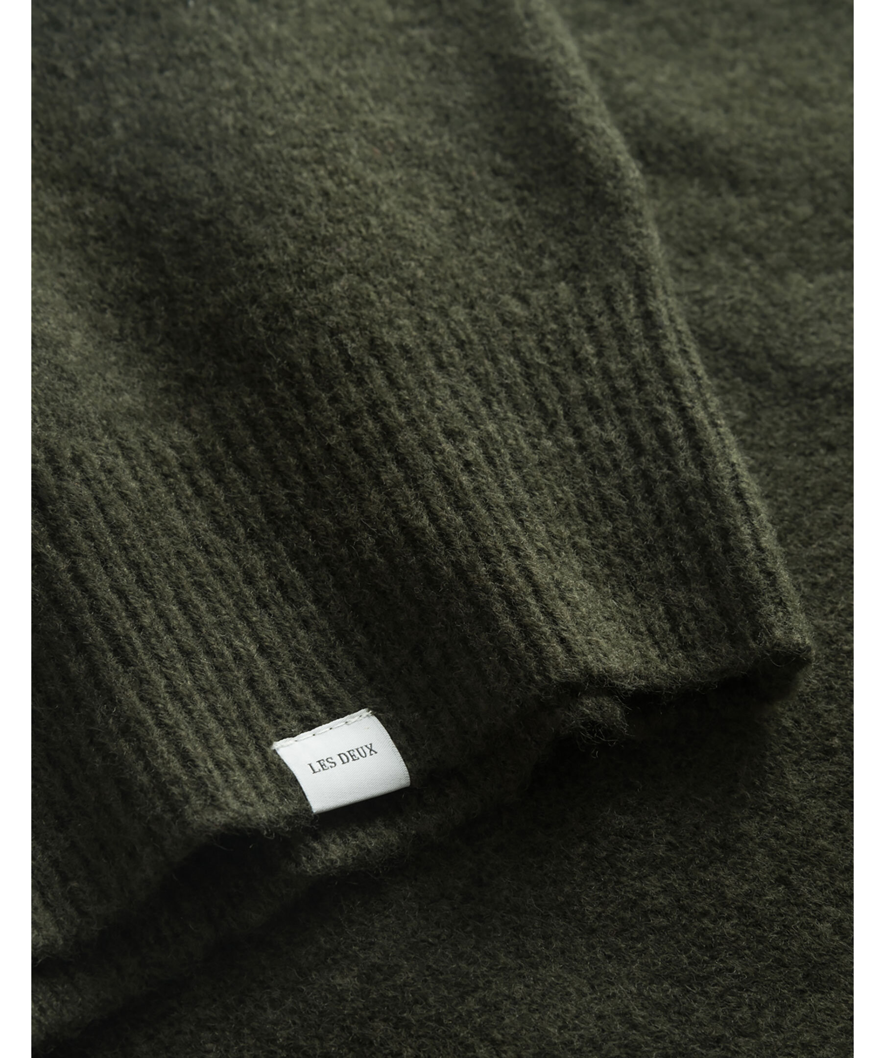 Mossgrön, stickad tröja tillverkad i blandning av ull och återvunnen polyester från Les Deux. Rundad halsringning och instickad logga över bröstet. Ribbstickade ärmslut, fåll och krage och logga på kanten nedtill på vänster sida.