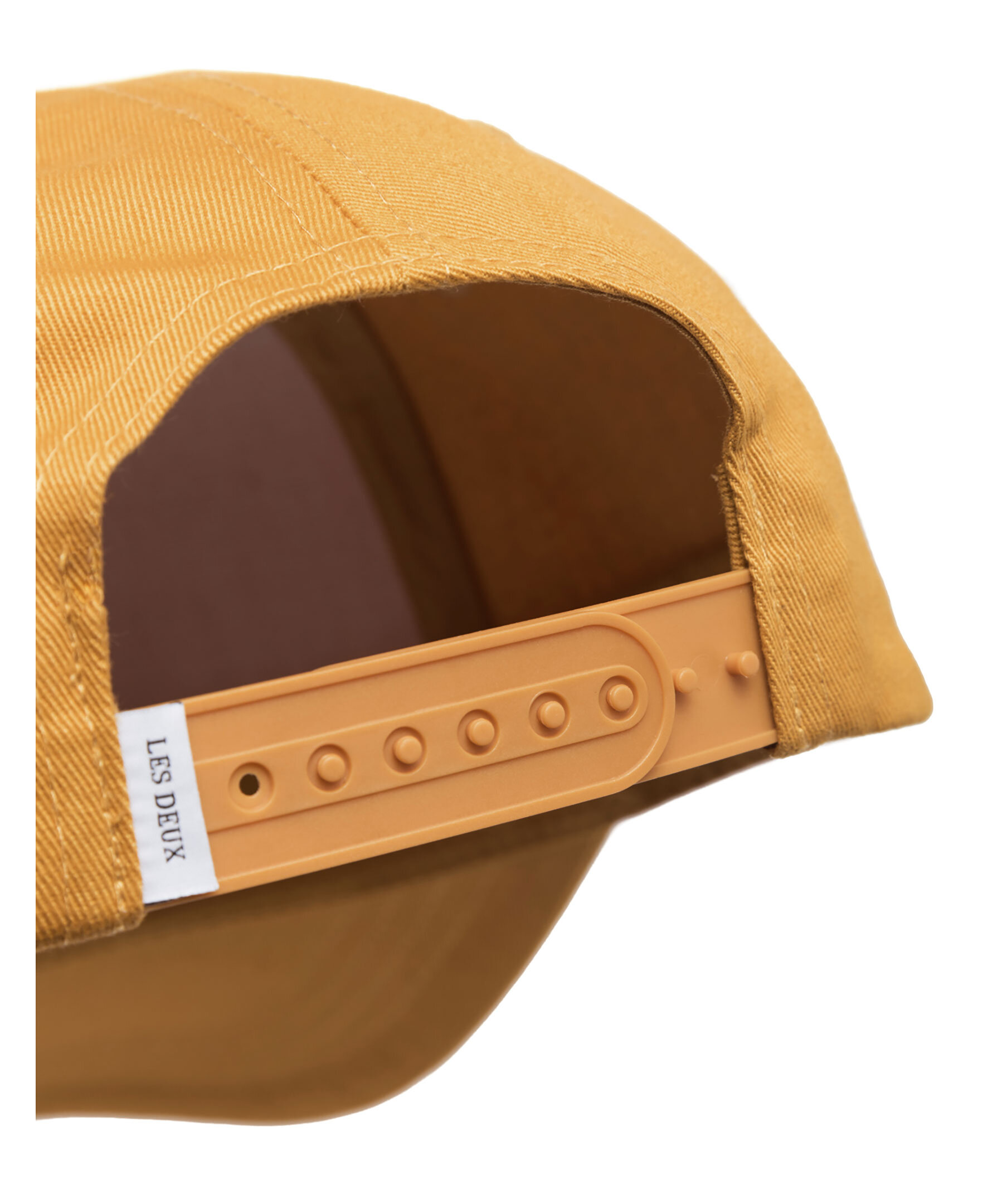 Senapsgul keps från Les Deux. Stor broderad logga framtill samt reglerbart spänne bak.