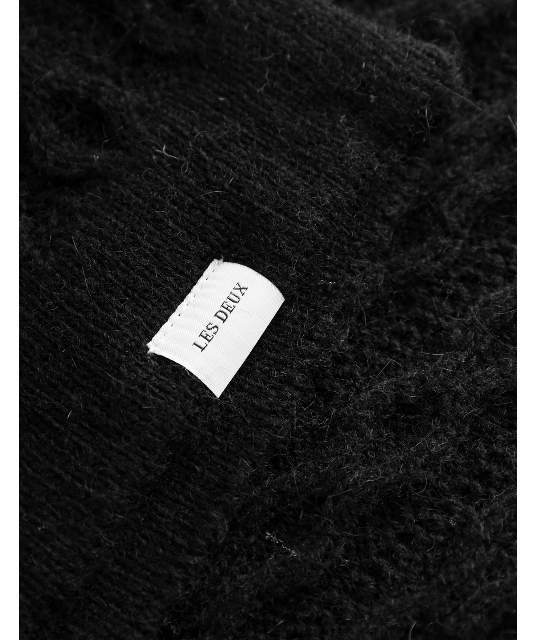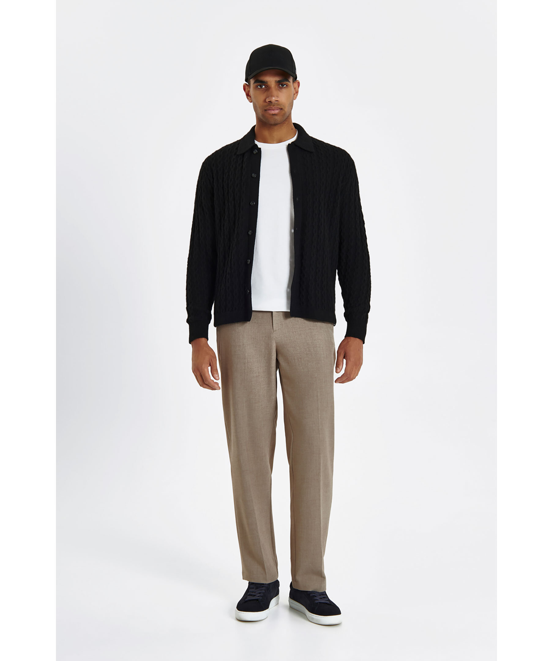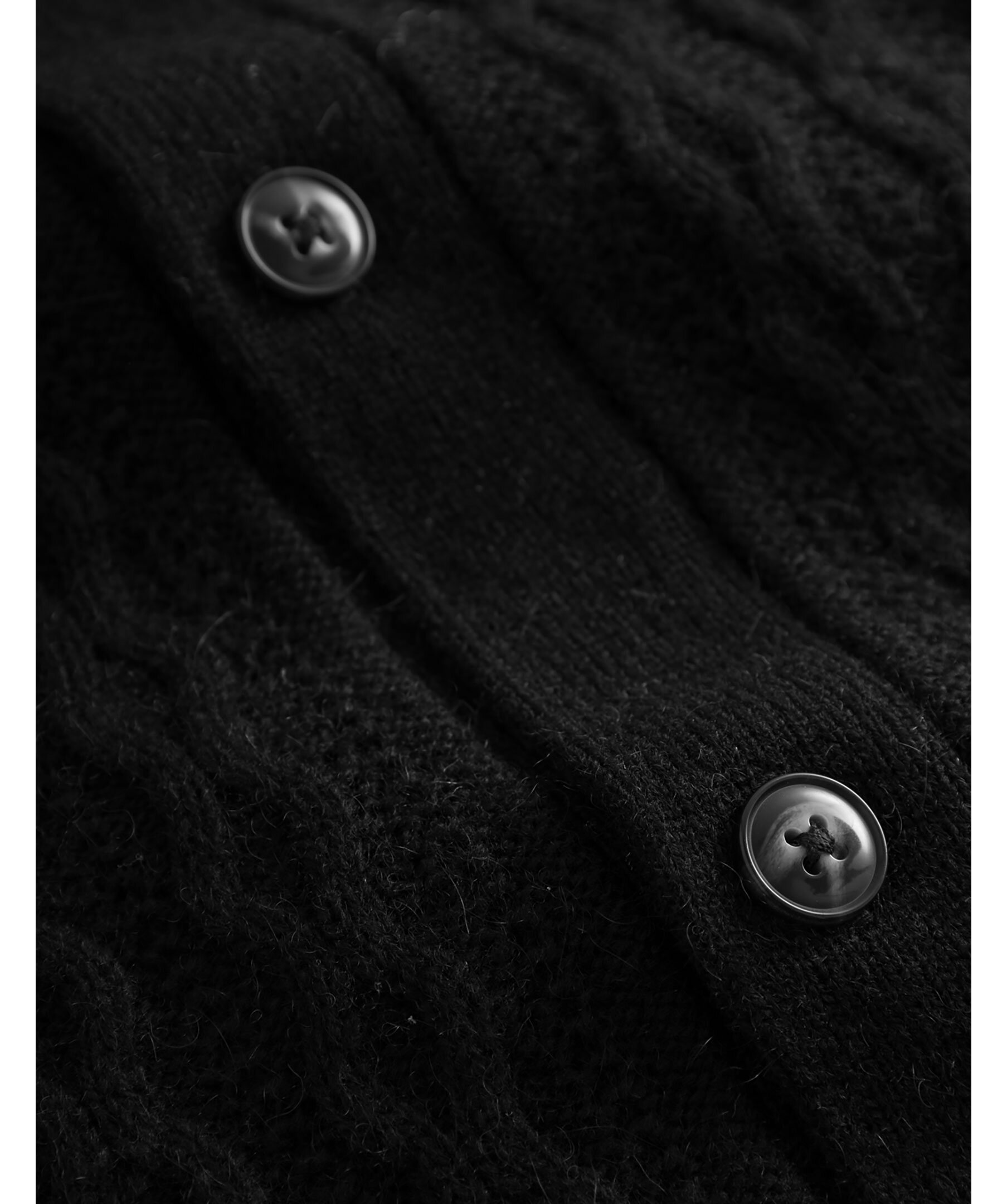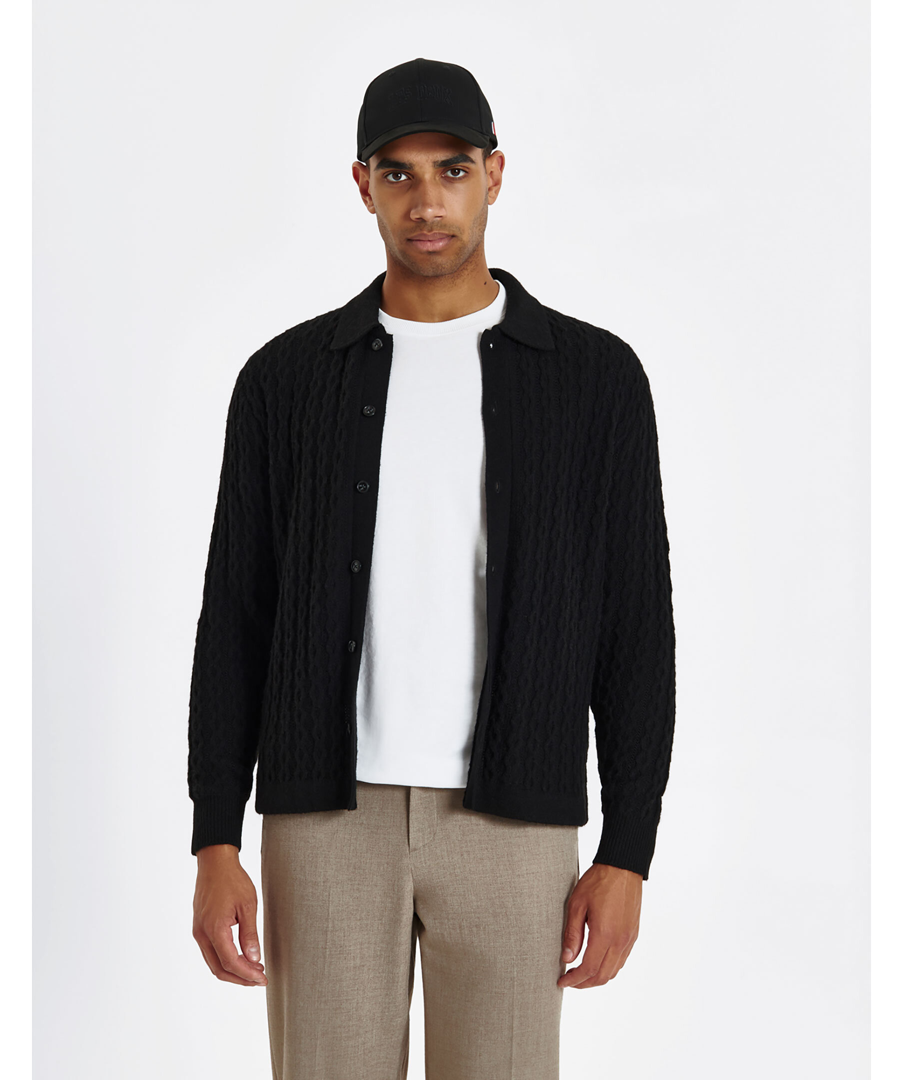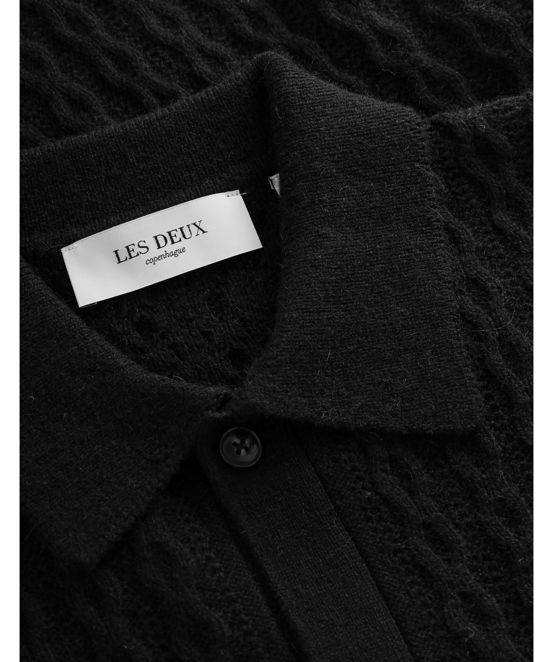 Svart kabelstickad tröja från Les Deux. Retroinspirerad modell. Tröjan kan används som en vanlig stickad tröja med knappar eller som en cardigan. Stängs med knappar och har en klassisk krage. Gjord i en ullblandning.