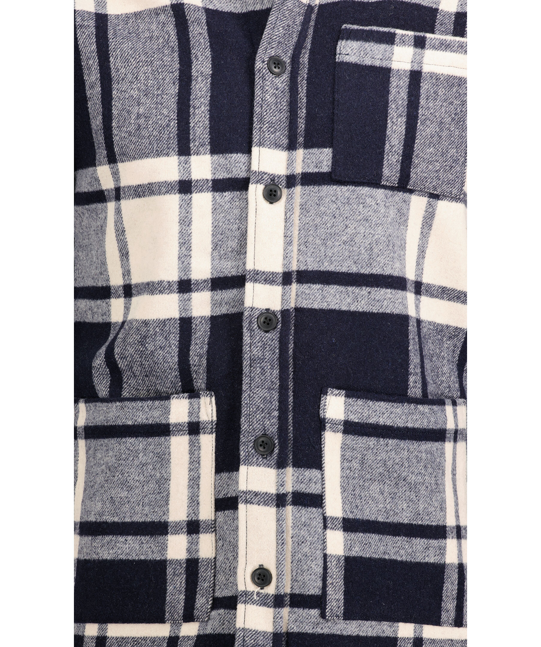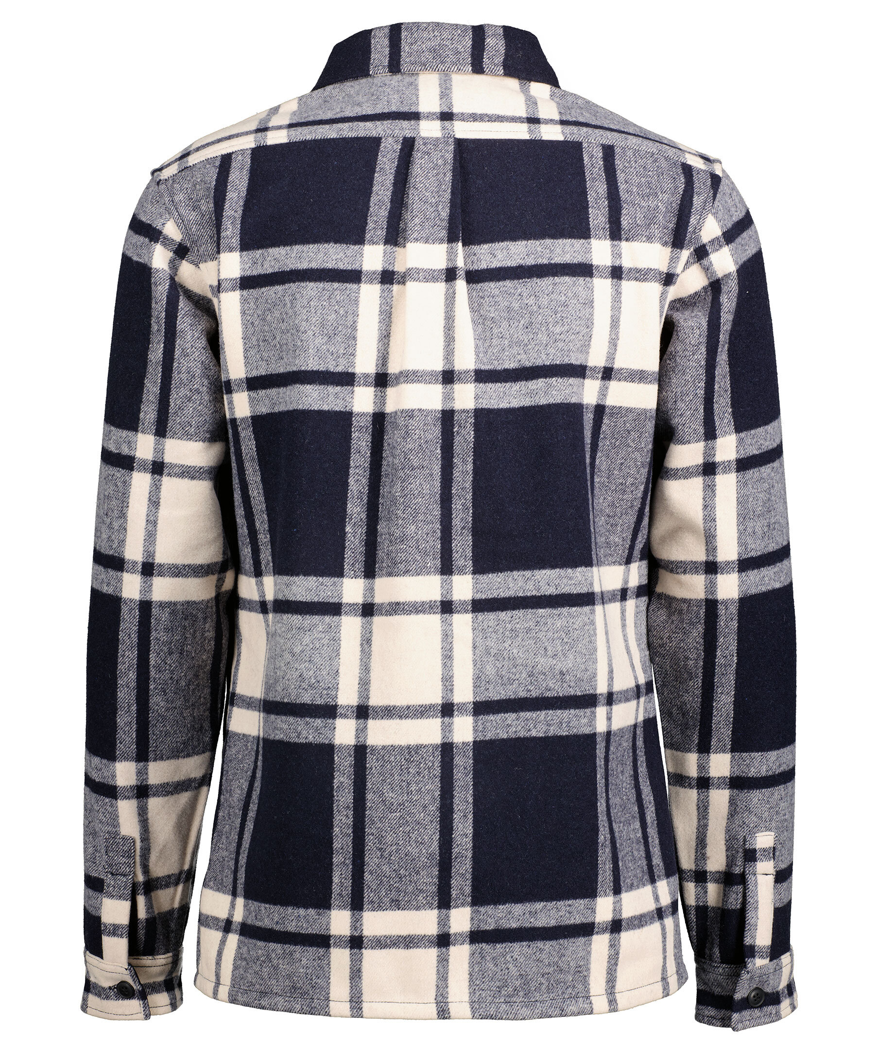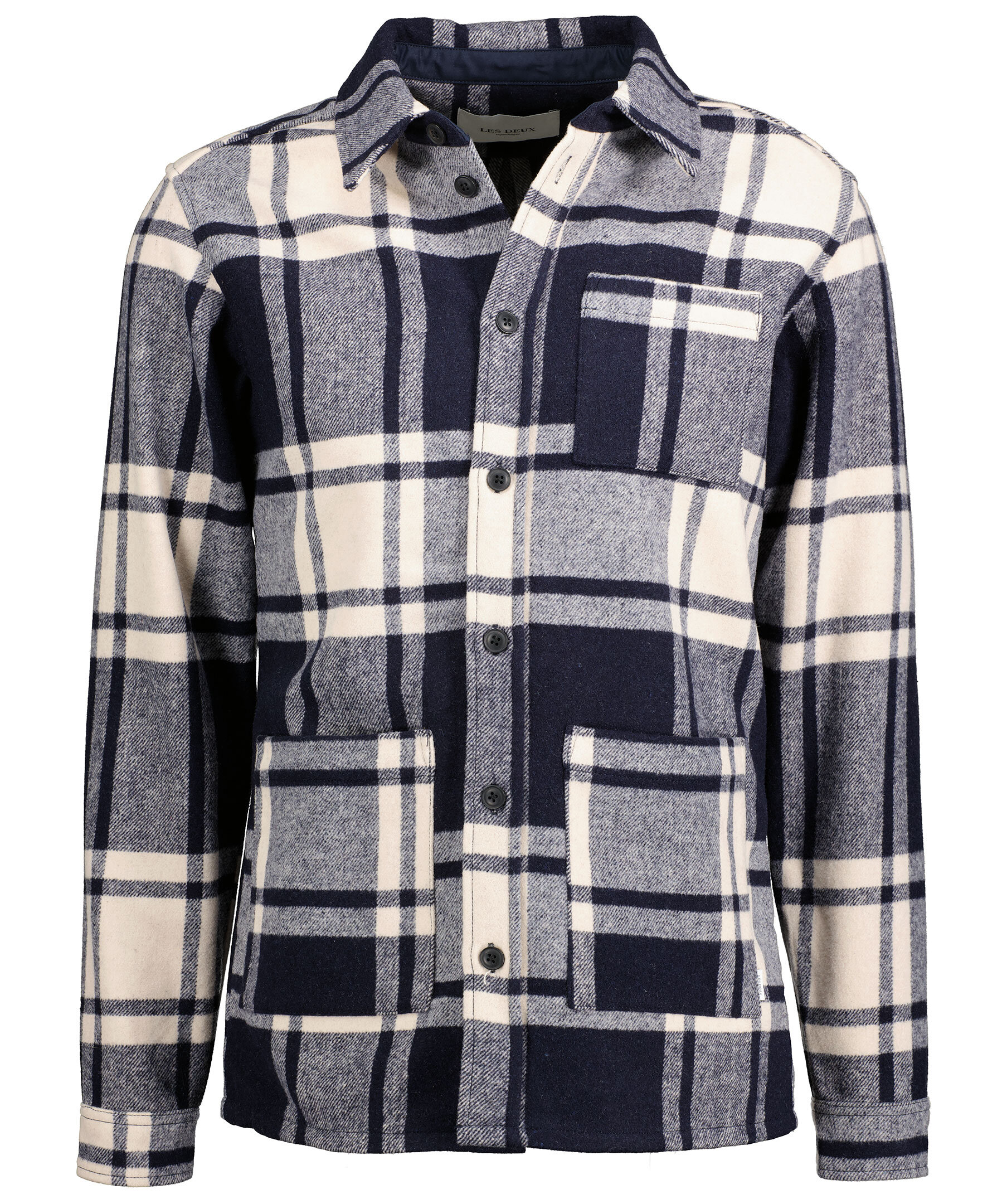 Rutig overshirt i vitt och marinblått från Les Deux. Skjortan är gjord i en en kraftig ullblandning. Två öppna framfickor en öppen bröstficka.
