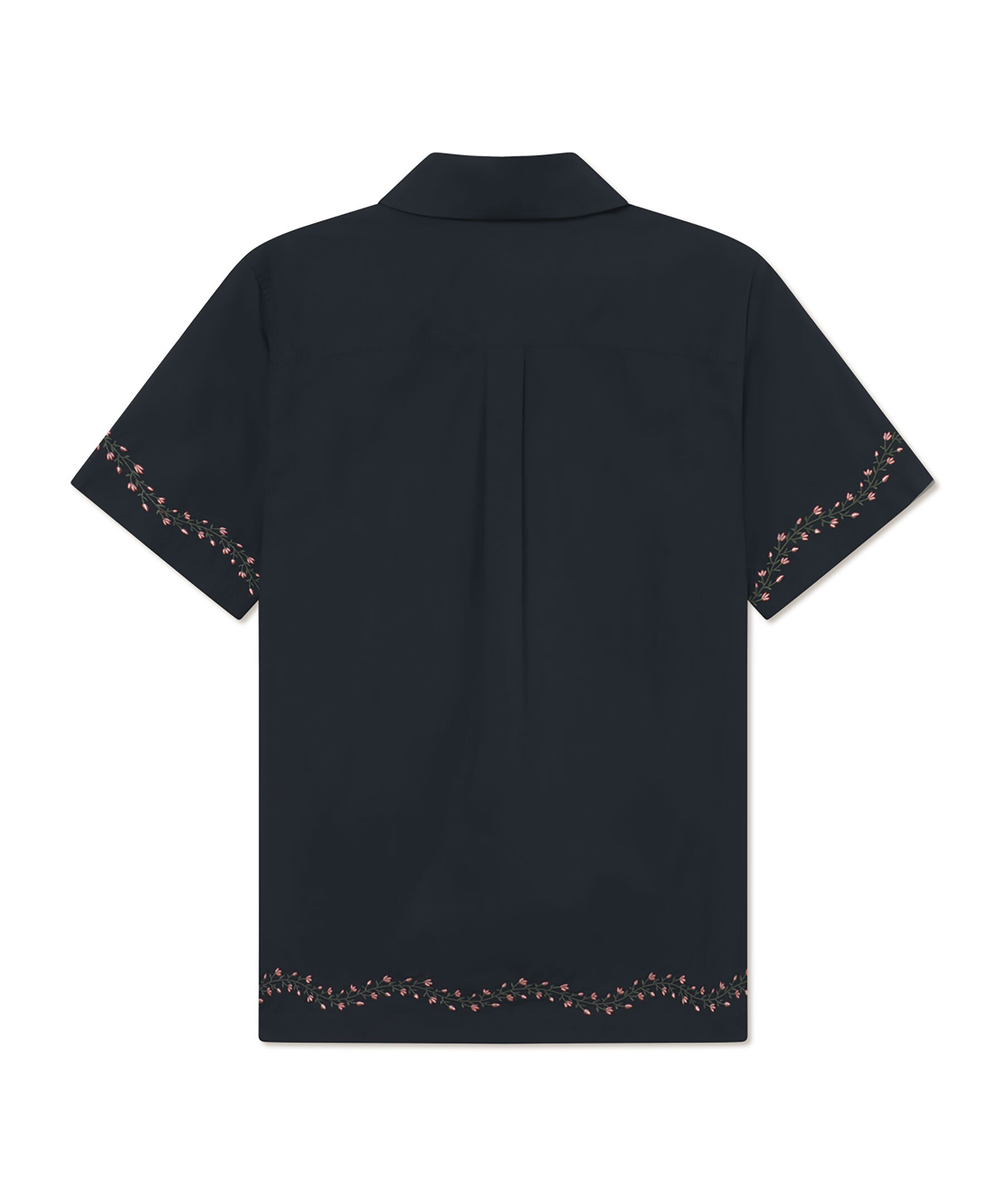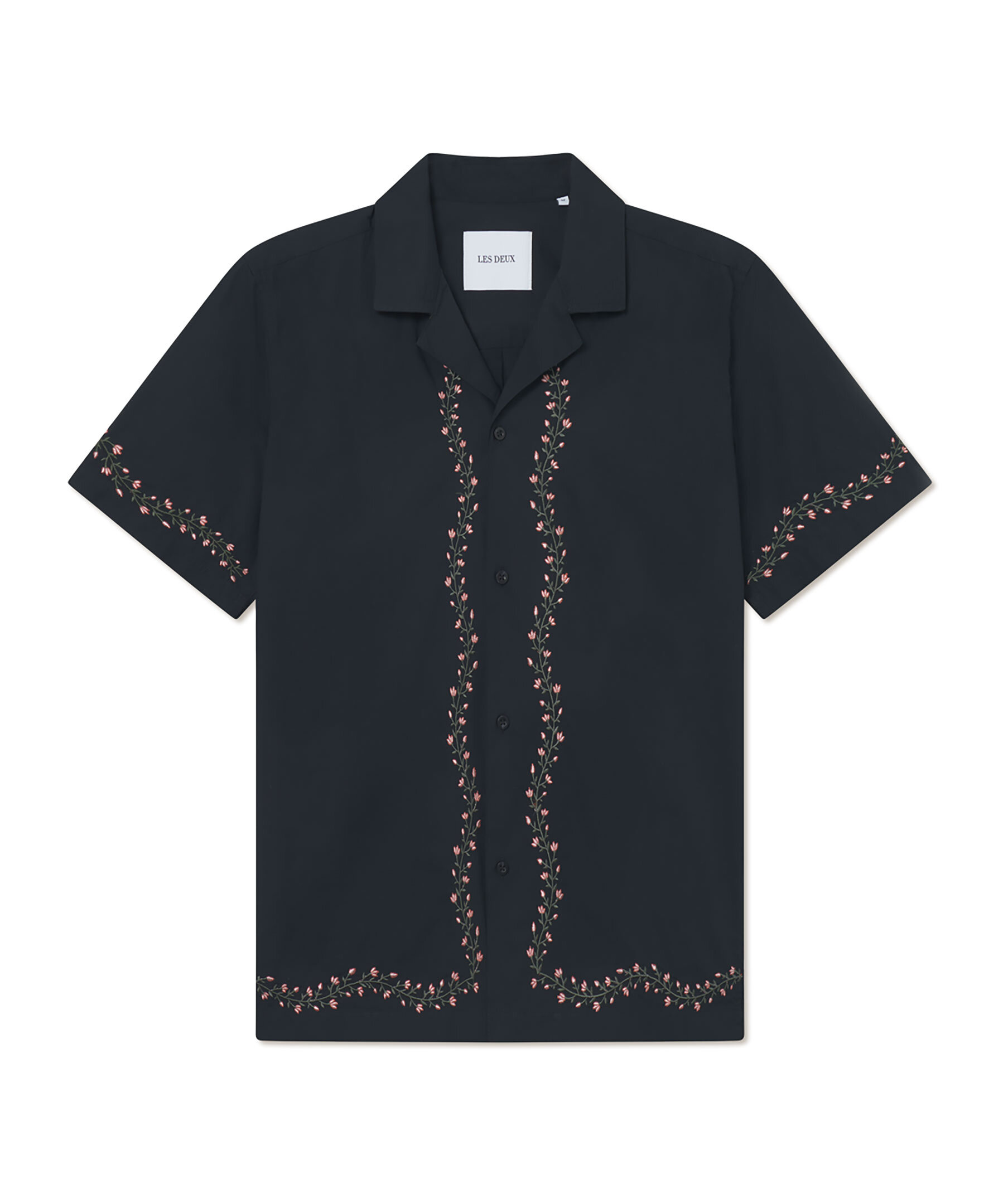 Svart, kortärmad skjorta från Les Deux. Stängs med knappar och har camp-krage, ok med boxveck, rak fåll samt blomsterbroderi runt kanterna. Tillverkad i bomull.