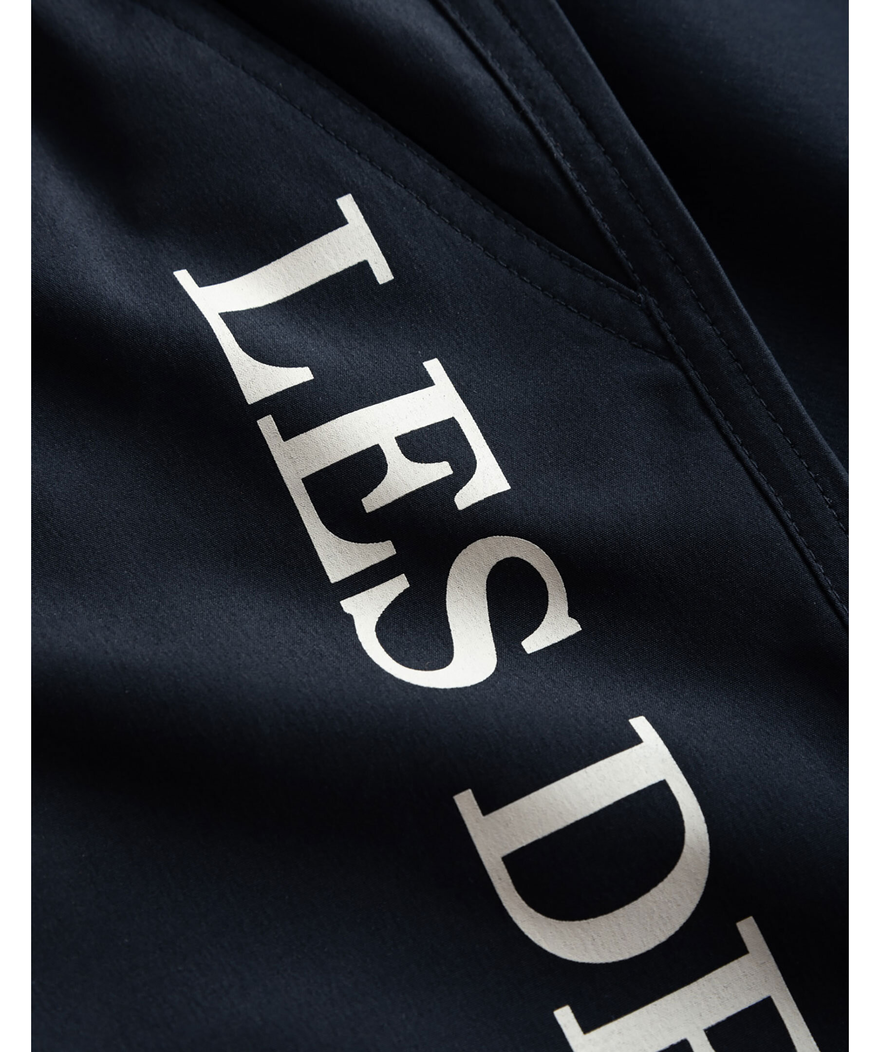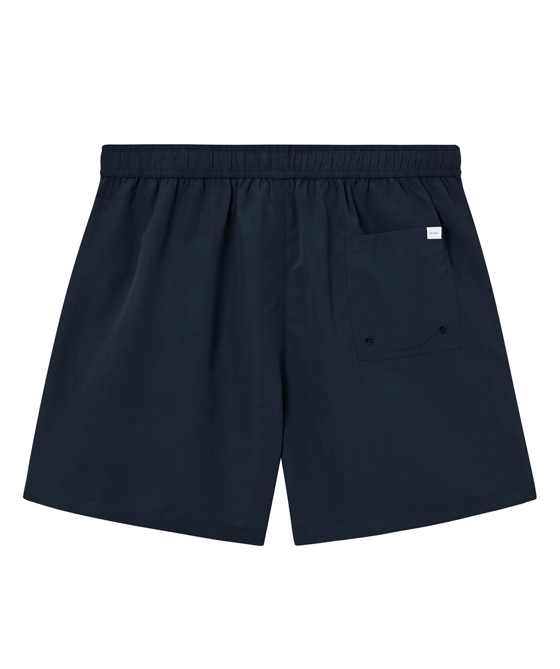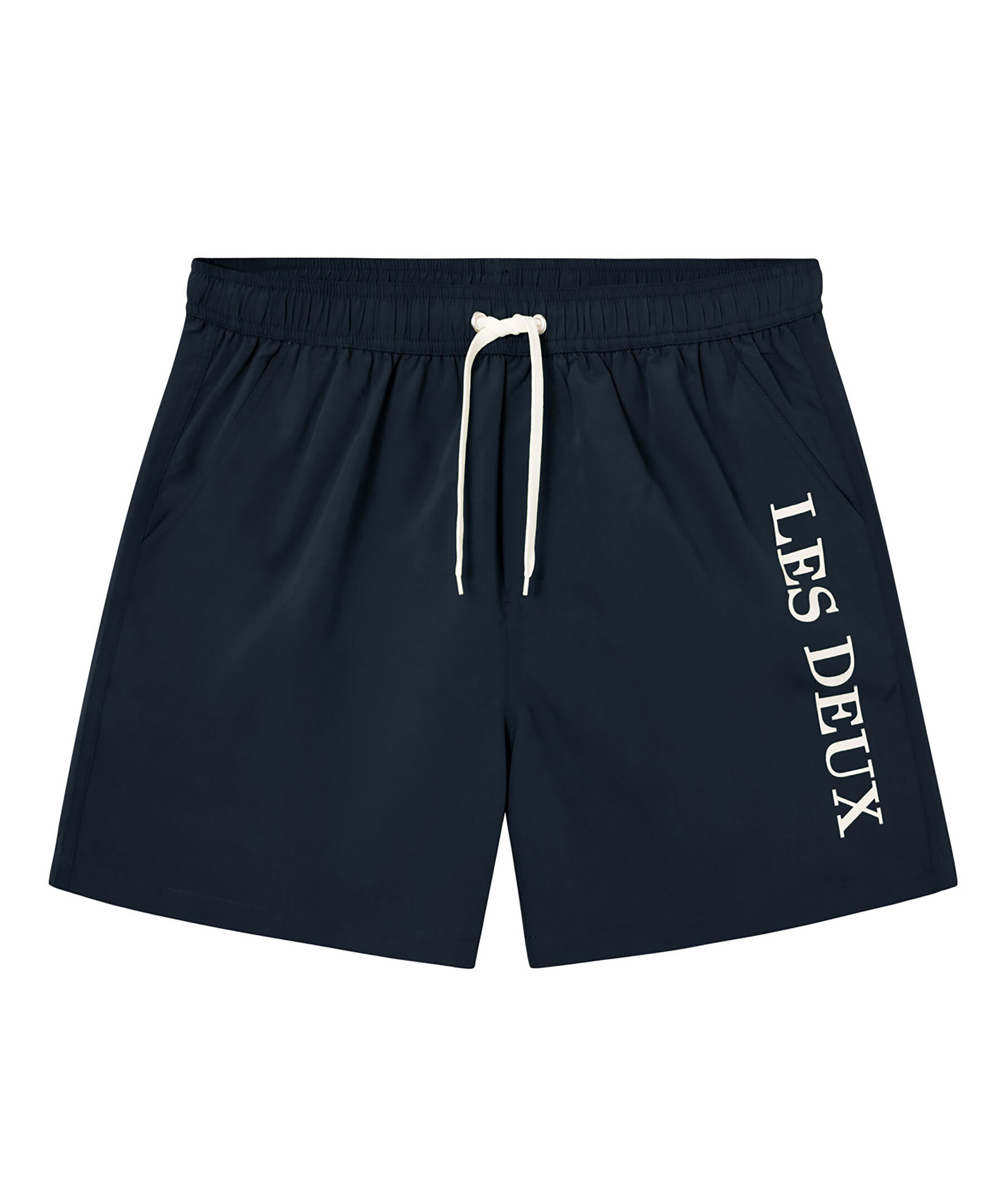 Marinblåa badbyxor från Les Deux. Materialet är av återvunnen polyester är både mjukt och snabbtorkande. Stora vertikal logotyp på vänster ben. Elastisk mudd i midjan med vit snörning samt två framfickor och en bakficka.