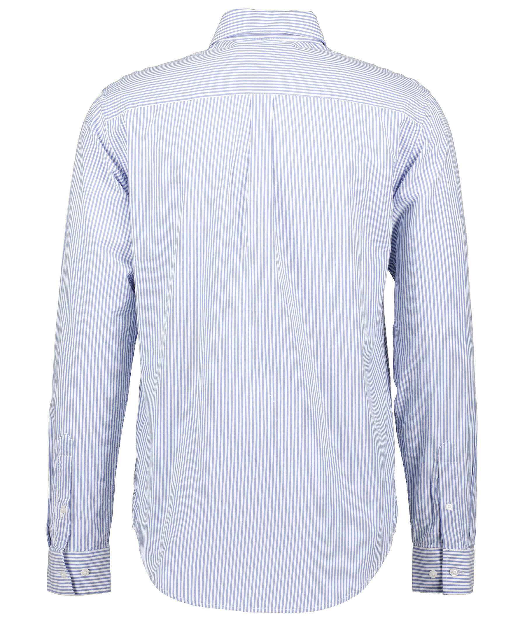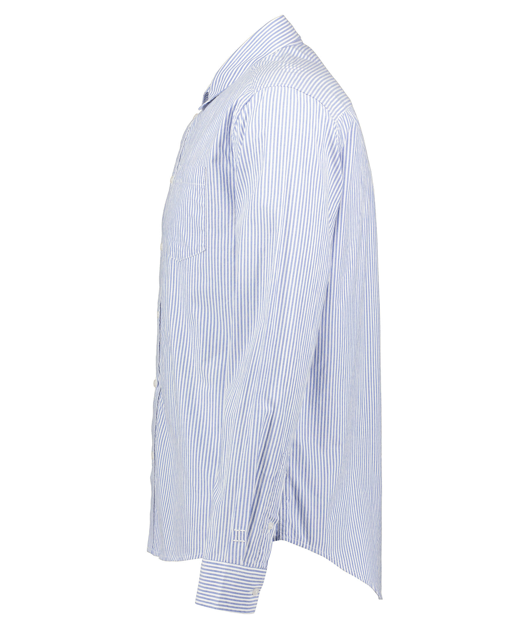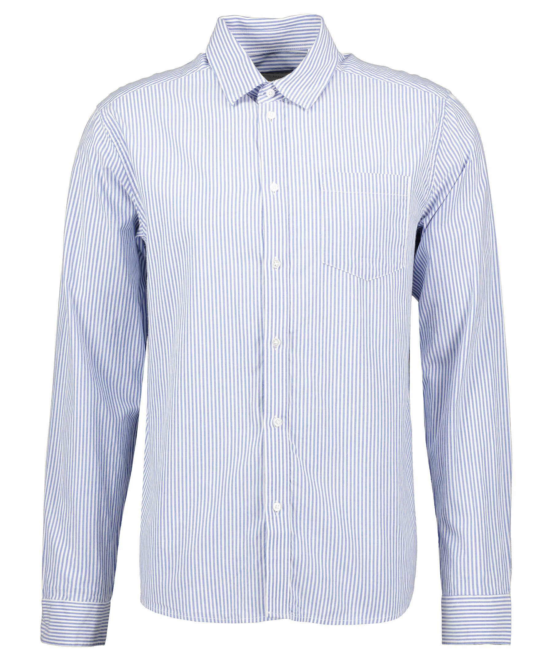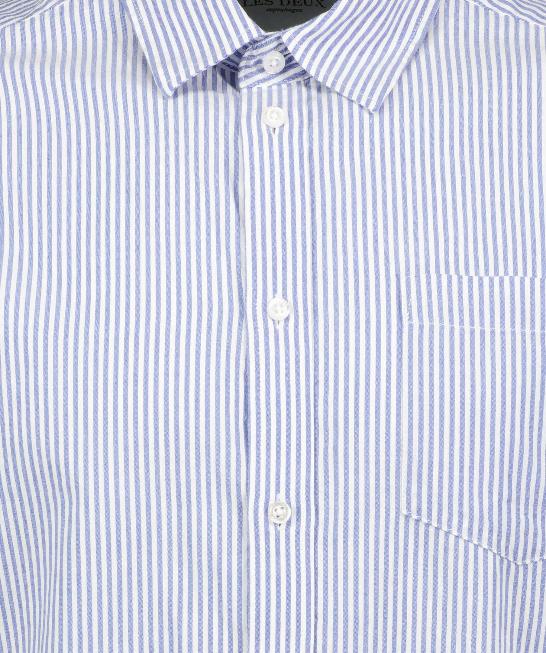 Vit och ljusblå randig skjorta från Les Deux. Strängs framtill med knappar. Spetsig krage. Enkla manschetter. Bröstficka på vänster sida. Tillverkad i 100% bomull. Broderad logotyp på vänster ärm.