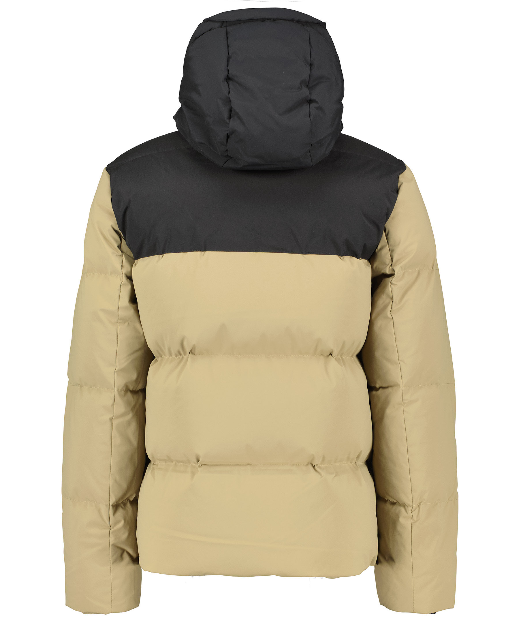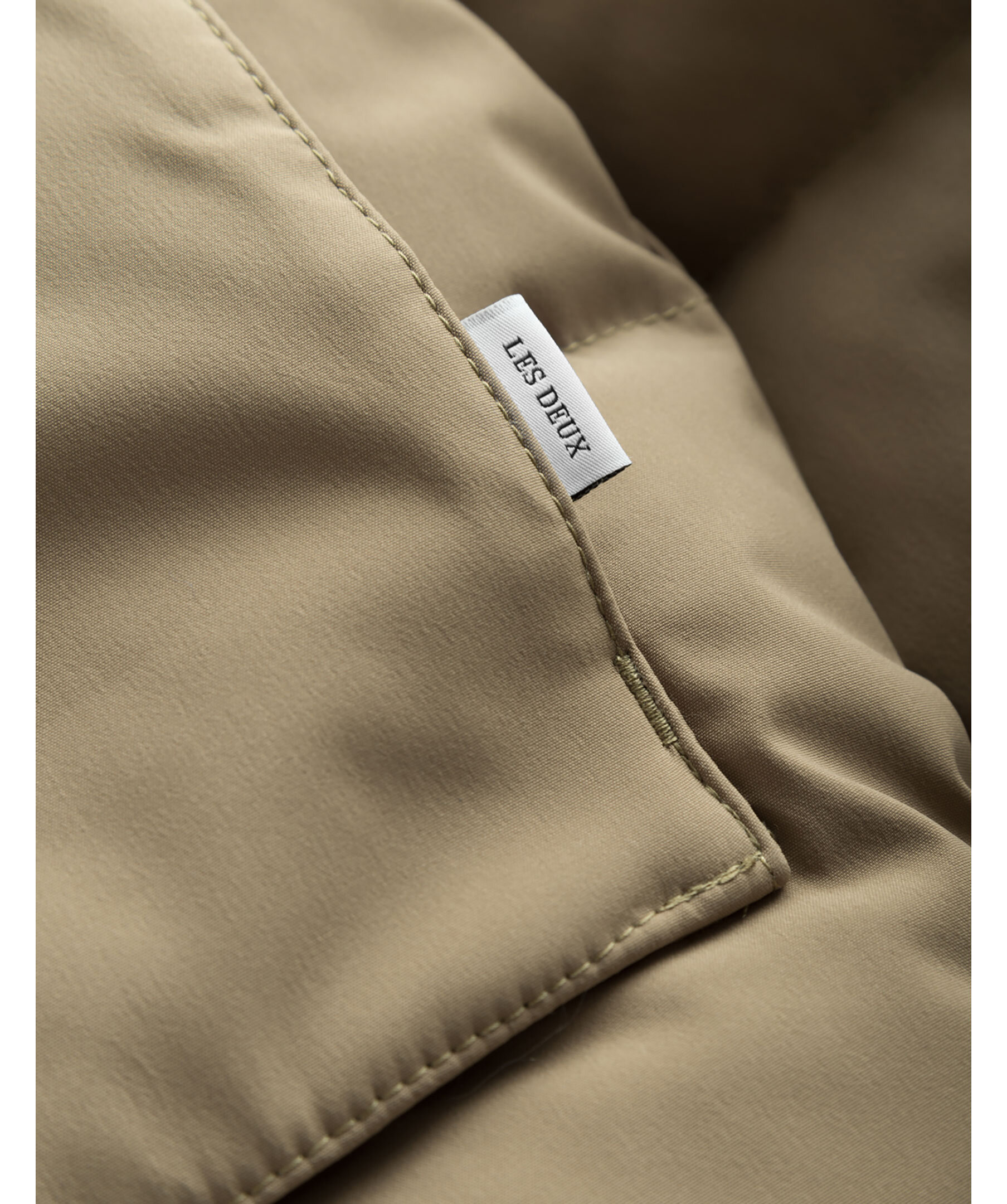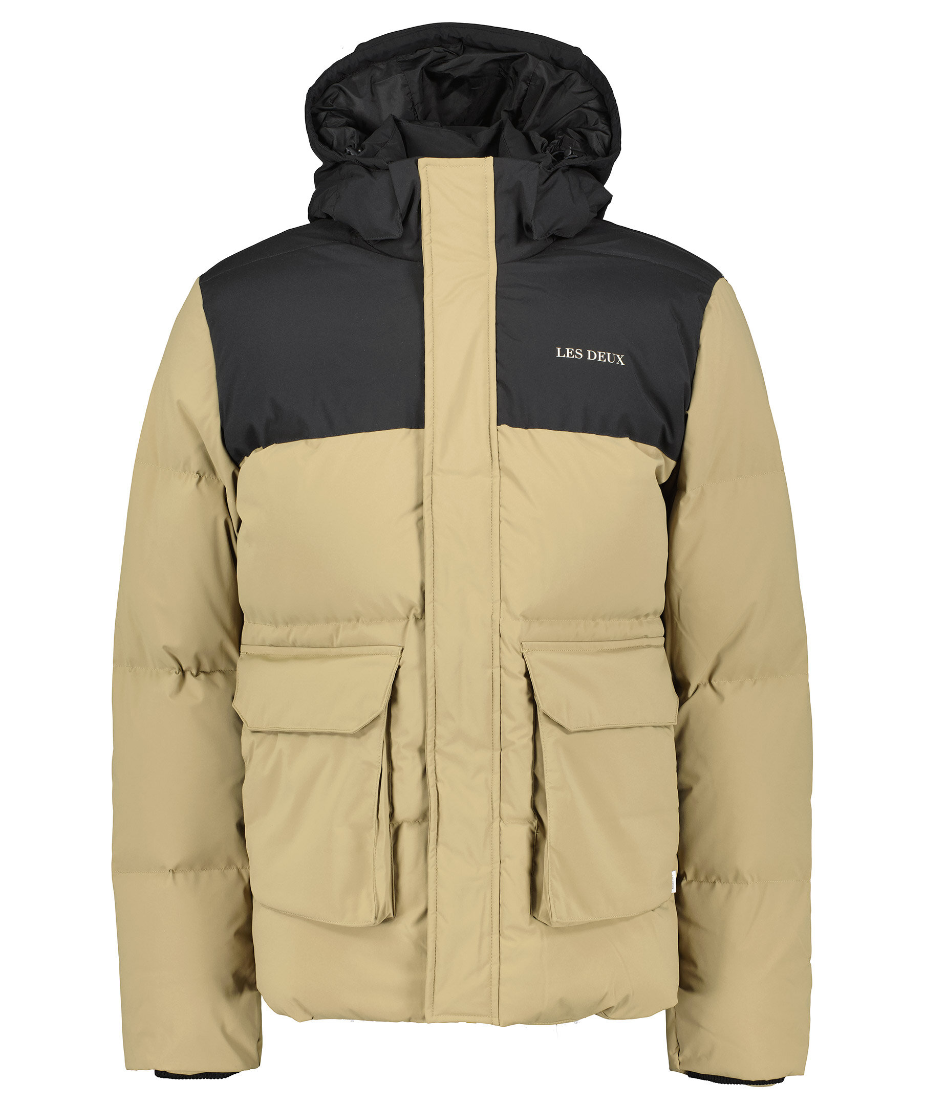 Grönbeige dunjacka från Les Deux med svarta paneler på axlarna och luvan. Stängs framtill med tvåvägsdragkedja och tryckknappar. Två fickor framtill som stängs med magneter och lock. Innerficka med dragkedja. Tryckt logotyp på vänster bröst. Dragsko vid jackslut. Ribbstickade muddar vid ärmslut. Dragsko vid jackslut. Jackan är vattenavvisande.