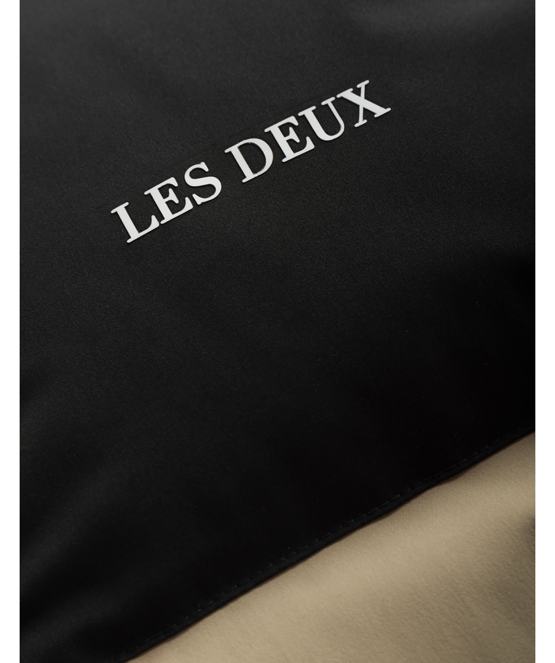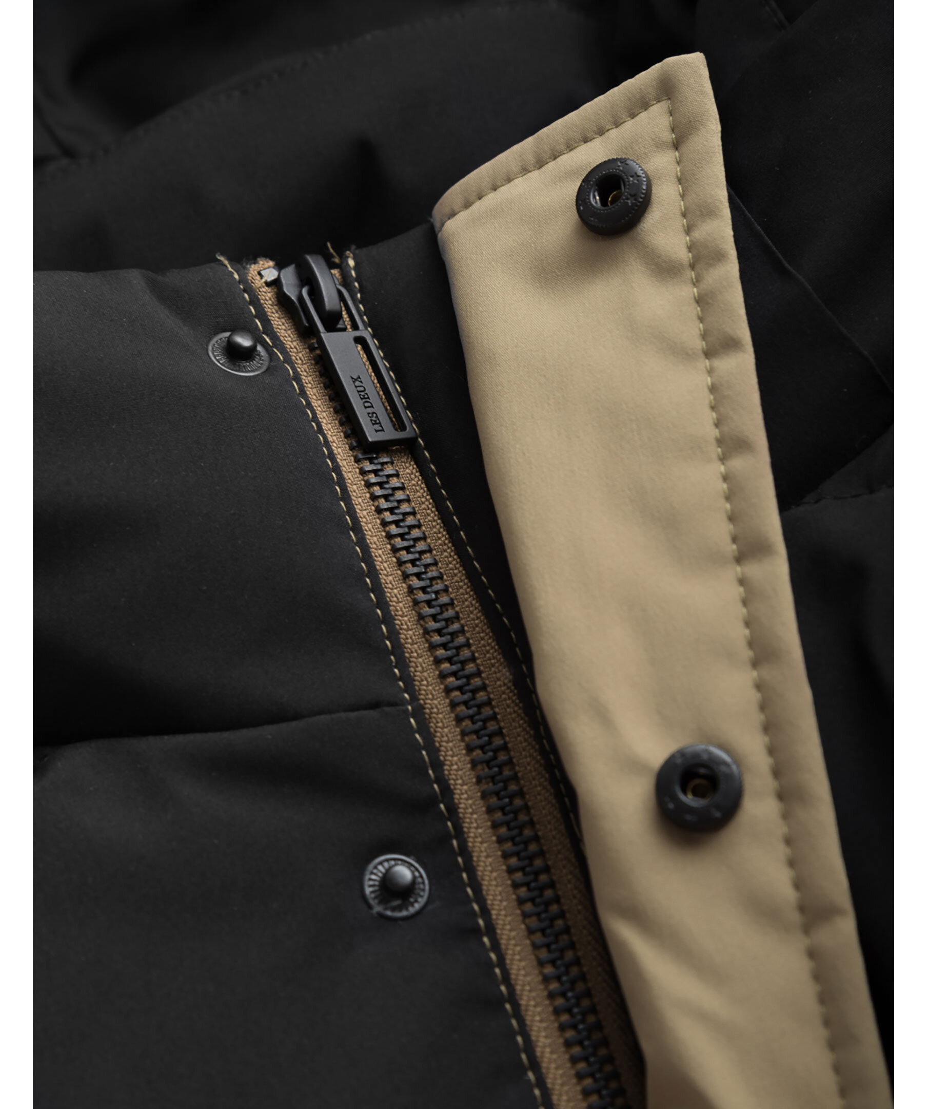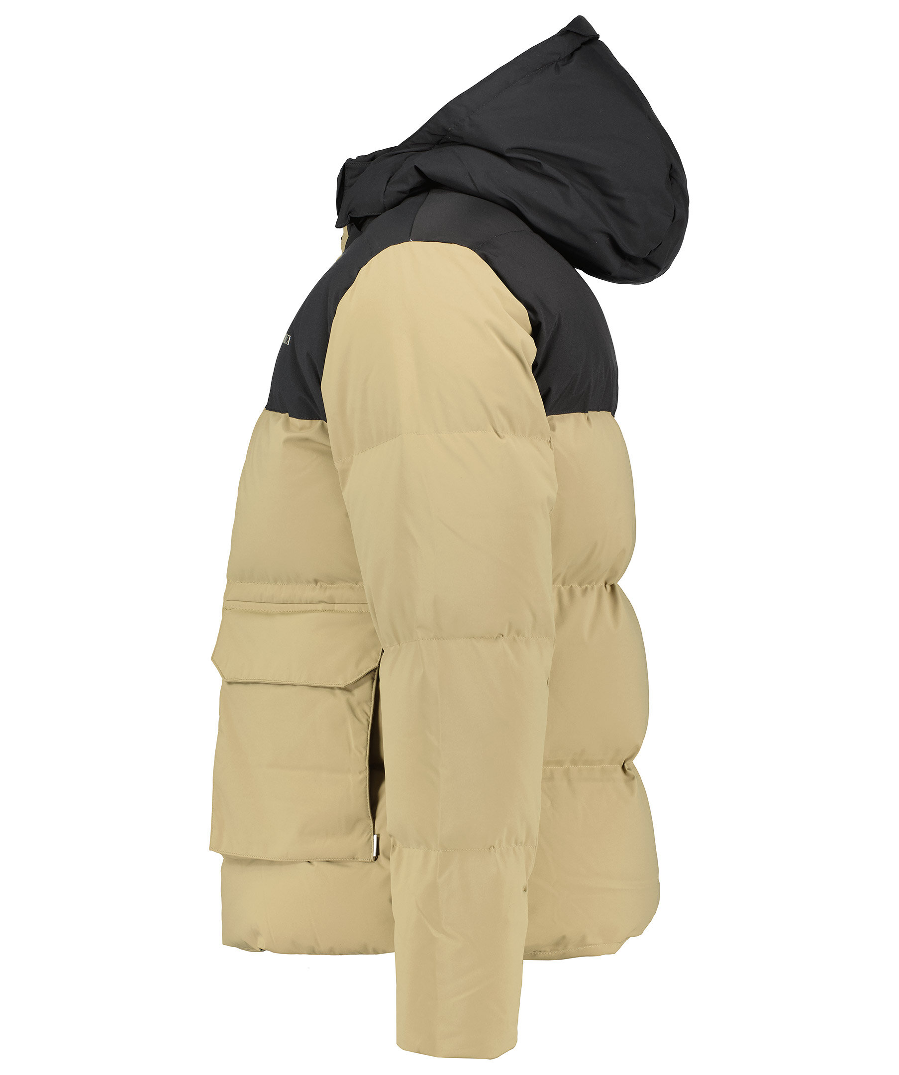 Grönbeige dunjacka från Les Deux med svarta paneler på axlarna och luvan. Stängs framtill med tvåvägsdragkedja och tryckknappar. Två fickor framtill som stängs med magneter och lock. Innerficka med dragkedja. Tryckt logotyp på vänster bröst. Dragsko vid jackslut. Ribbstickade muddar vid ärmslut. Dragsko vid jackslut. Jackan är vattenavvisande.
