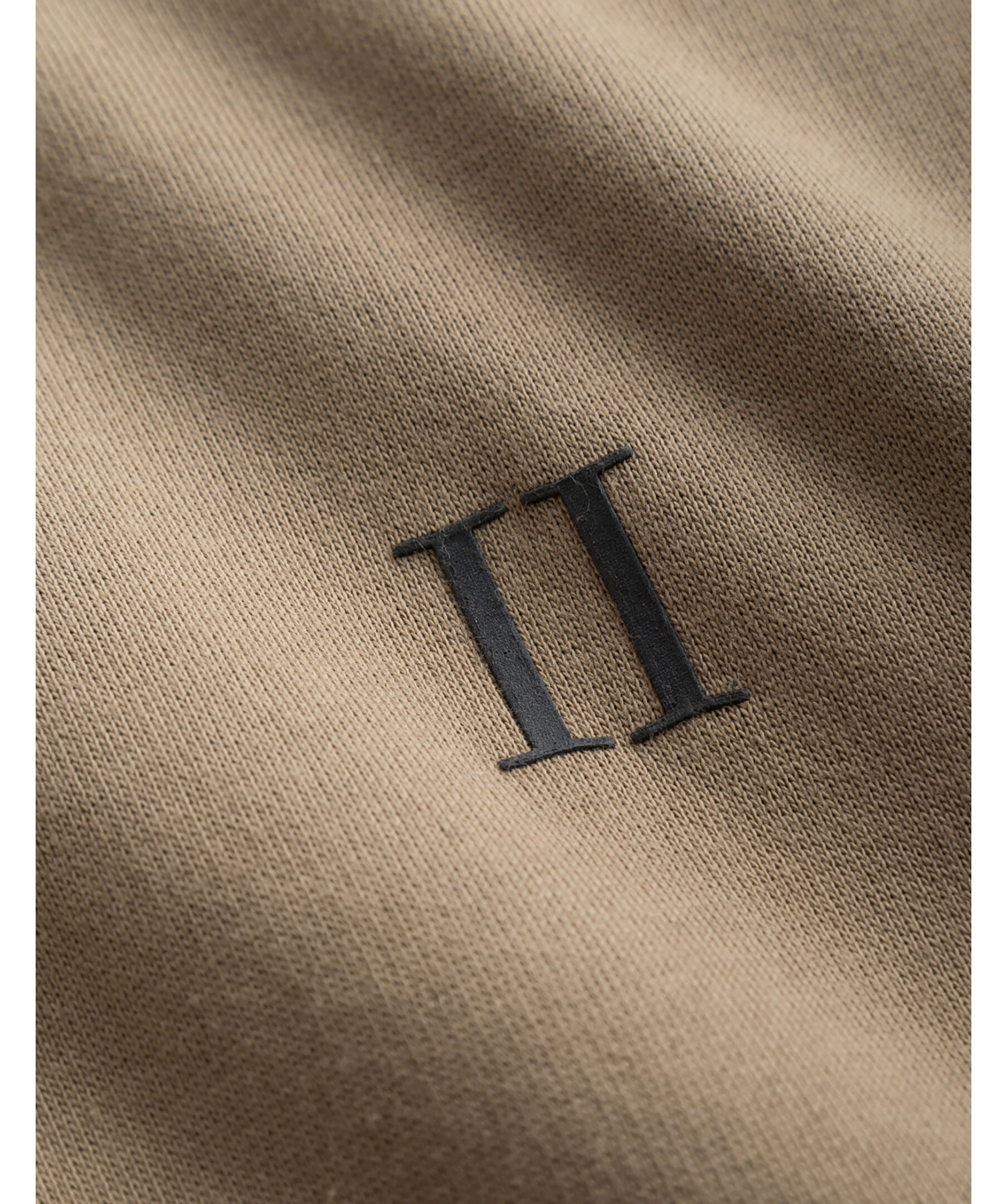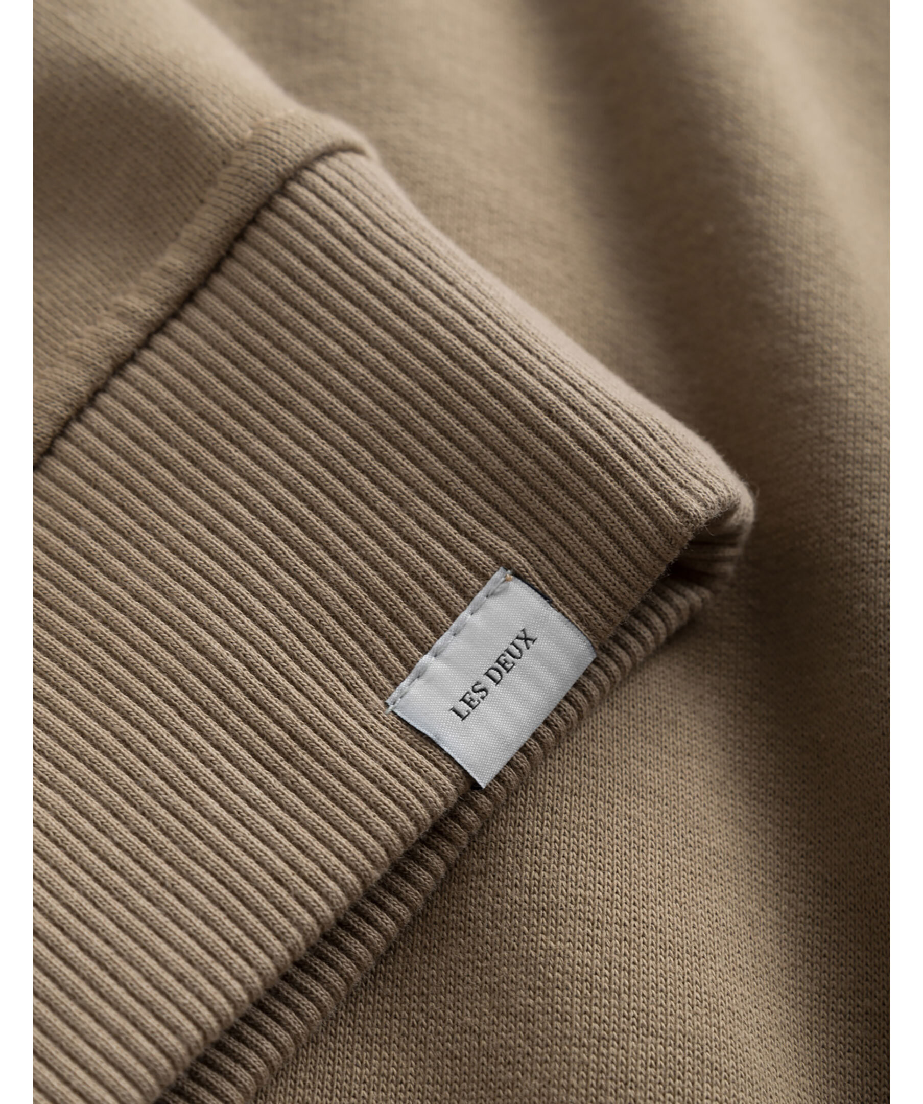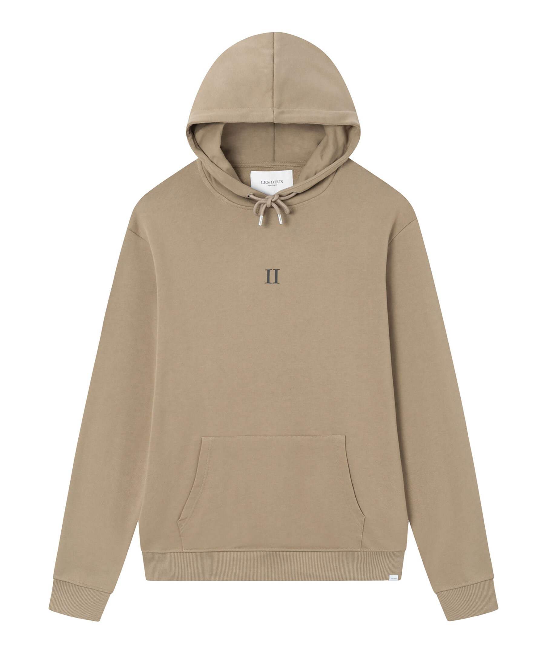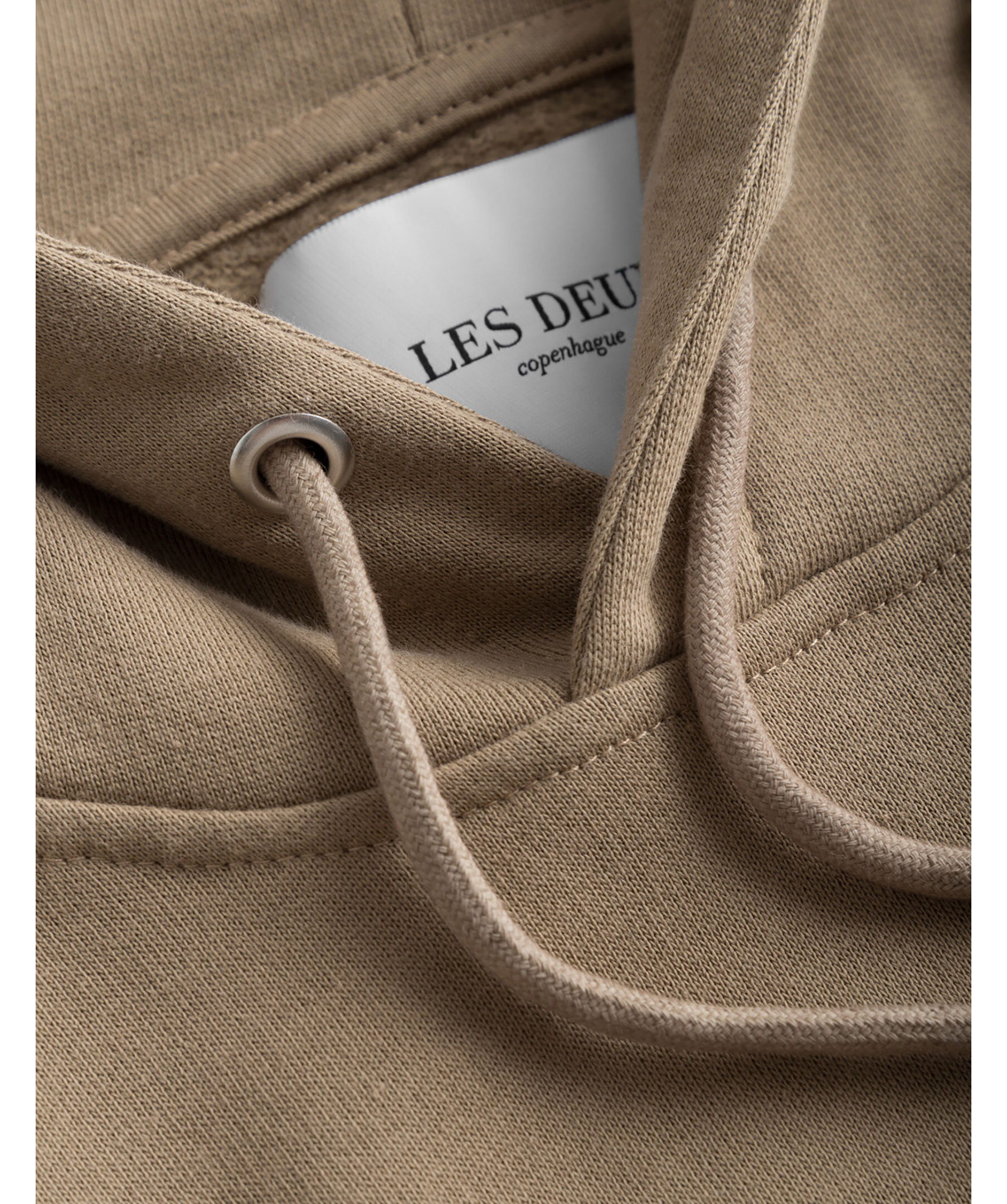 Brun hoodie från Les Deux. Liten logotyp tryck på bröstet, känguru-ficka på magen, ribbade muddar och snörning i luva. Tillverkad i bomull.