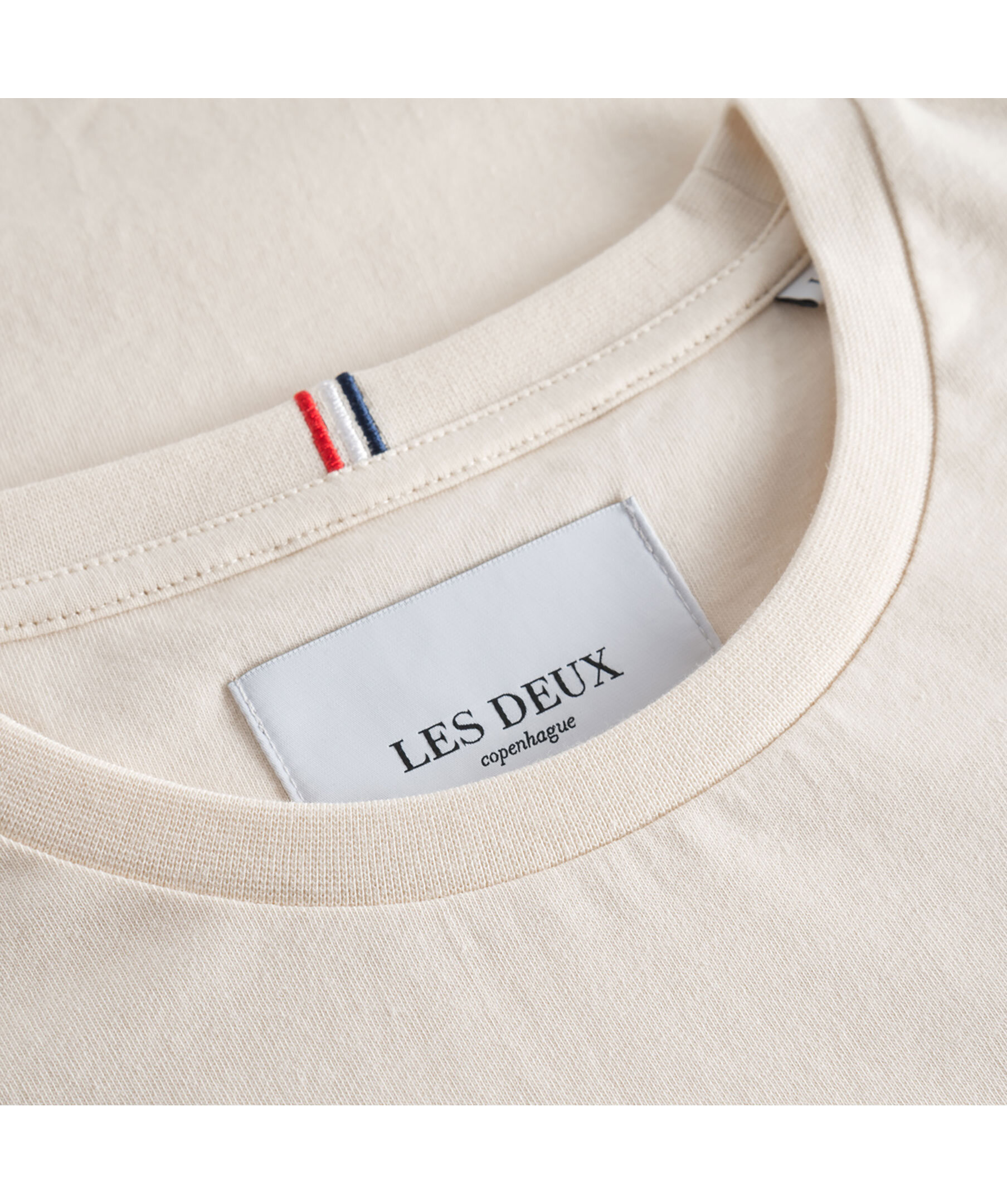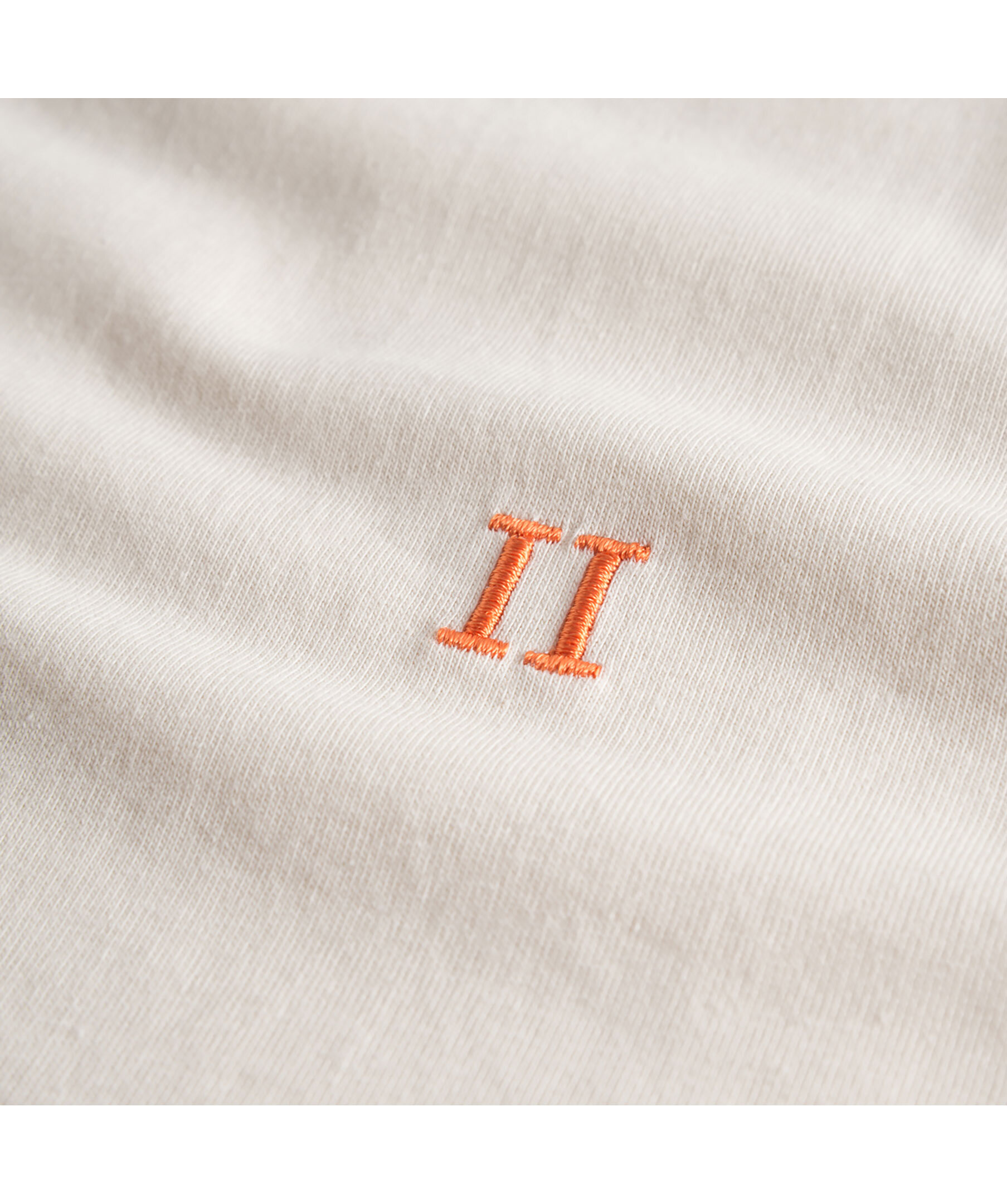 Beige melerad t-shirt från Les Deux. Rundad halsrining. Broderad logotyp i orange på vänster bröst. Tillverkad i 100% bomull. Uppvikta ärmar.