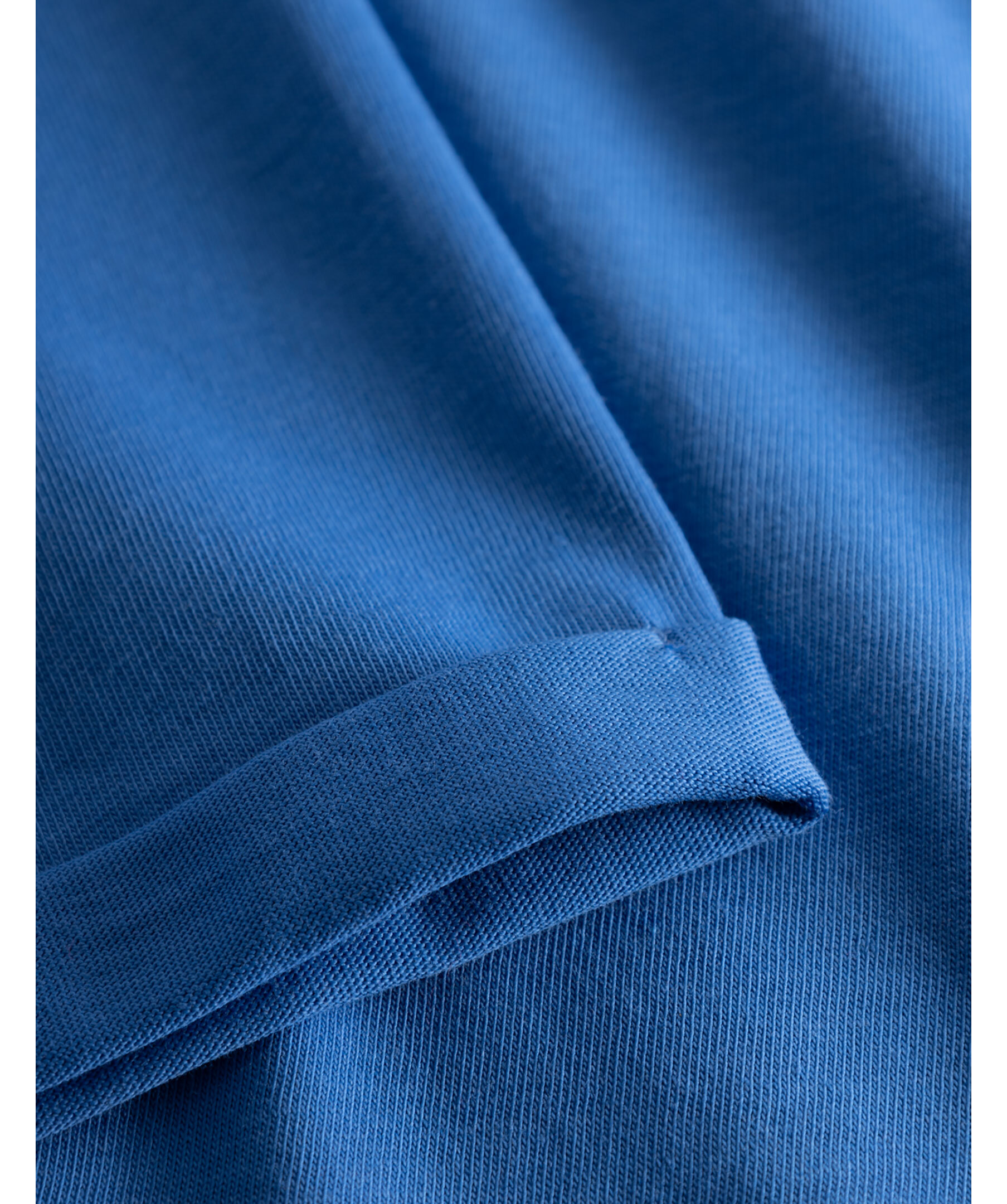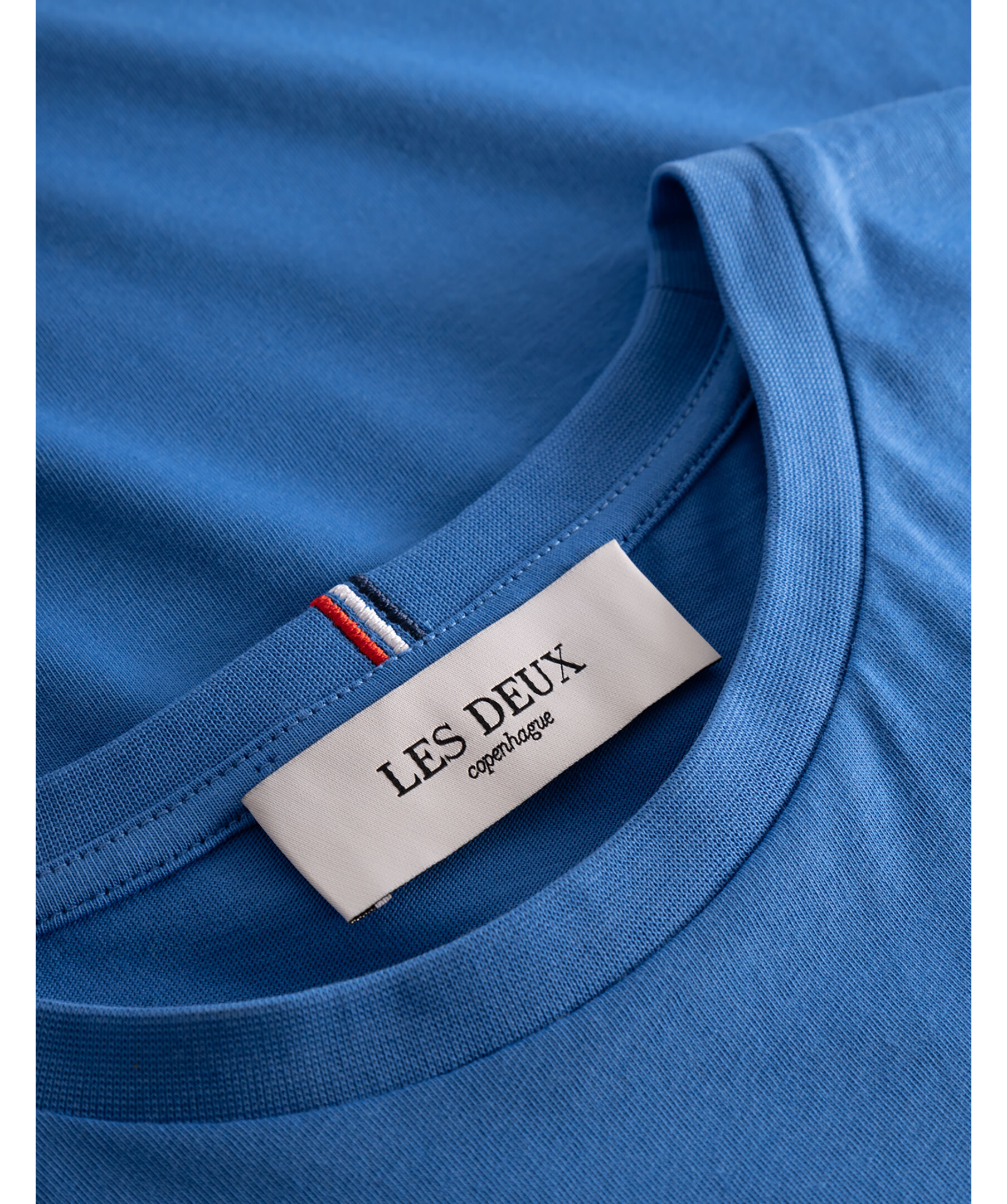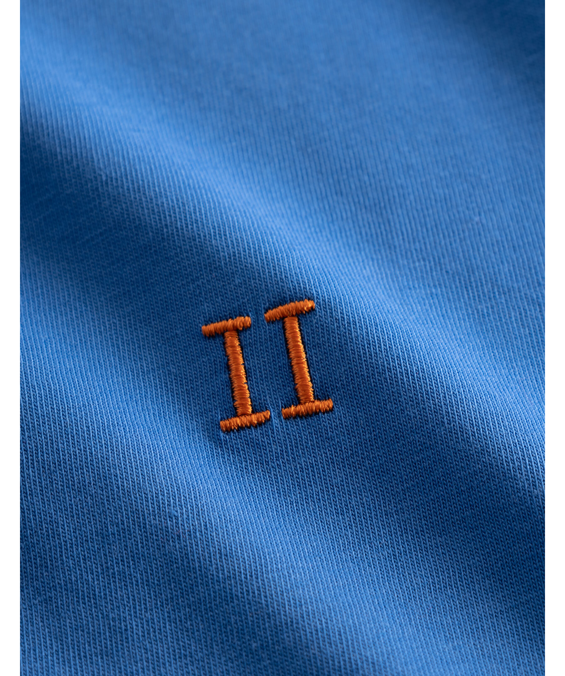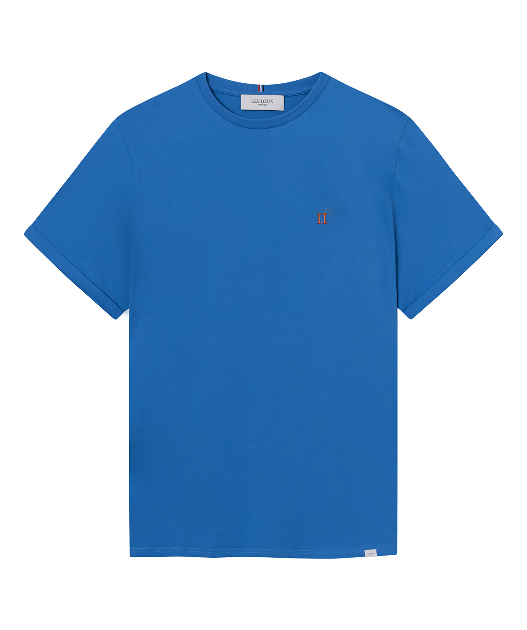 Blå t-shirt från Les Deux. Rundad halsrining. Broderad logotyp i orange på vänster bröst och upprullade ärmar. Tillverkad i 100% bomull.