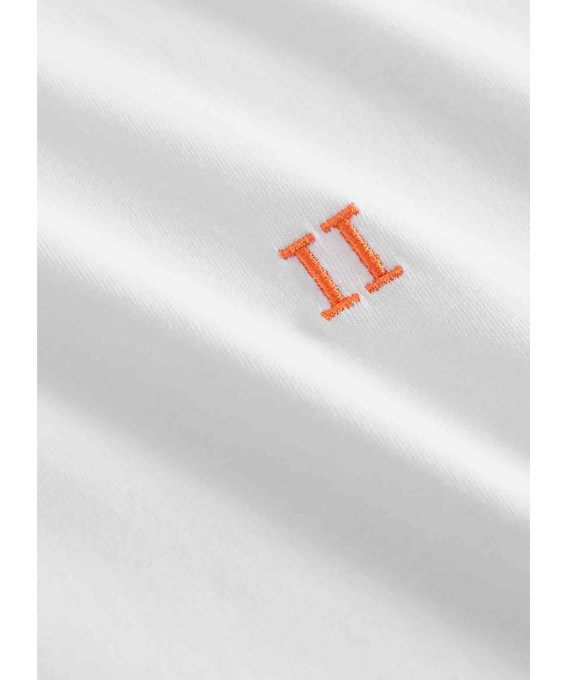 Vit t-shirt från Les Deux. Rundad halsrining. Broderad logotyp i orange på vänster bröst. Tillverkad i 100% bomull. Uppvikta ärmar.