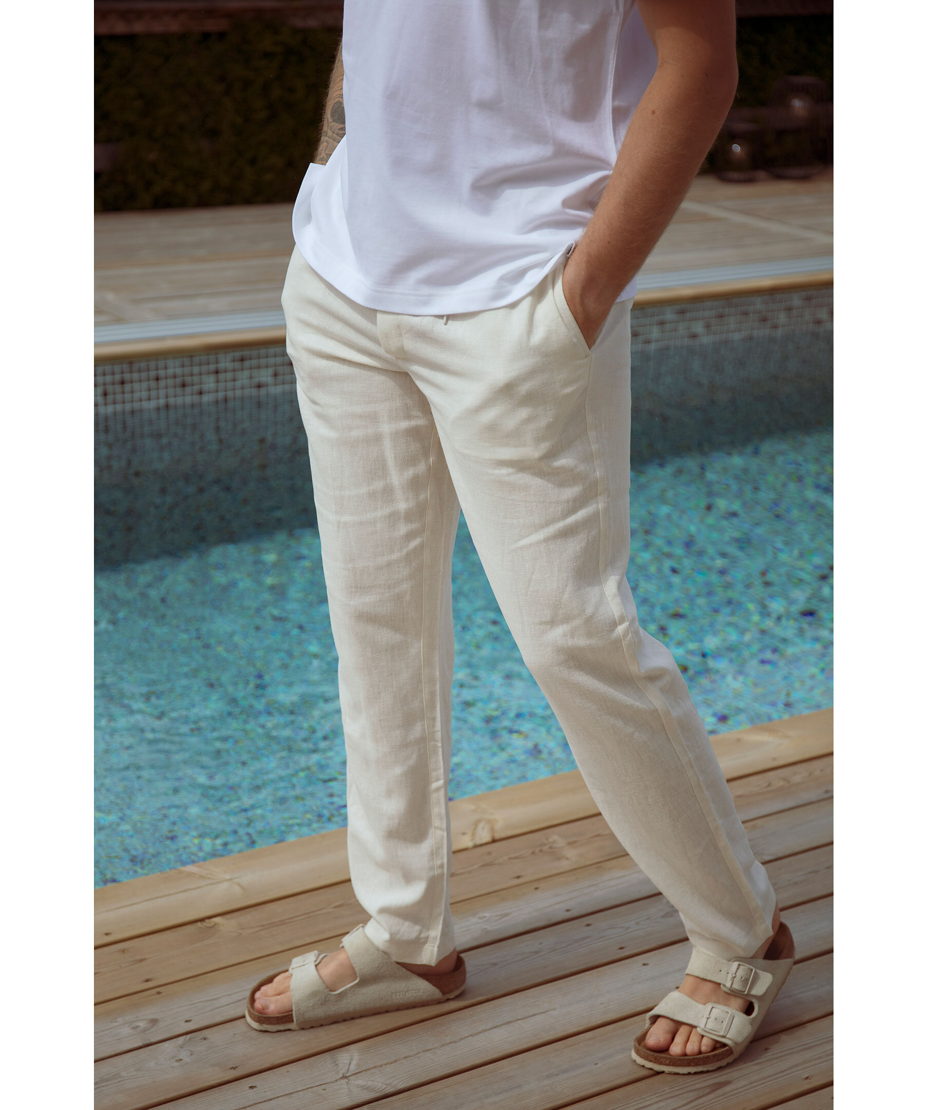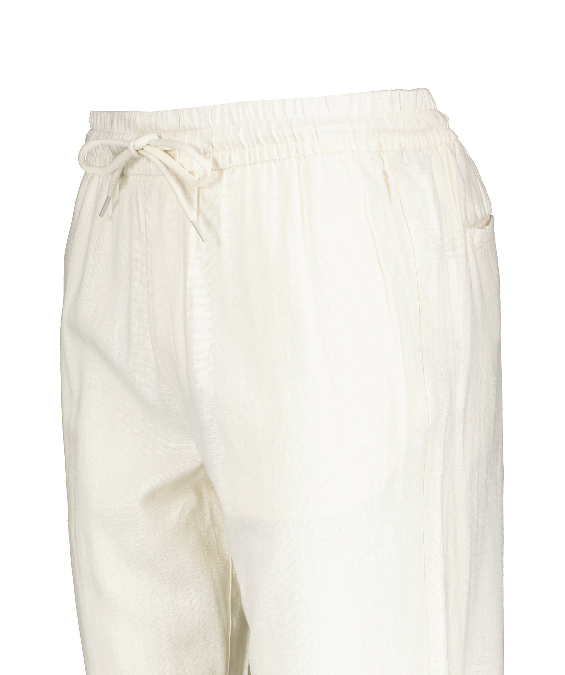 Krämvita Linnebyxor från Les Deux. Elastisk band och dragsko i midjan. Två fickor framtill, två bakfickor. Broderad logotyp över högerbakficka. Tillverkad i 55% Linne, 45% Viskos. Avslappnad passform med vida ben. Innerbenslängden på storlek M är 86cm.