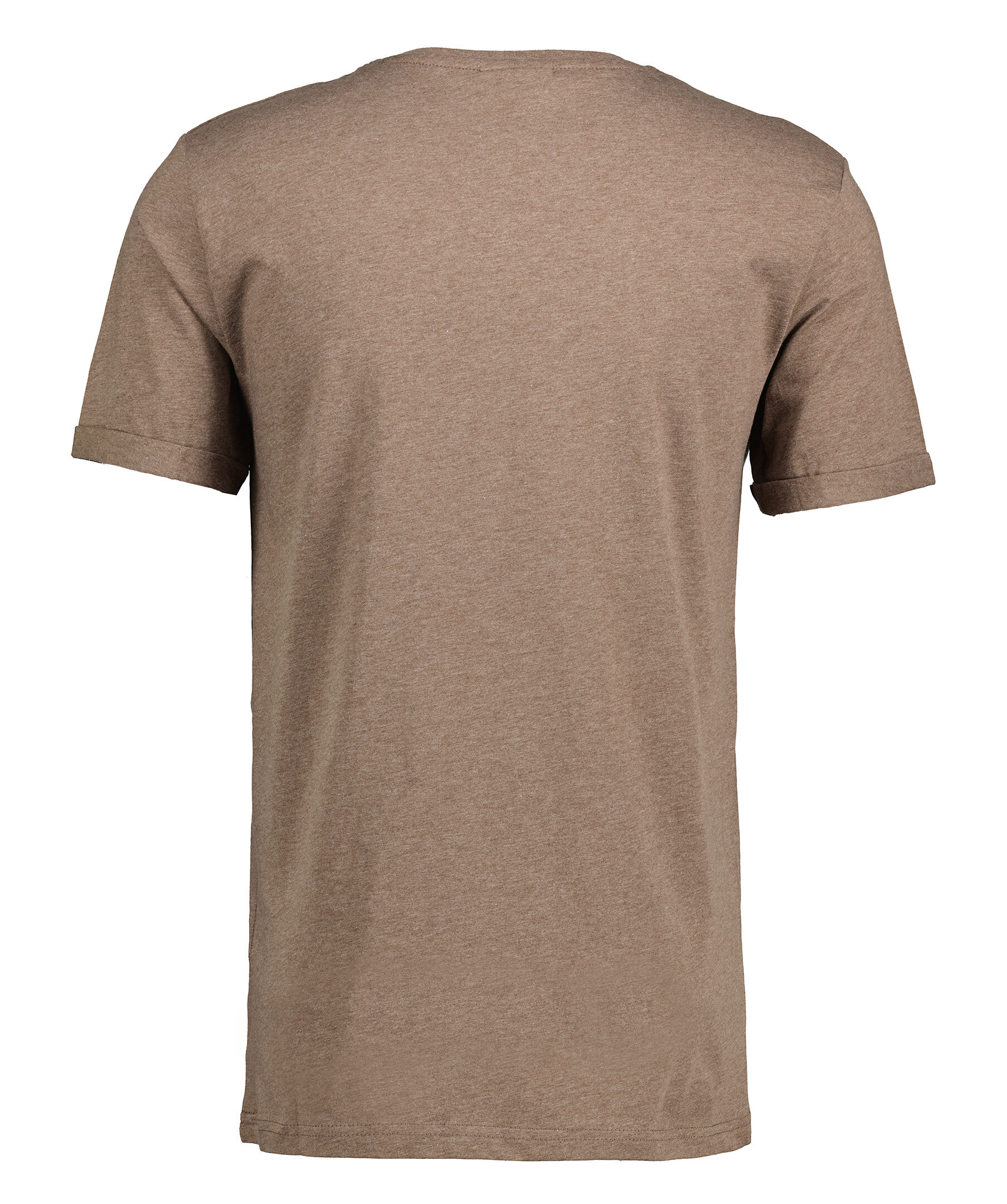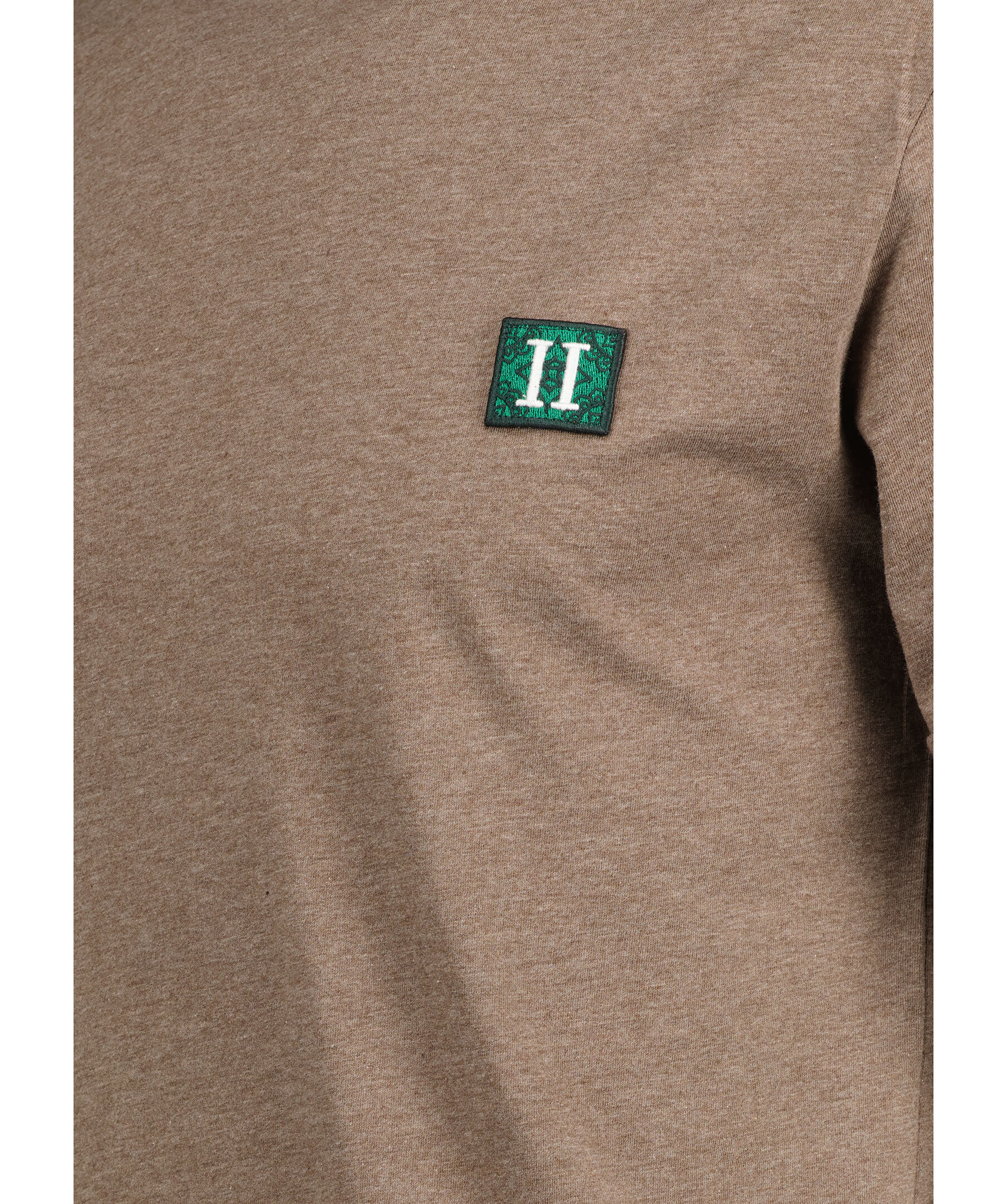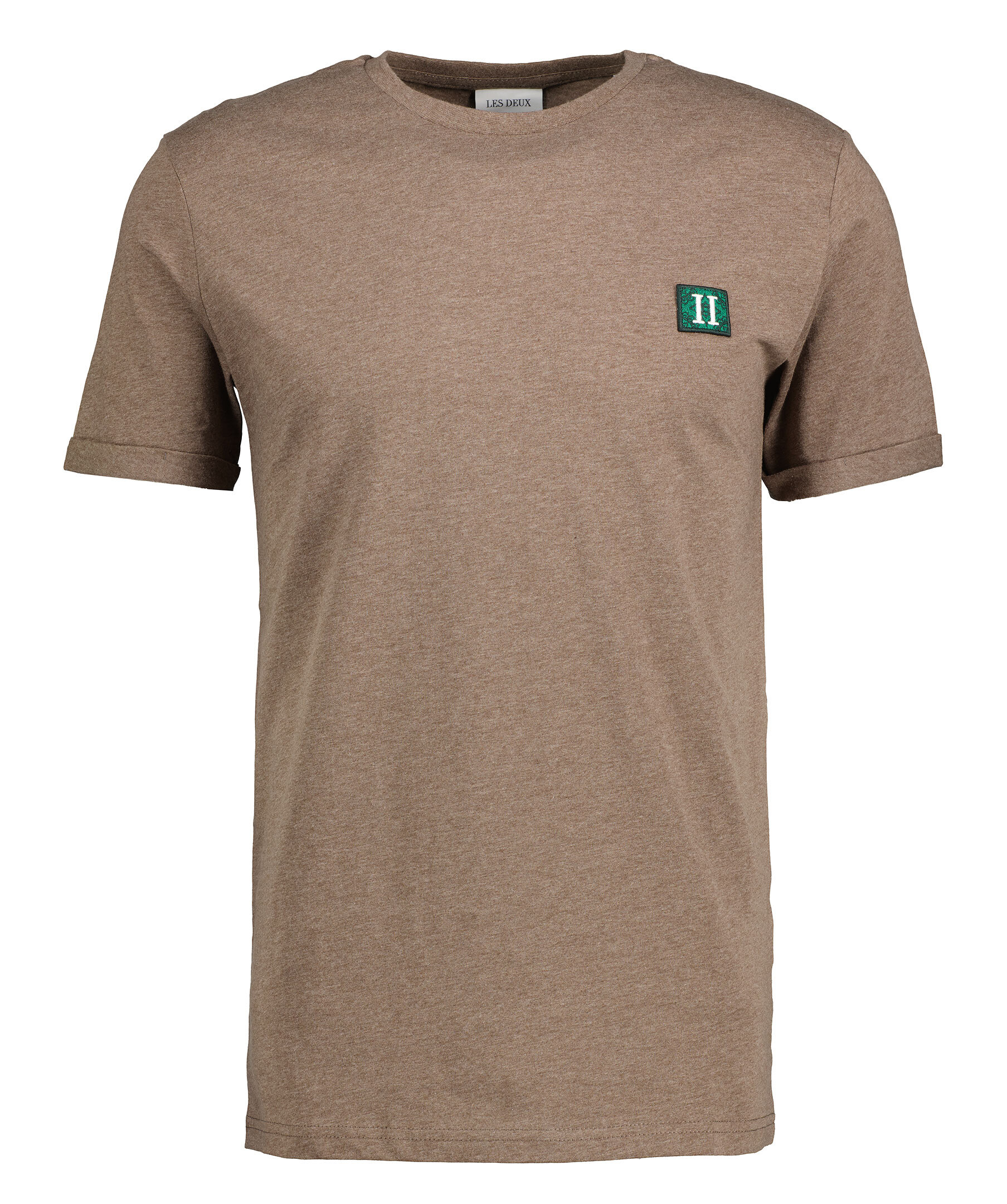 Brun, melerad t-shirt från Les Deux. T-shirten har rund, ribbstickad halsringning, uppvikt kant i ärmslut och liten patch-logotyp på bröstet. Tillverkad i bomull.