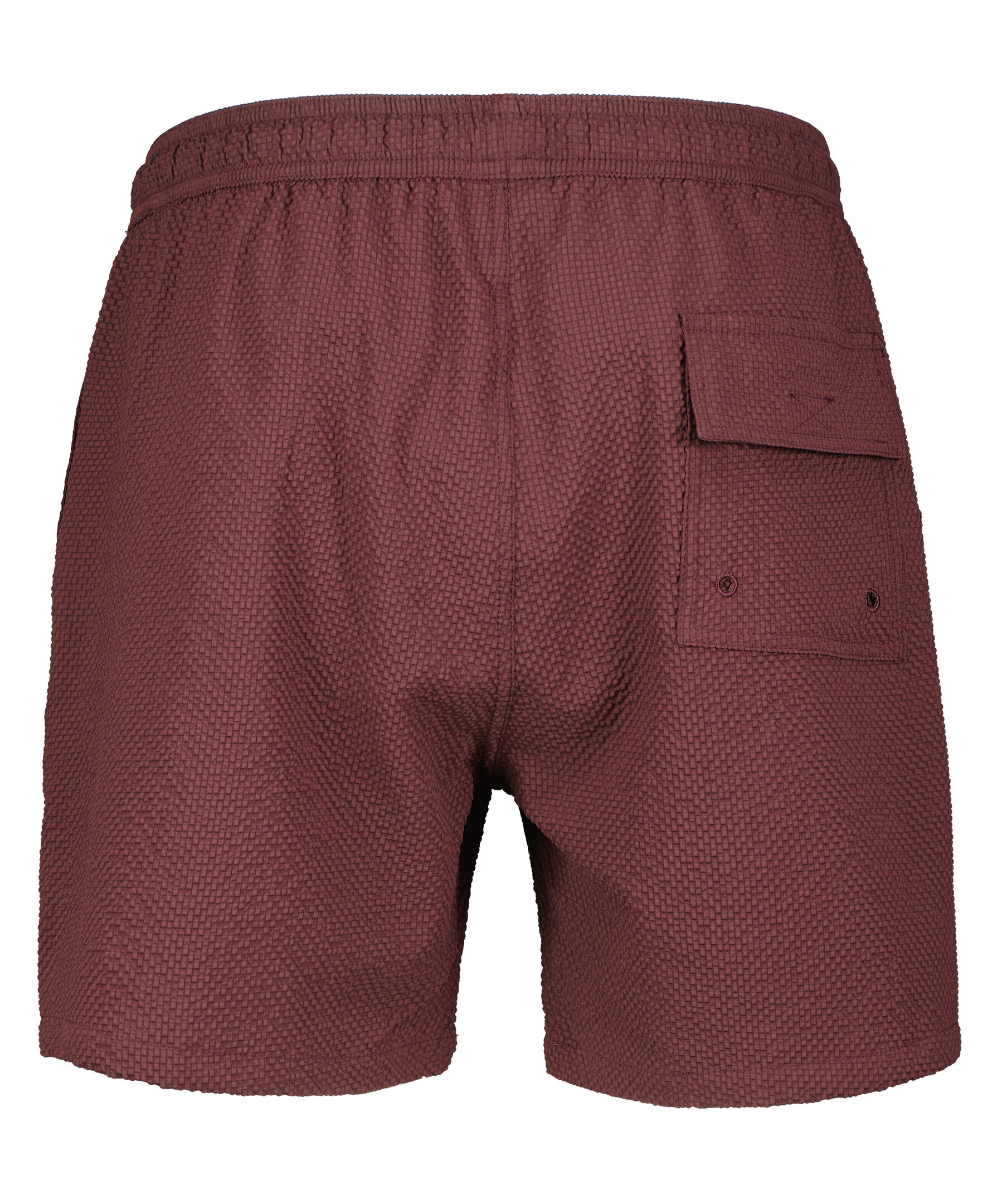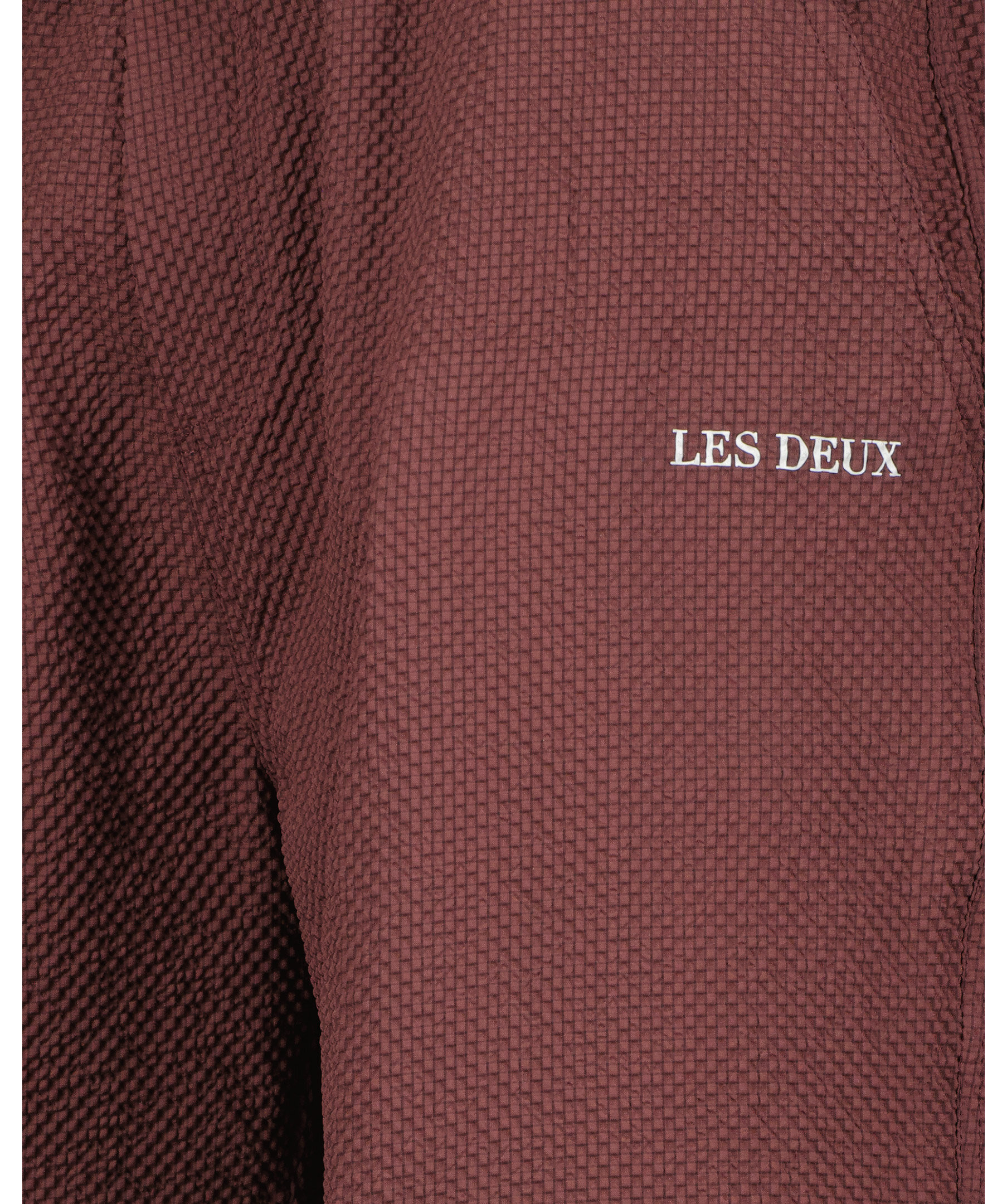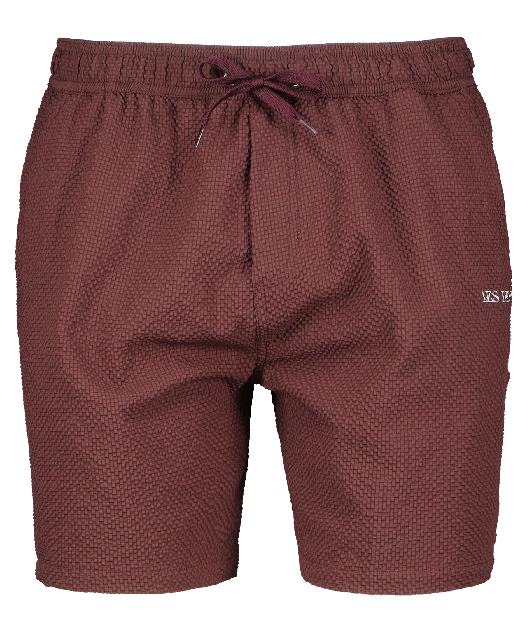 Vinröda badshorts från Les Deux. Tillverkade i ett texturerat material. Resår och dragsko i midjan. Två fickor framtill, en bakficka med lock som stängs med kardborre. Tryckt logotyp på vänster lår.