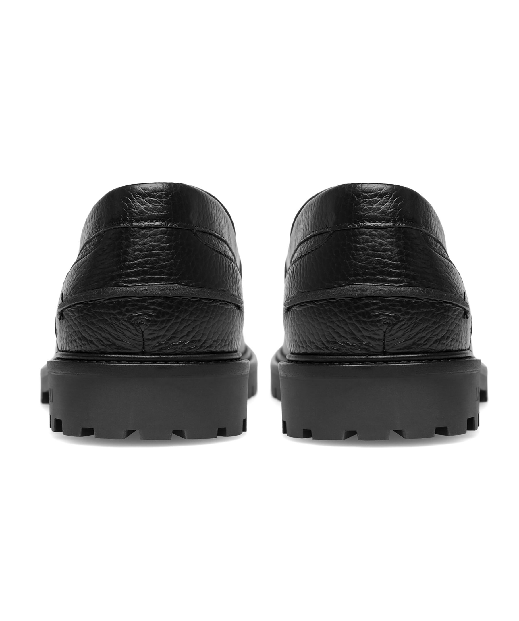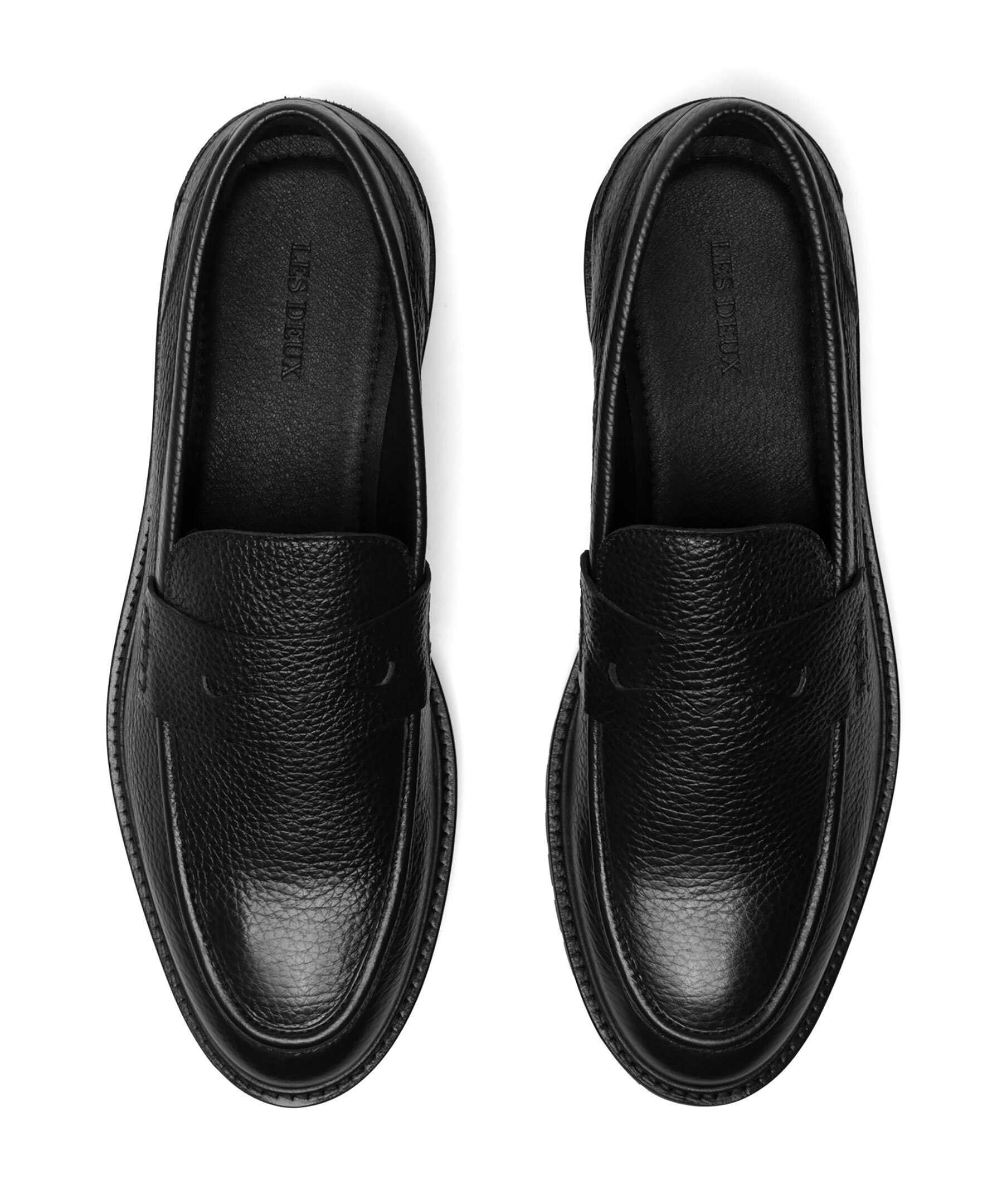 Svarta loafers i läder från Les Deux. Grov sula i gummi. Dekorativ rem över plösen med traditionell cut out med dekorativa sömmar. Embossad logotyp på sulans yttersida.