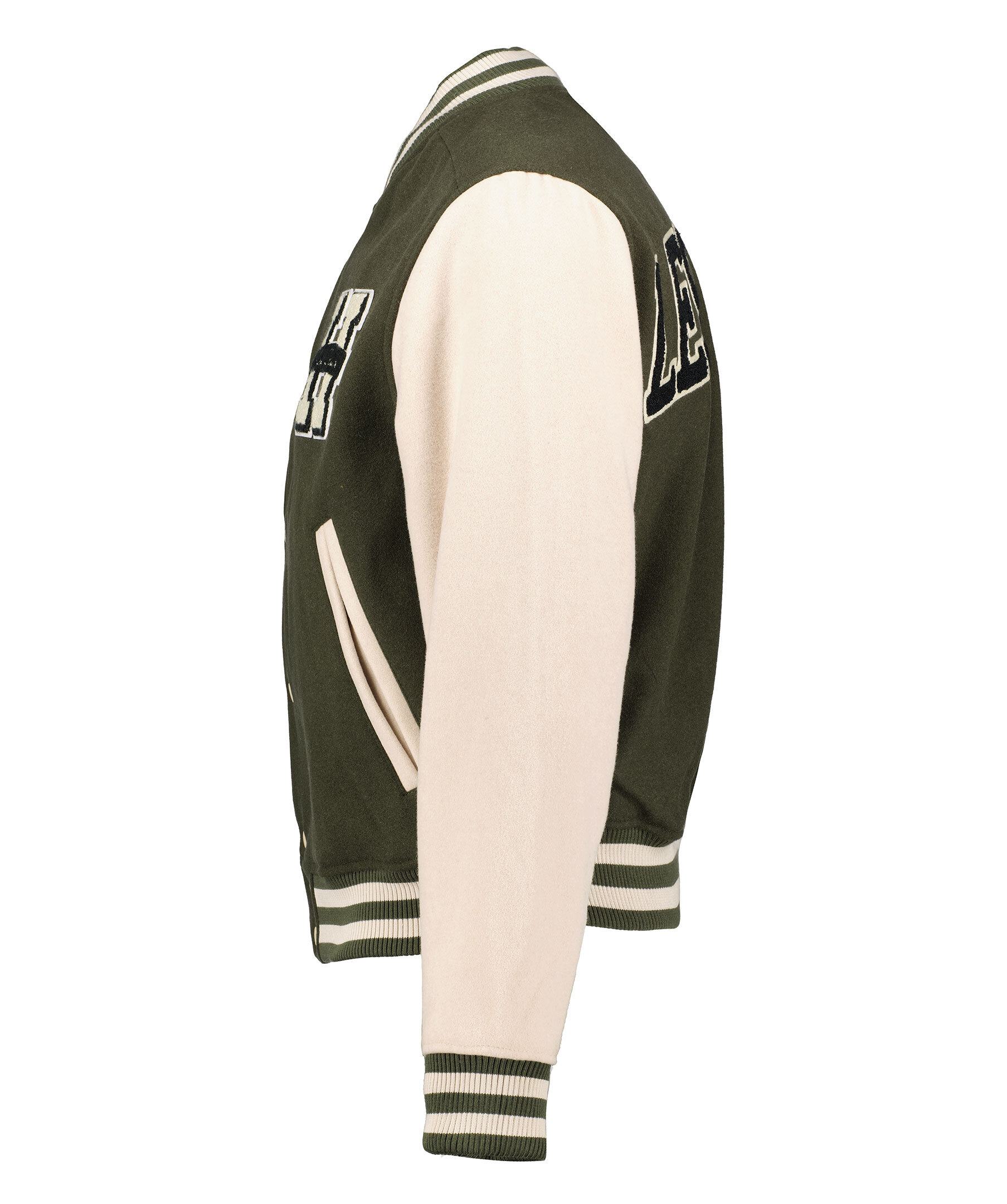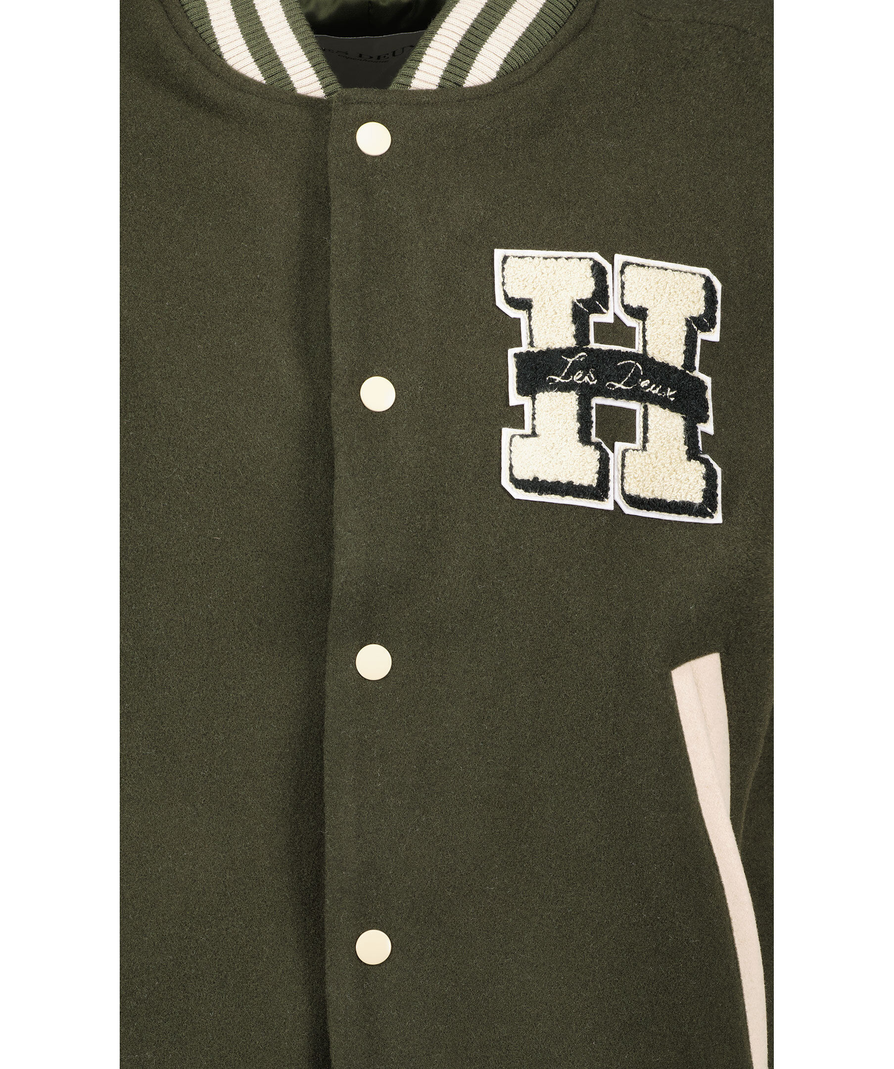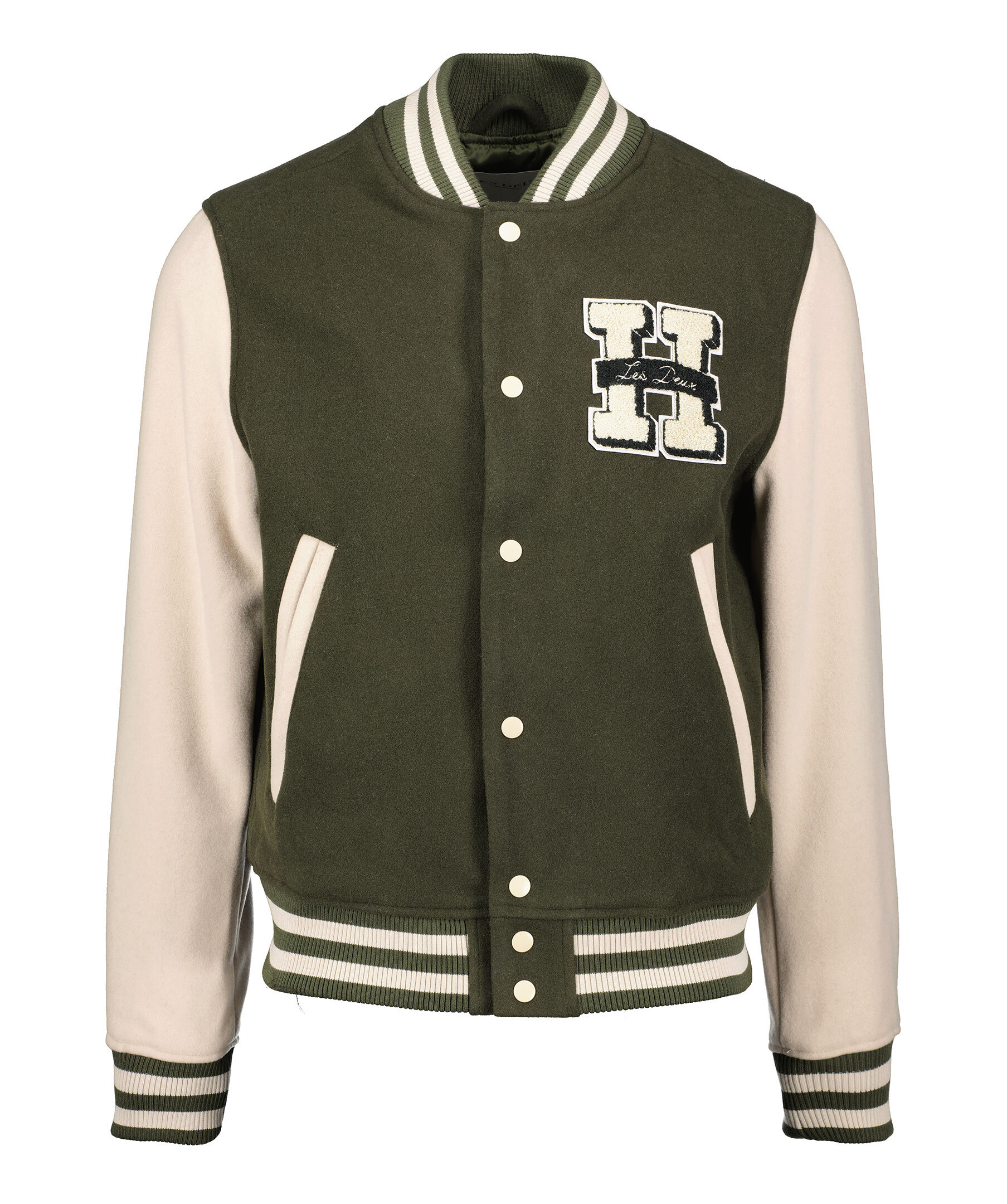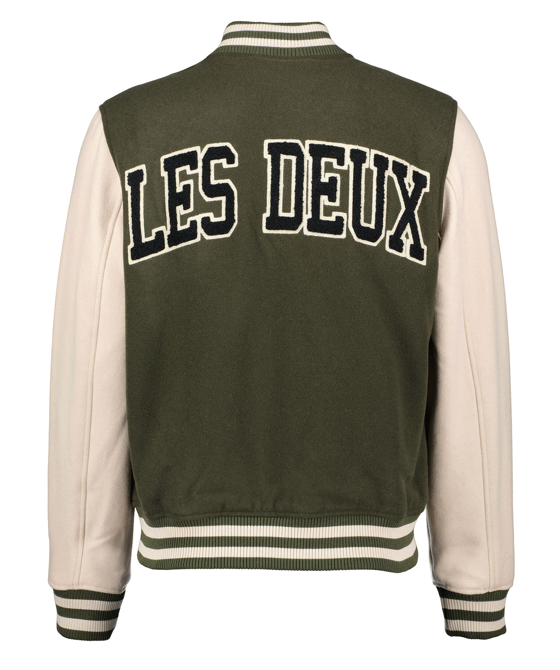 Beige och skogsgrön varsity jacka från Les Deux. Stängs framtill med tryckknappar. Två fickor framtill. Randiga ribbstickade muddar vid kragen, ärm- och plaggslut. Patch med froté på vänster bröst och baktill över ryggen. Tillverkad i ullblandning.