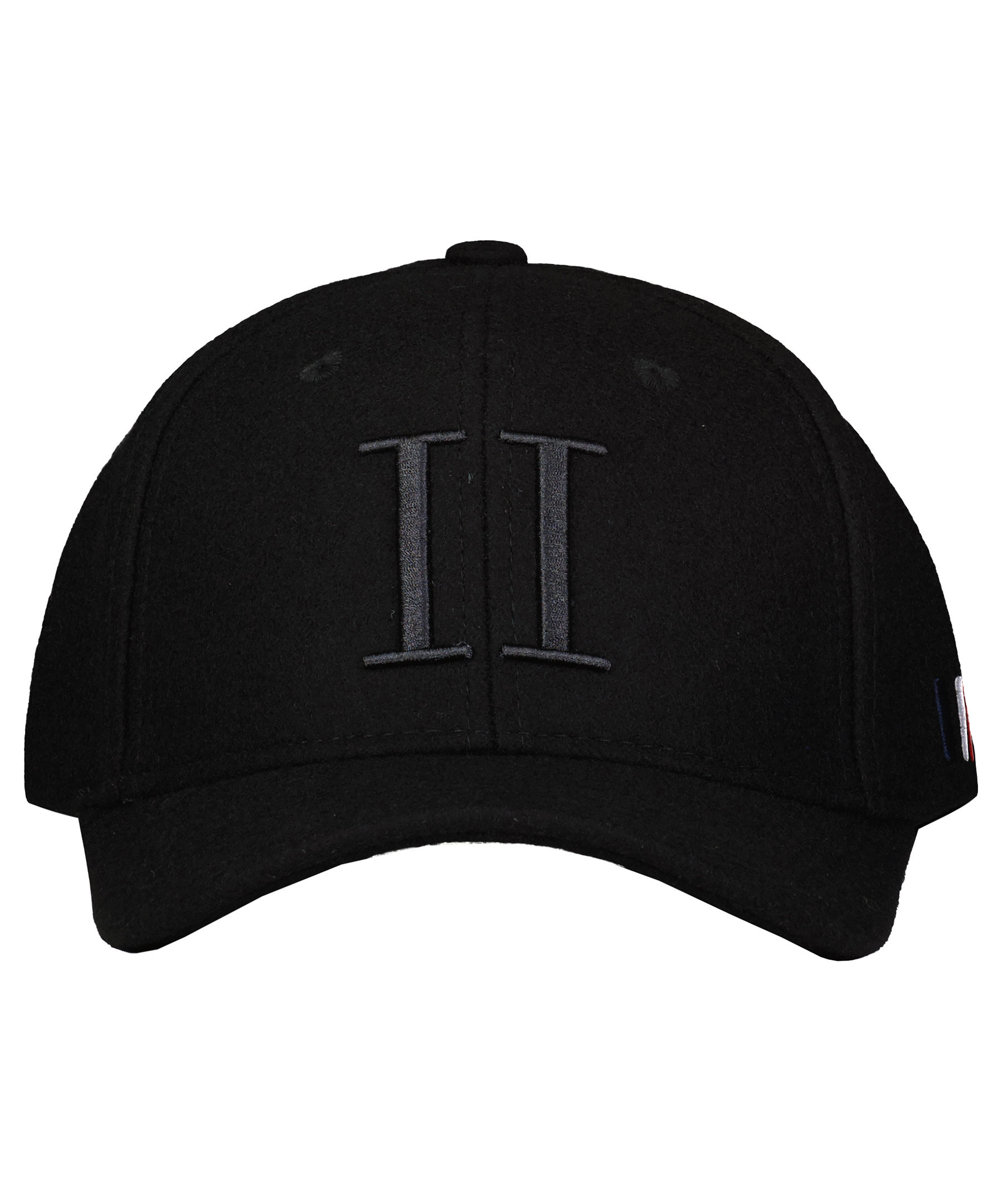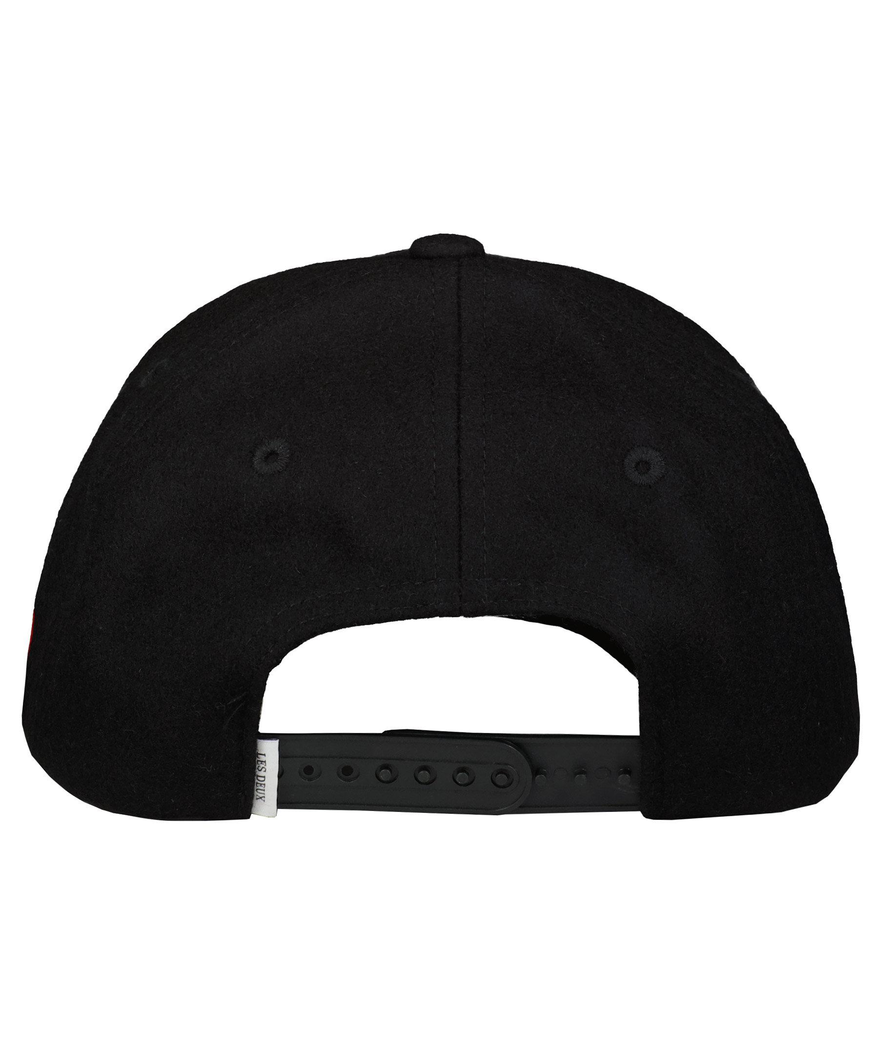Svart keps från Les Deux gjord i ullblandning. Svart, broderad logotyp på framsidan och tre broderade streck i vitt, rött och blått på den vänstra sidan. Justerbart spänne i plast bak med sex olika lägen.