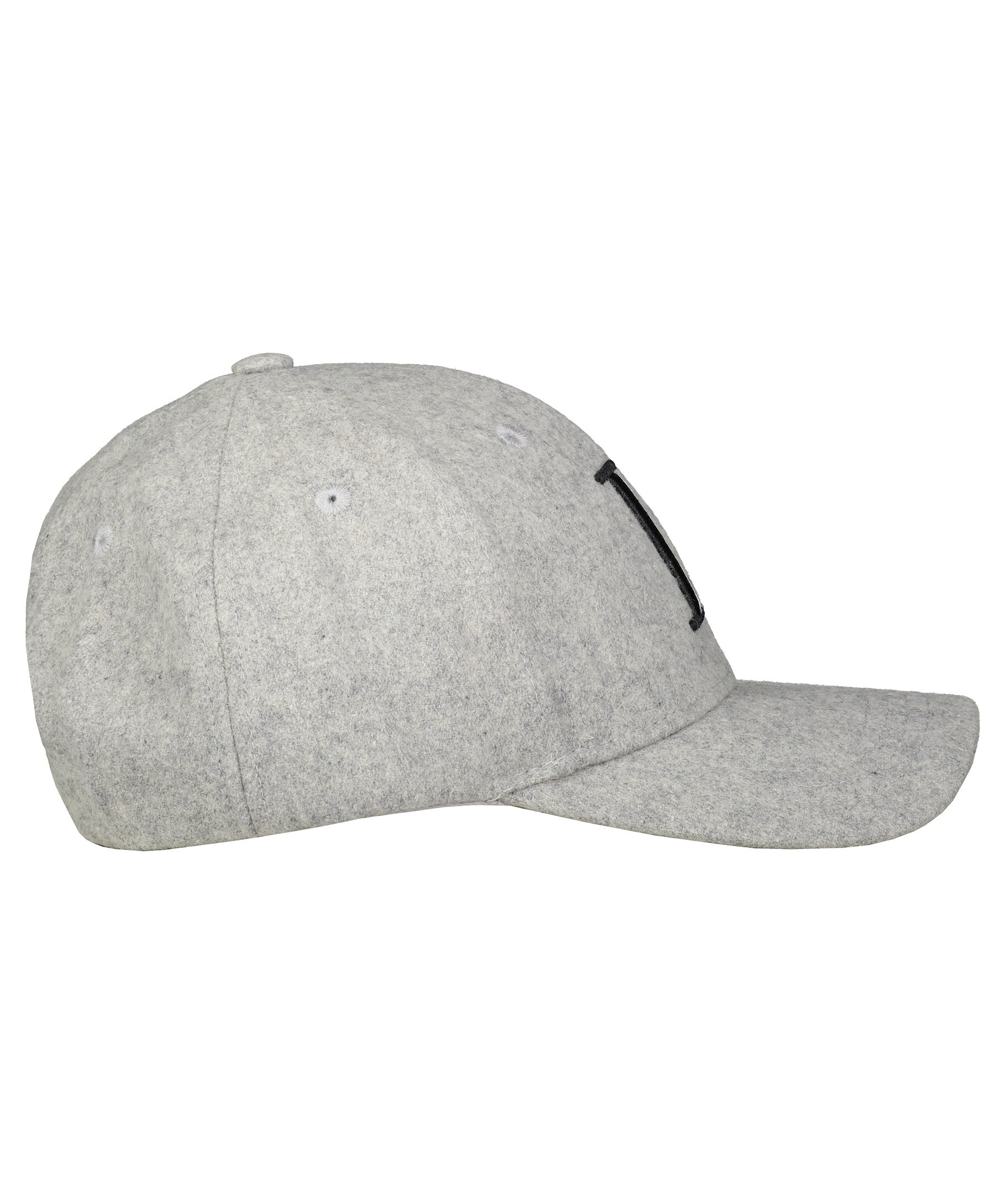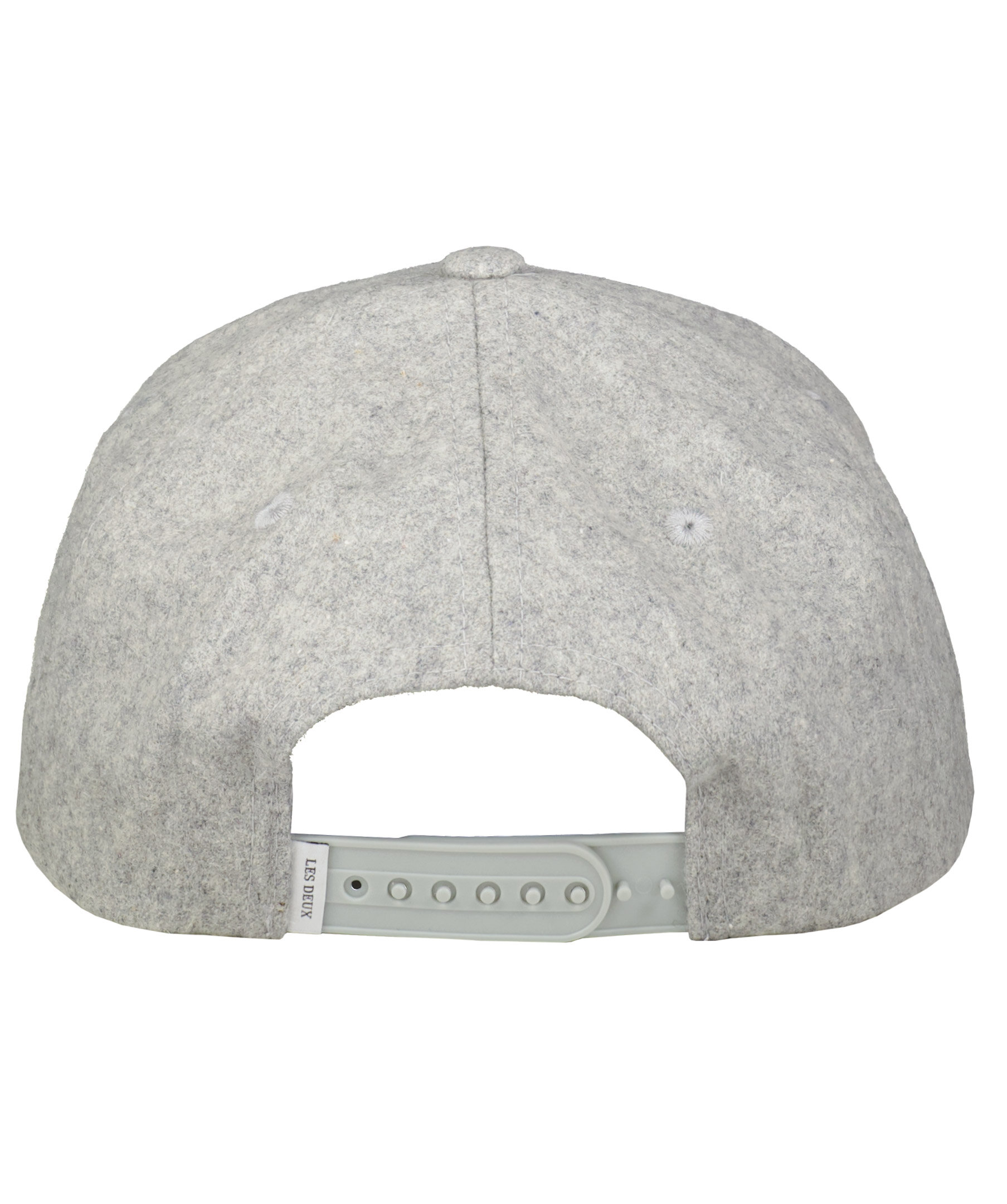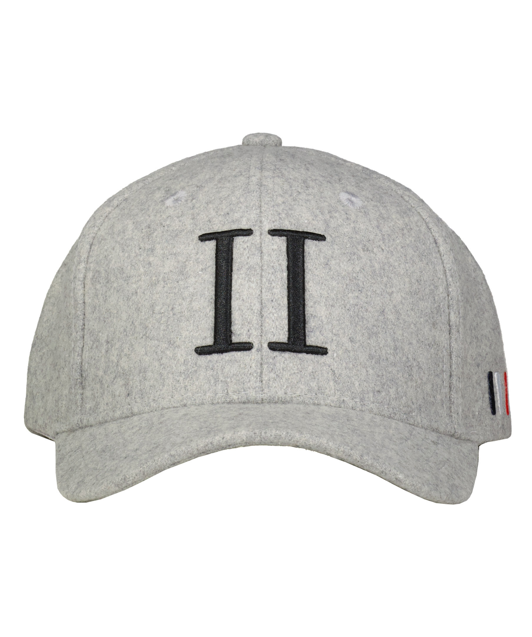 Ljusgrå, melerad keps från Les Deux gjord i ullblandning. Svart, broderad logotyp på framsidan och tre broderade streck i vitt, rött och blått på den vänstra sidan. Justerbart spänne i plast bak med sex olika lägen.