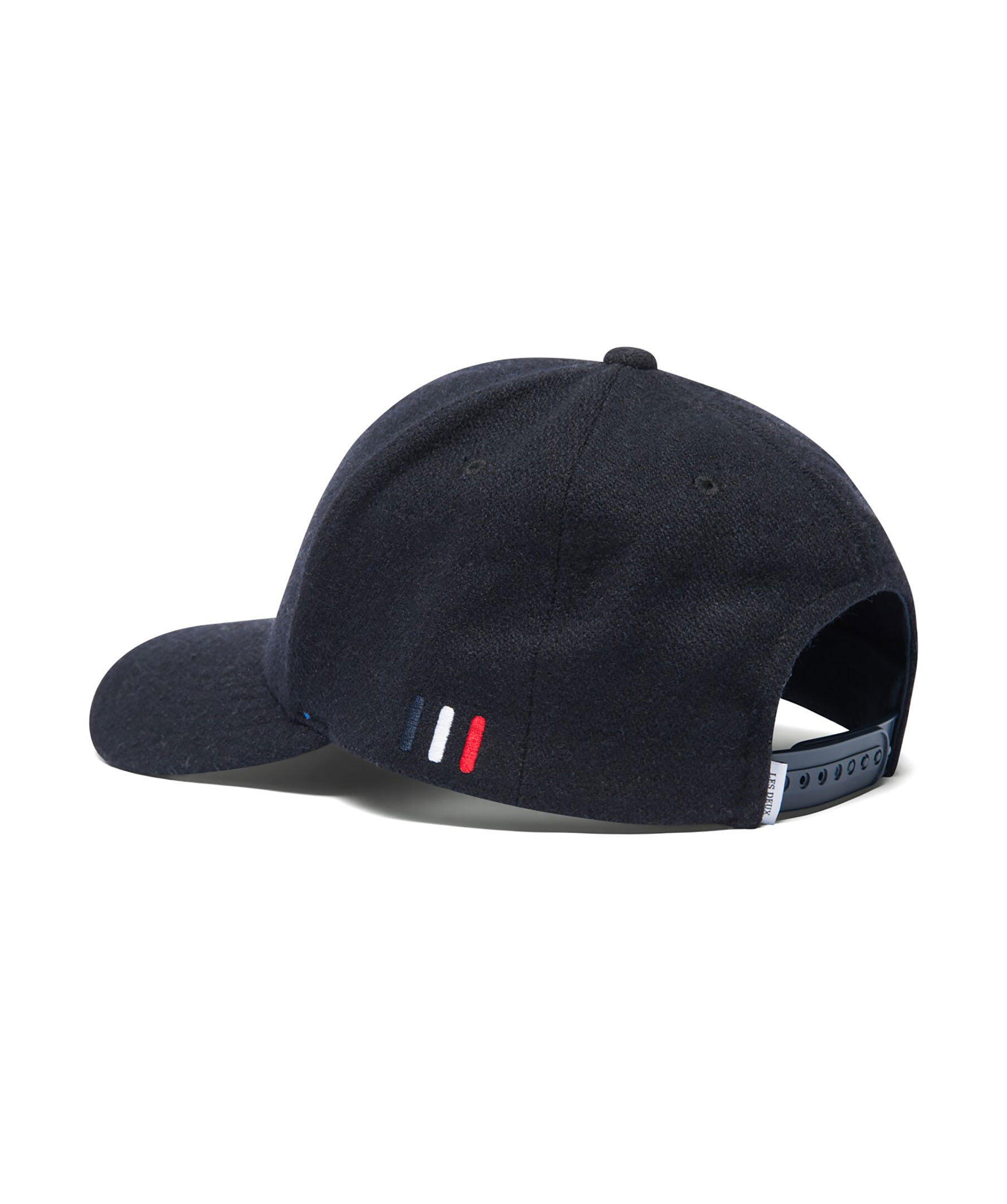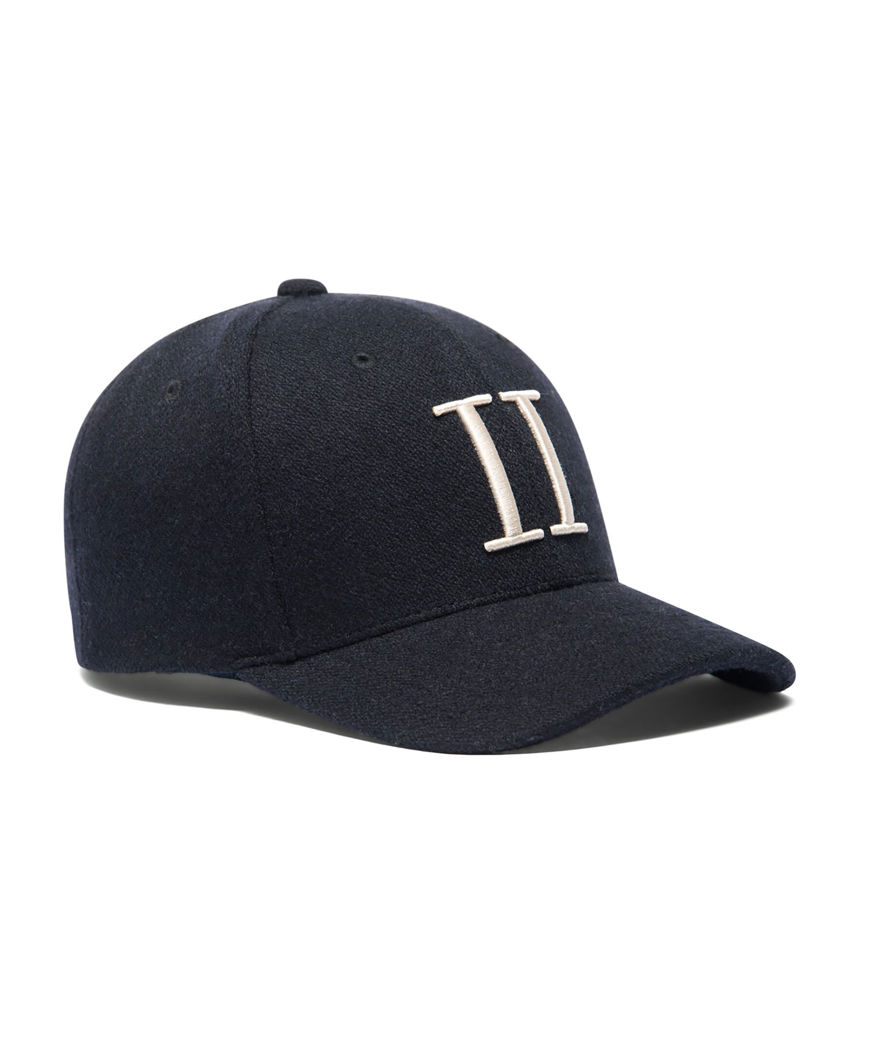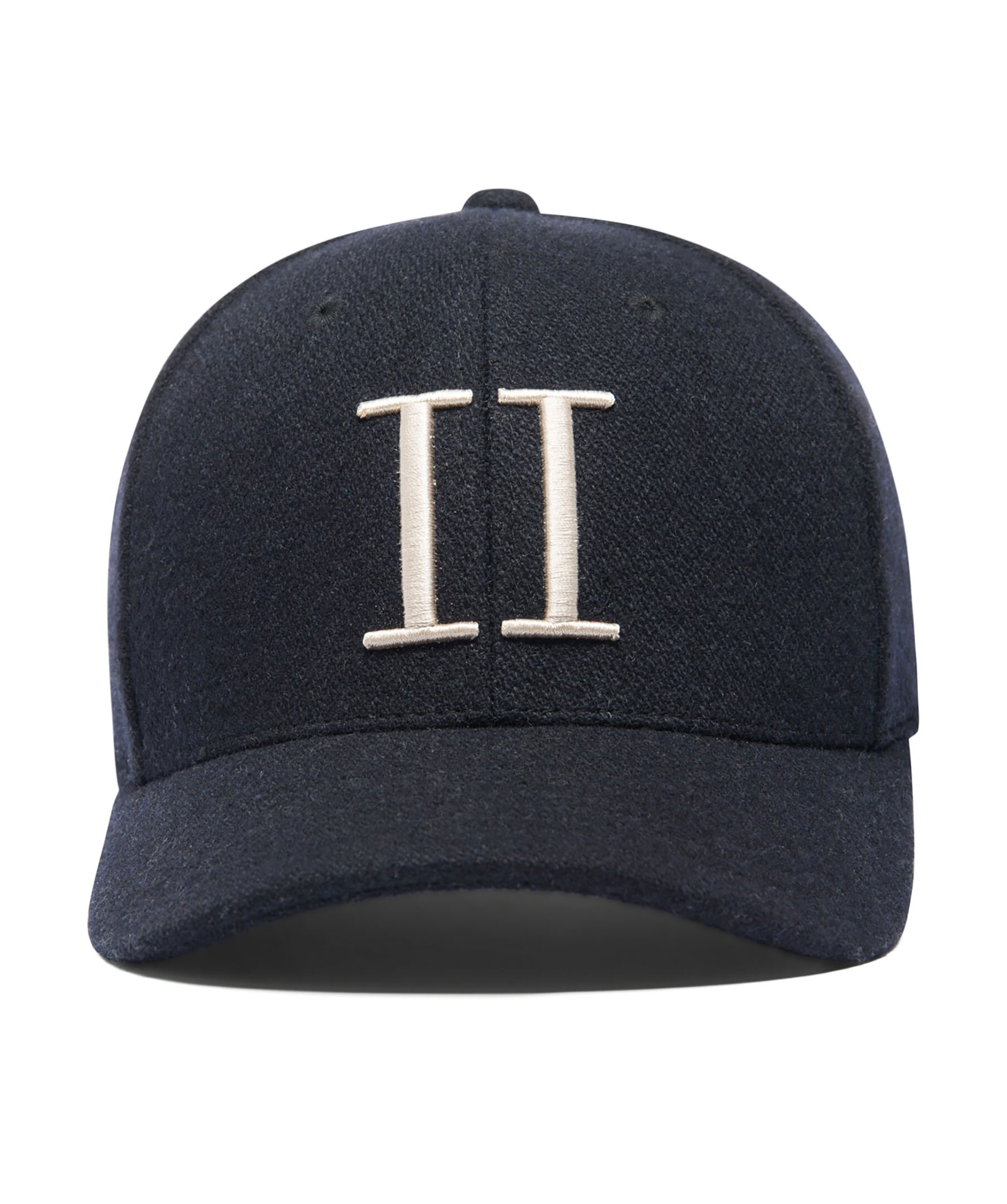 Marinblå keps från Les Deux gjord i ullblandning. Vit, broderad logotyp på framsidan och tre broderade streck i vitt, rött och blått på den vänstra sidan. Justerbart spänne i plast bak med sex olika lägen.