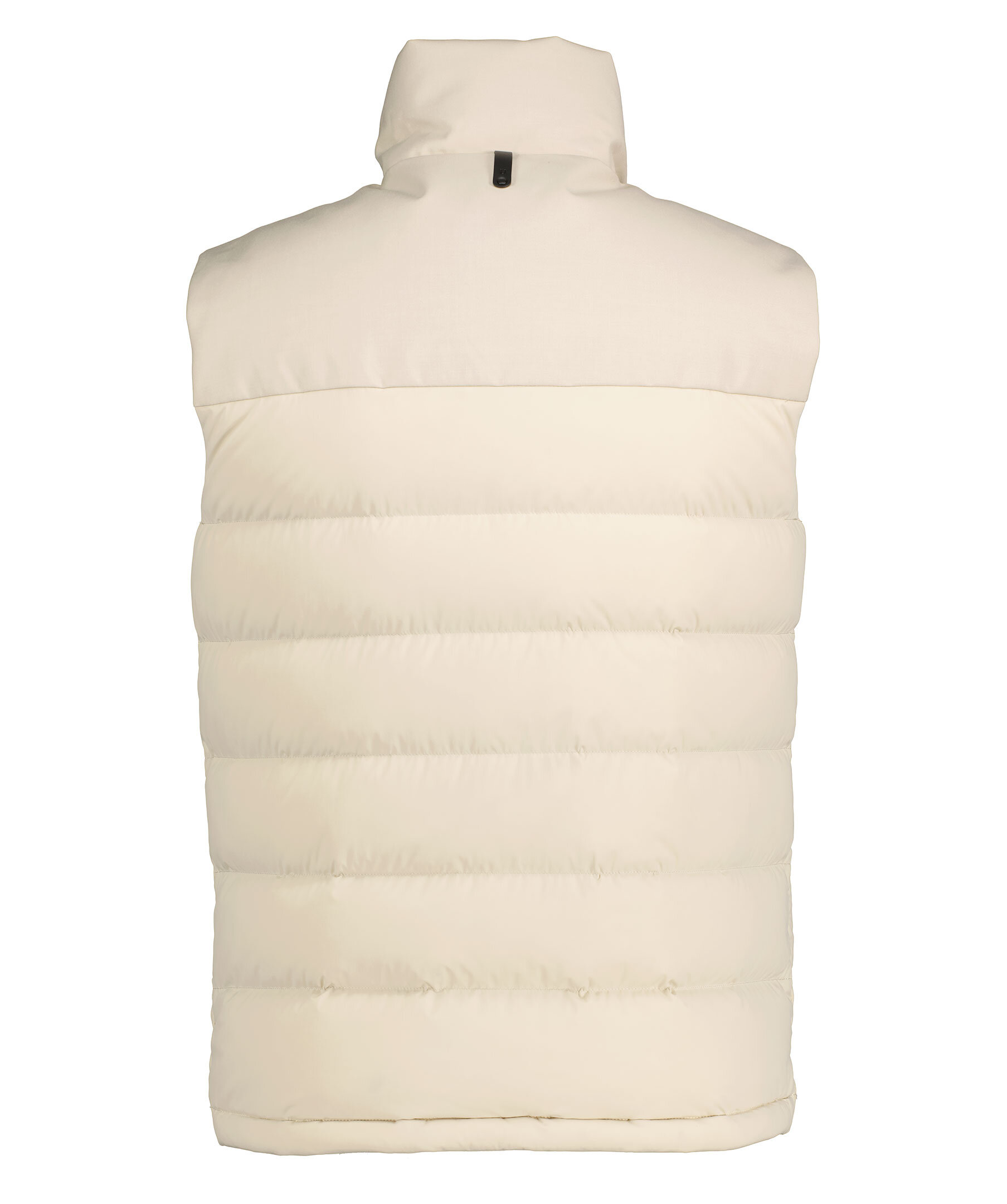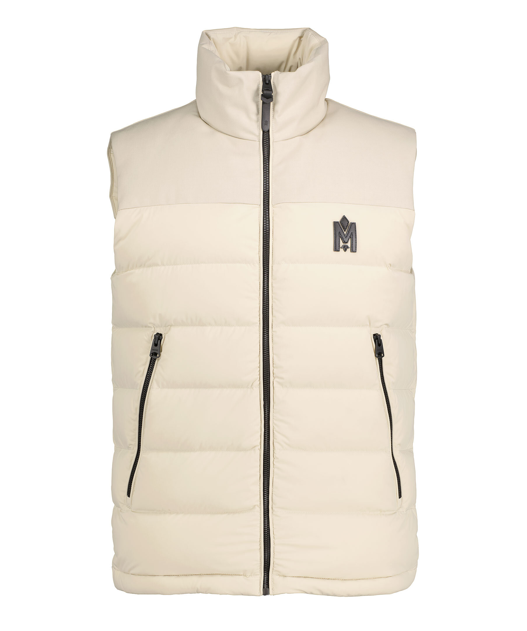 Beige quiltad dunväst från Mackage. Panel med vävt kontrasttyg över bröstet, axlarna och på kragen. Stängs framtill med dragkedja. Logotyp i svart läder på vänster bröst. Innerficka som stängs med dragkedja. Dragsko vid västslut.
