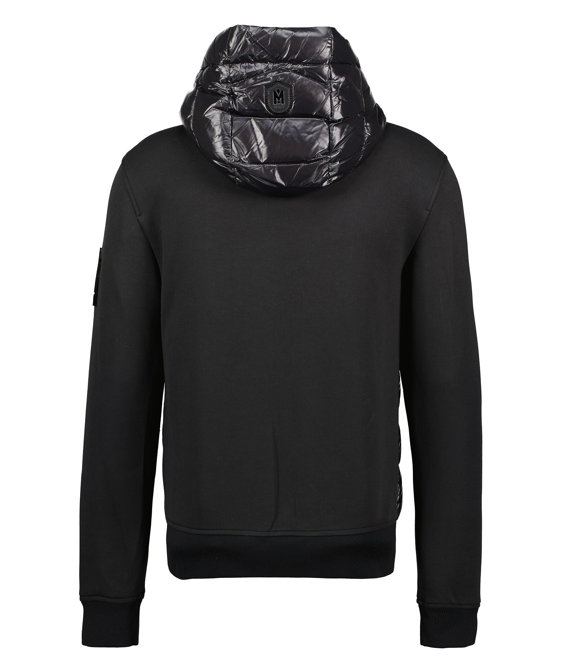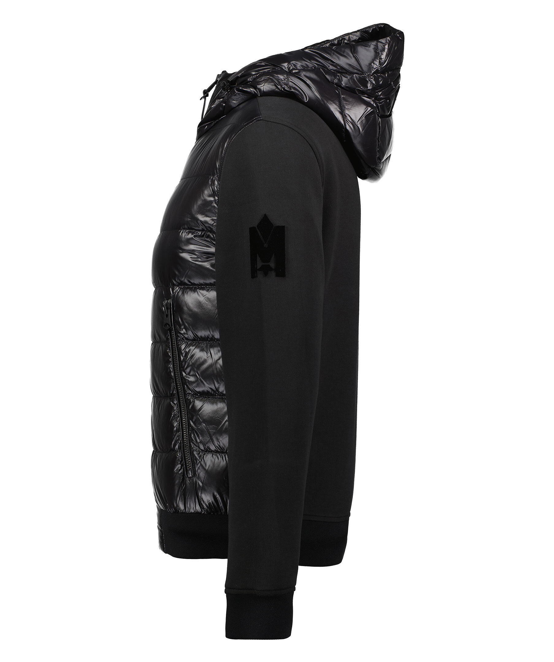 Svart hybridjacka från Mackage med dunfylld panel framtill på jackan, samt luvan. Stängs med dragkedja framtill, snedställda fickor som stängs med dragkedja. Stansad logotyp i textil på vänster ärm. Luva med dragsko. Ribbstickade muddar vid ärm- och plaggslut.