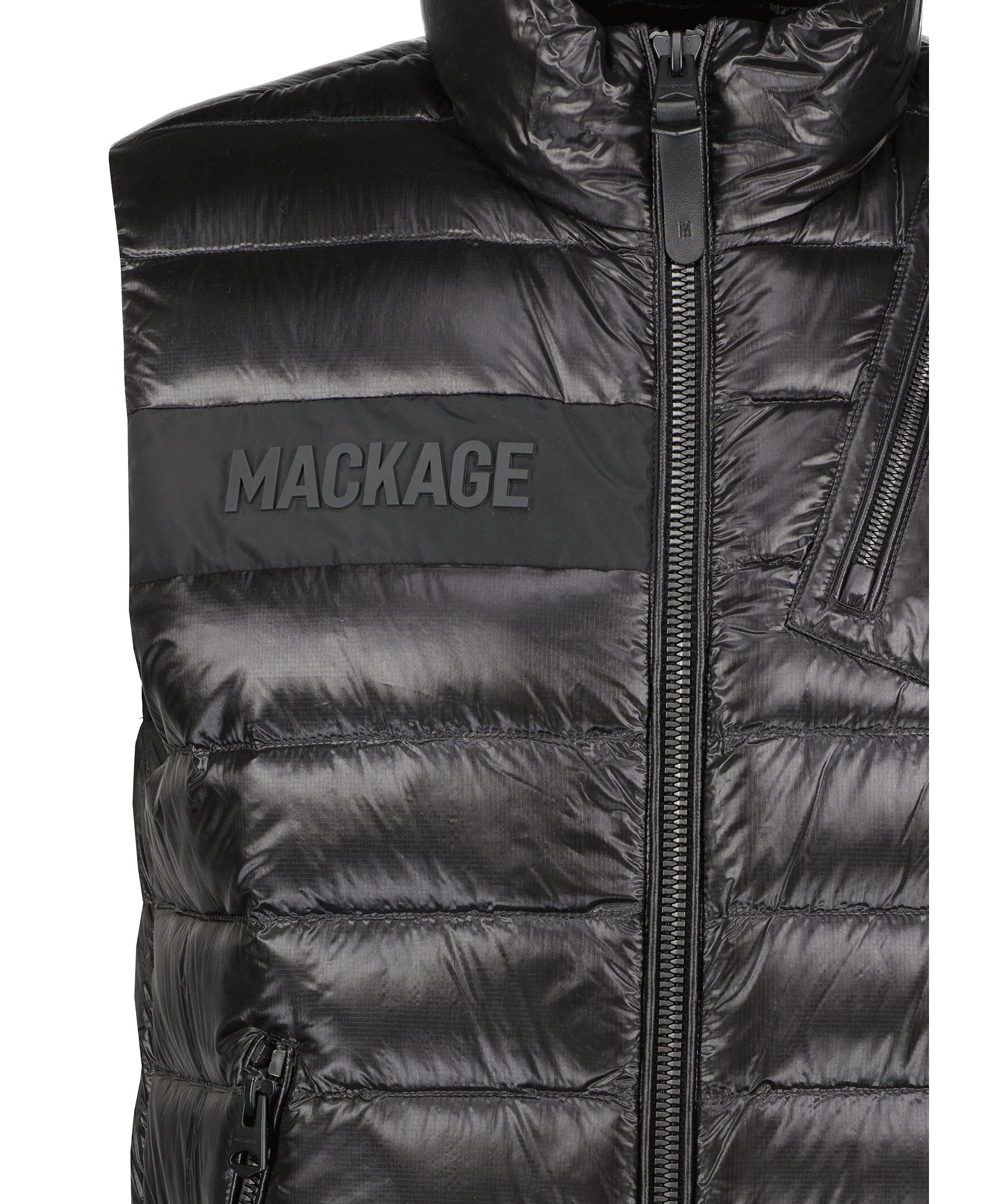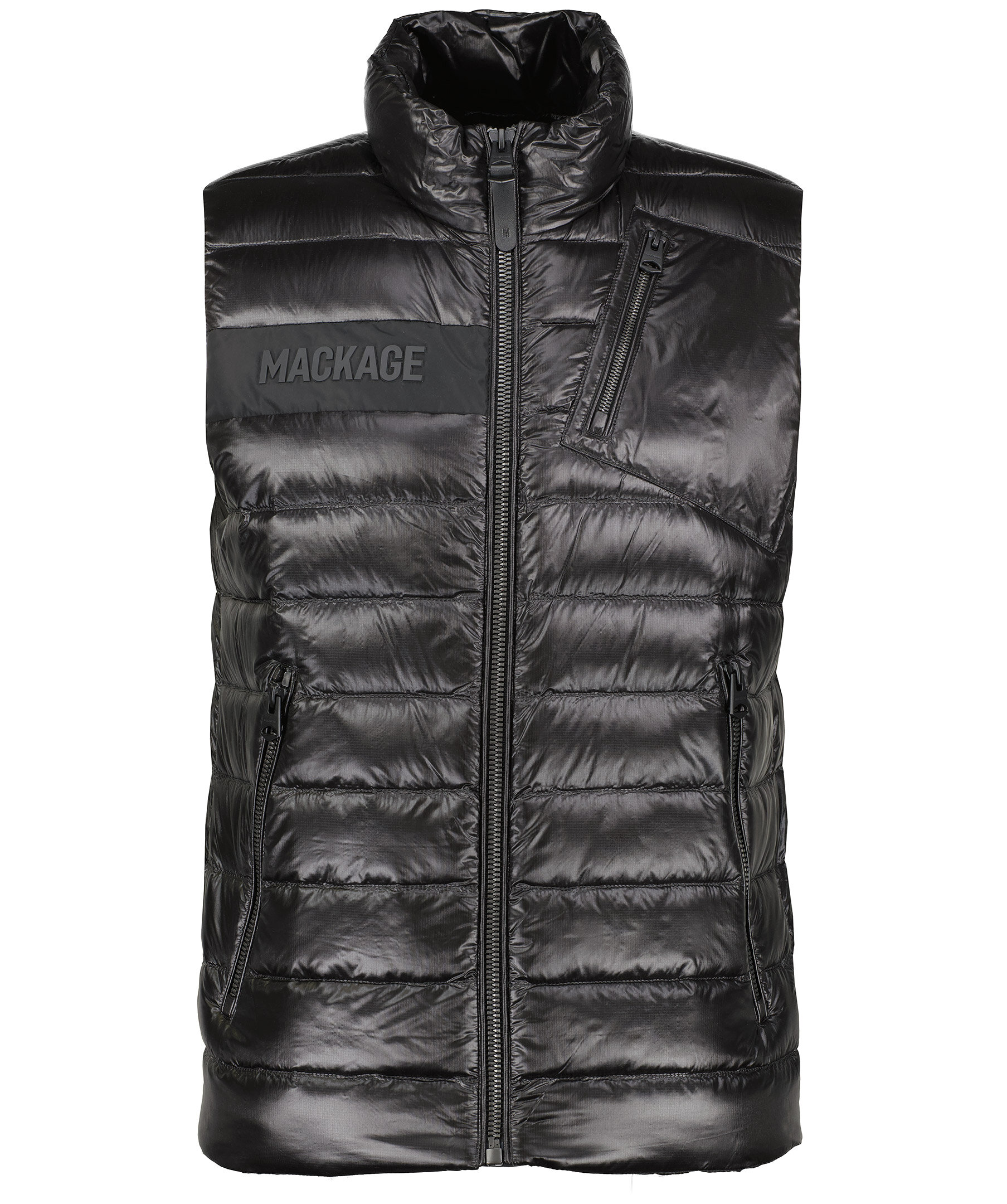 Svart quiltad dunväst från Mackage. Stängs framtill med dragkedja. Bröstficka på vänster sida med dragkedja. Två fickor framtill som stängs med dragkedja. Gummerad logotyp från Mackage på höger bröst.