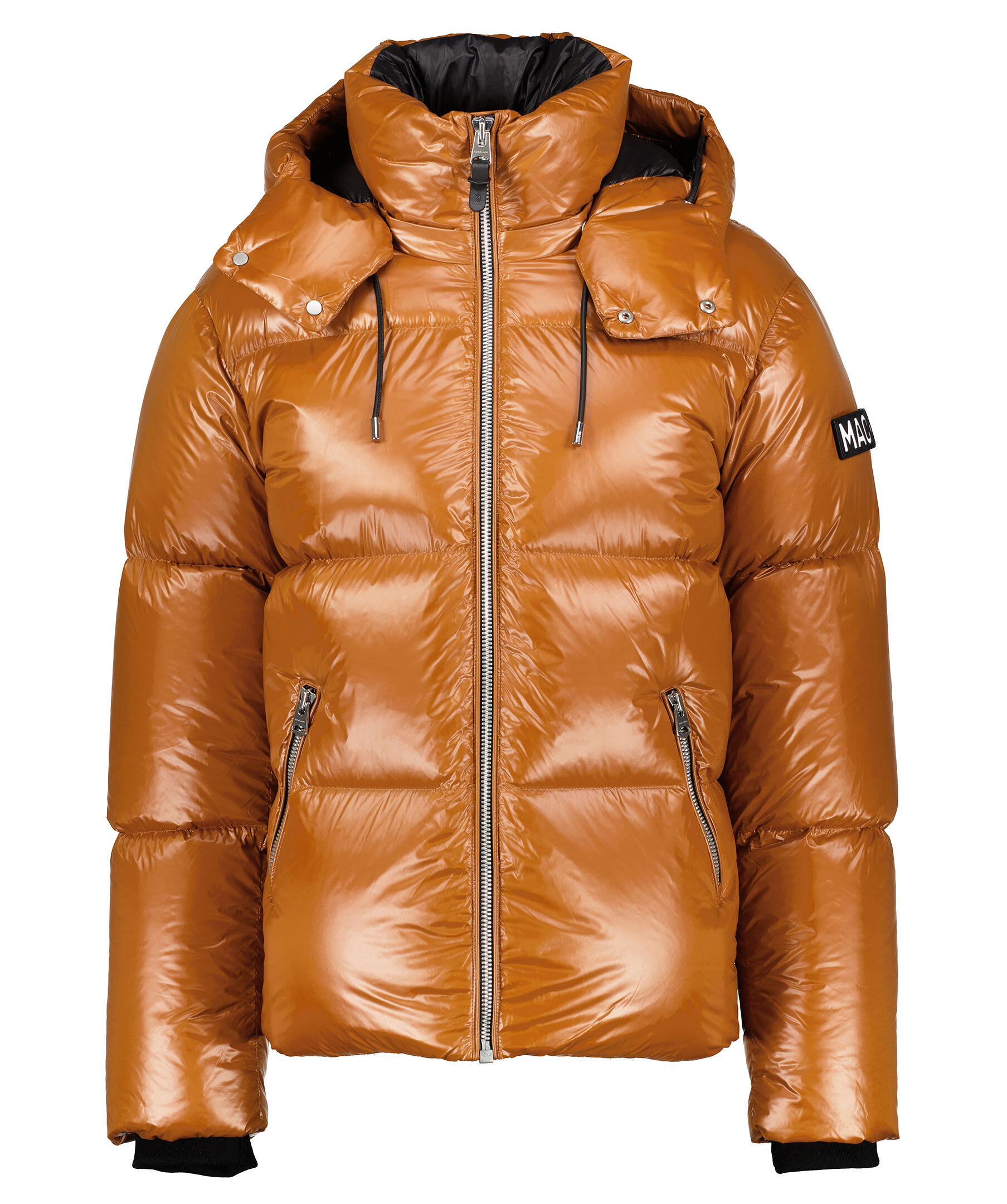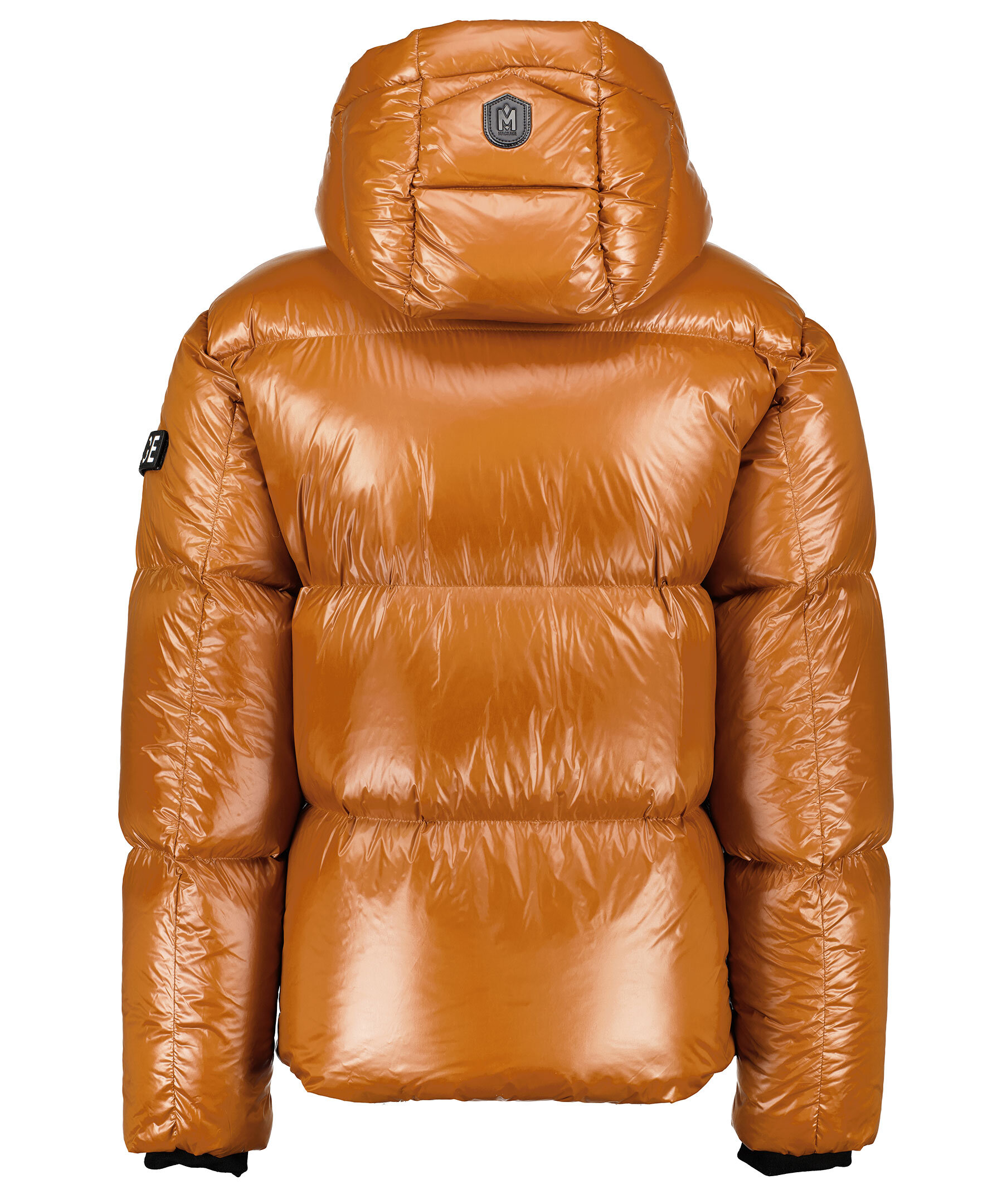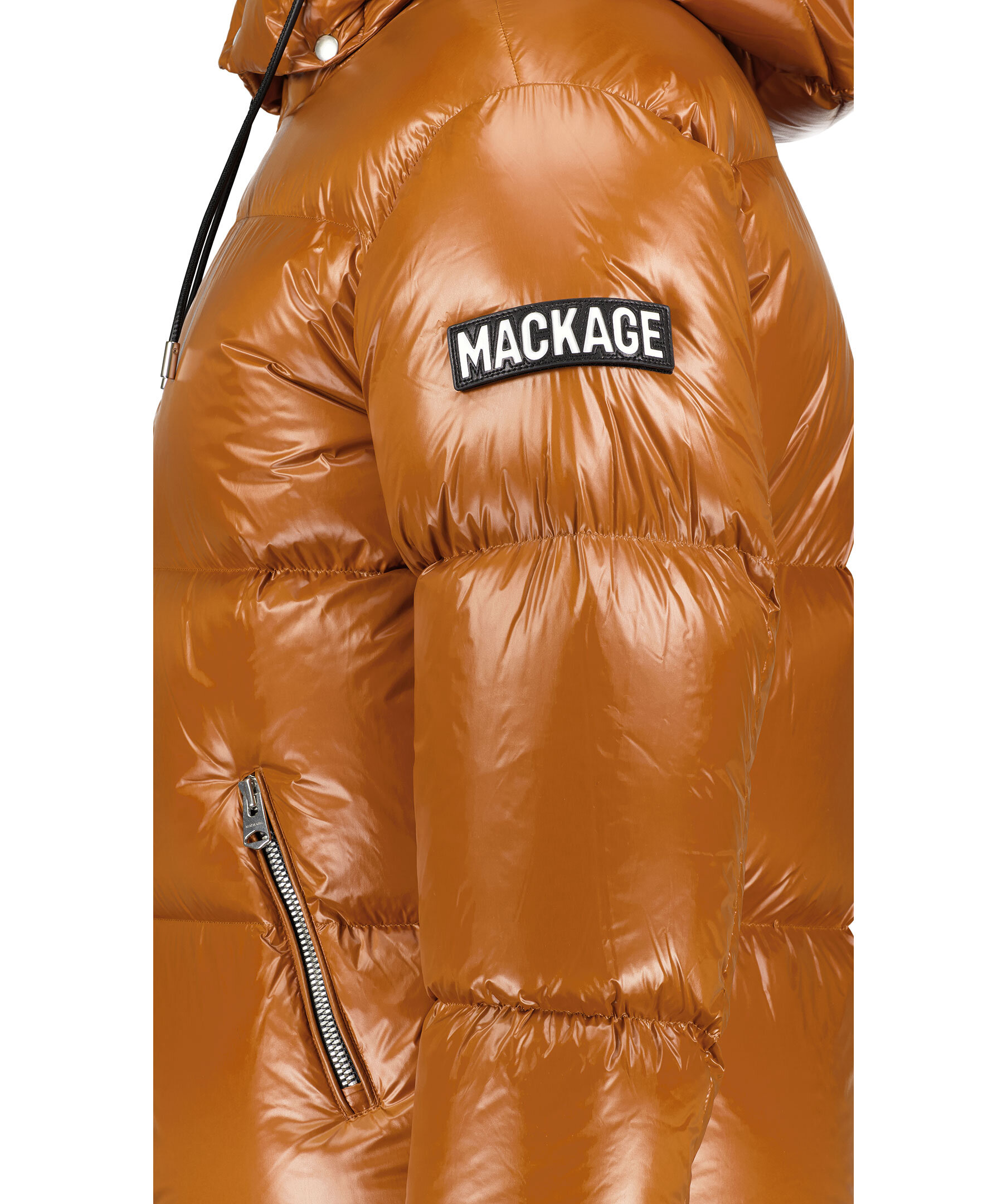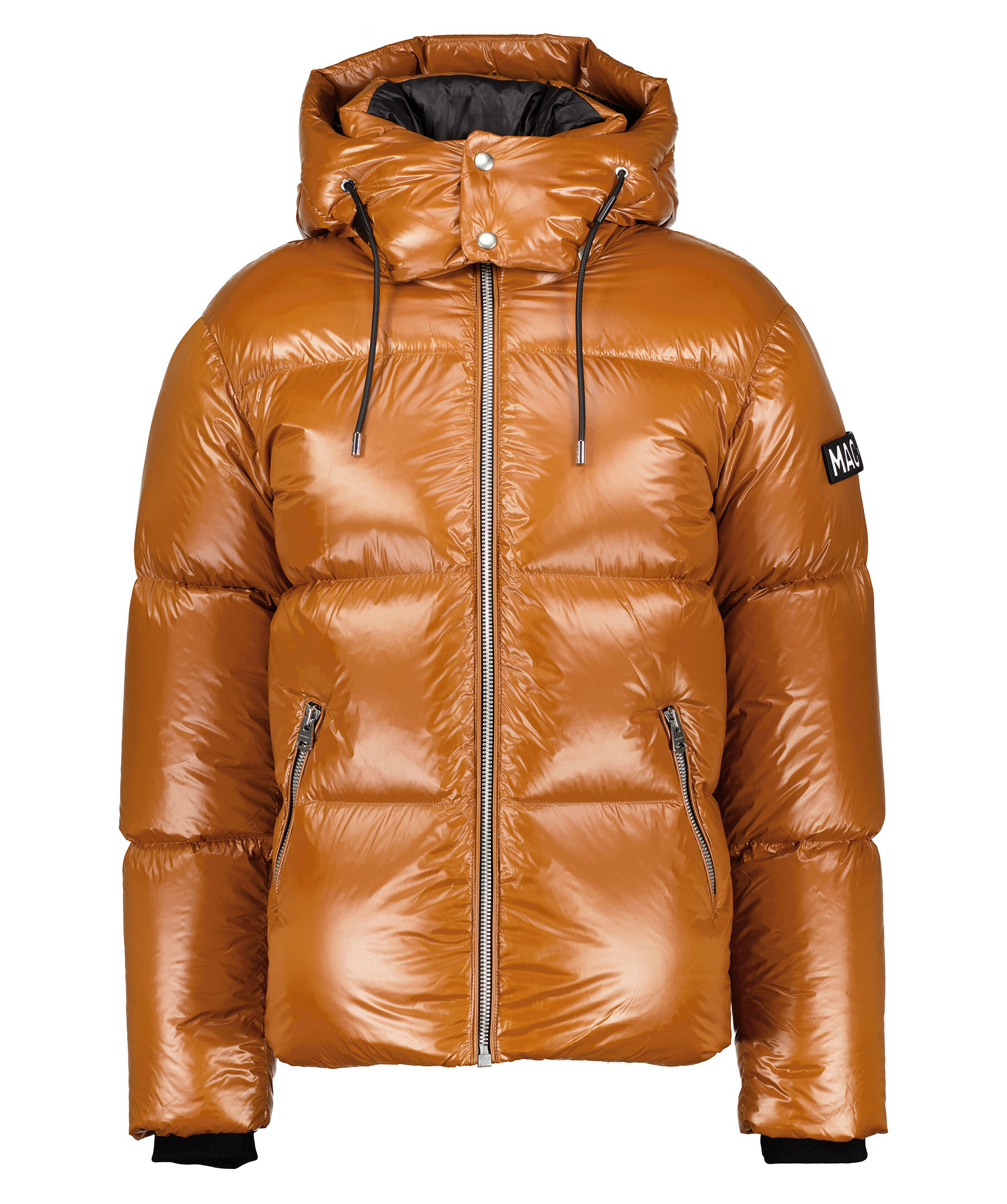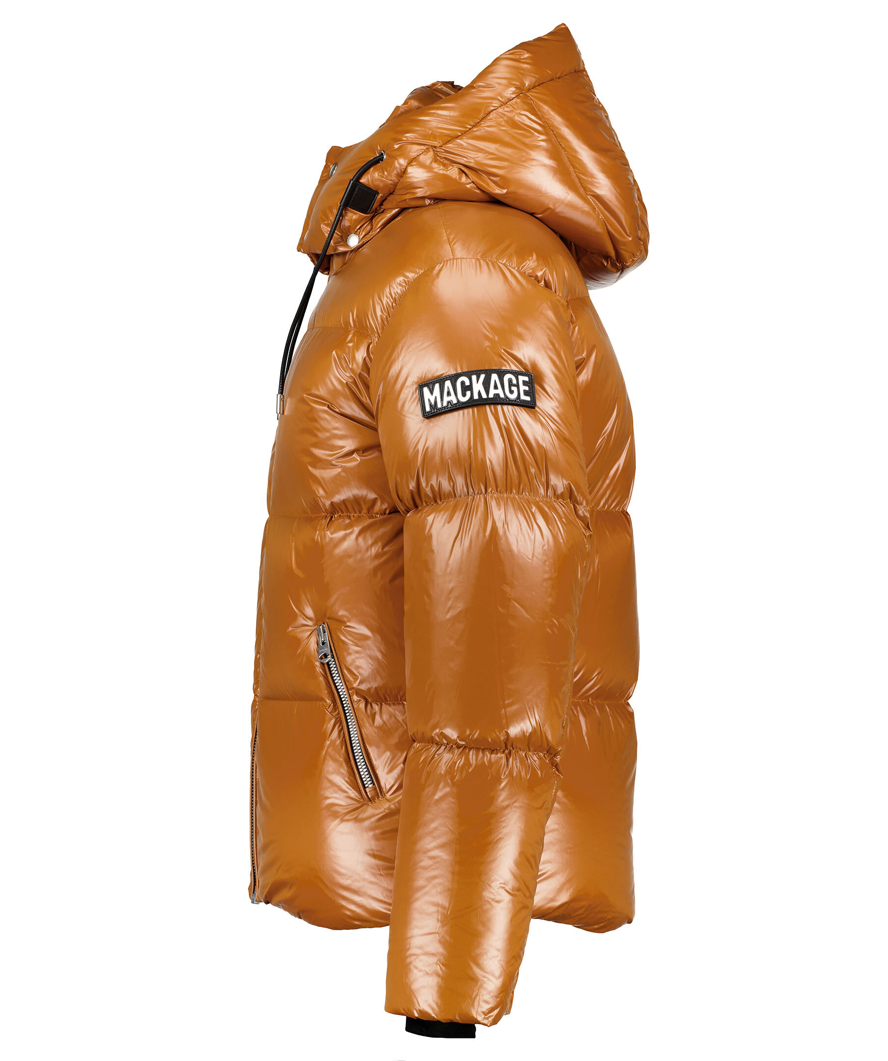 Brun quiltad dunjacka från Mackage i glansigt nylontyg. Stängs med silverfärgad dragkedja framtill. Avtagbar luva med tryckknappar samt dragsko i svart läder. Två snedställda fickor fram som stängs med dragkedja och två innerfickor med dragkedja. Avtagbar patch i svart och vitt läder med logotyp på vänster ärm. Dragsko i plaggslut och svarta muddar ärmslut. Hög krage och tryckknappar på luvan som knäpps över kragen.