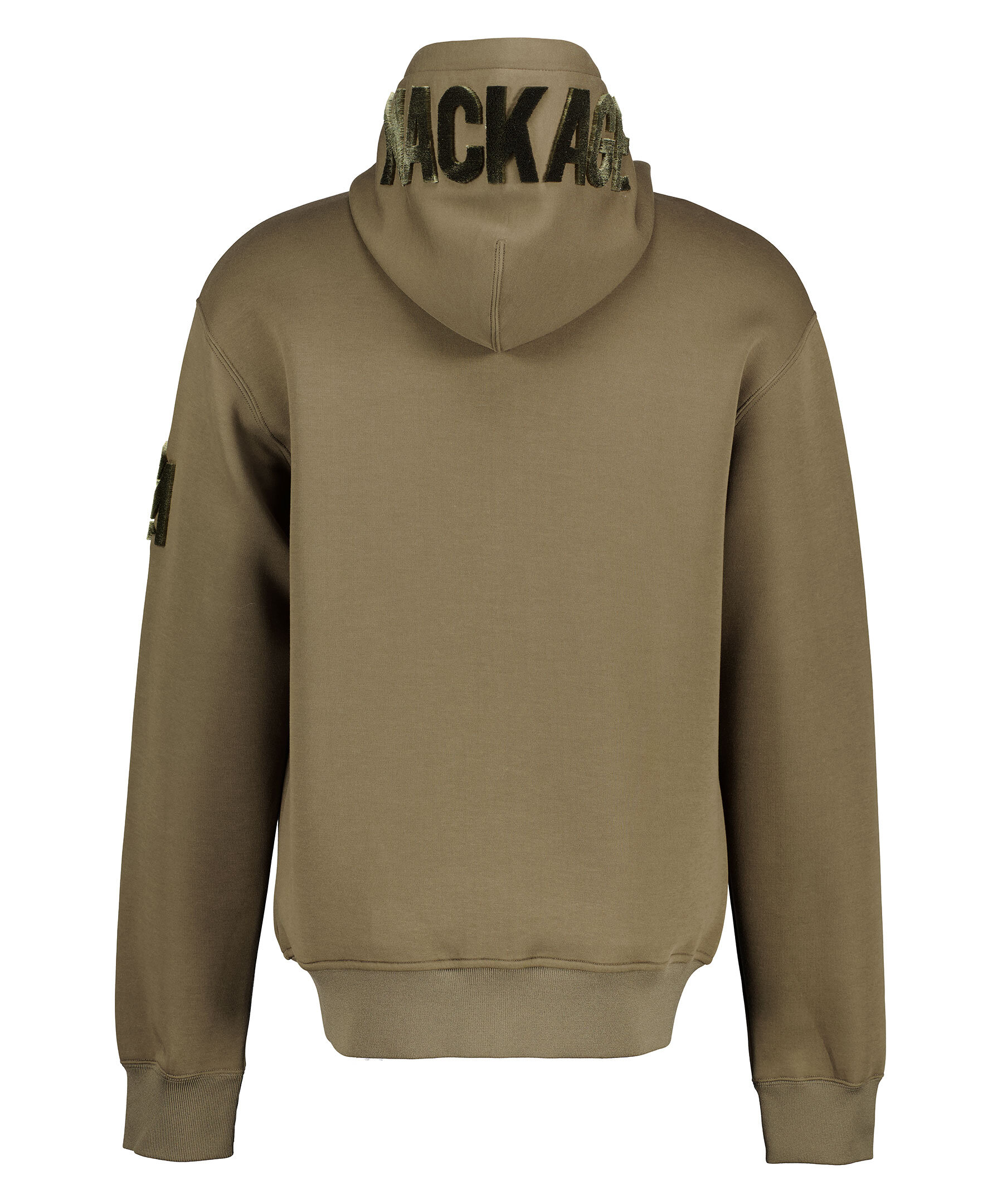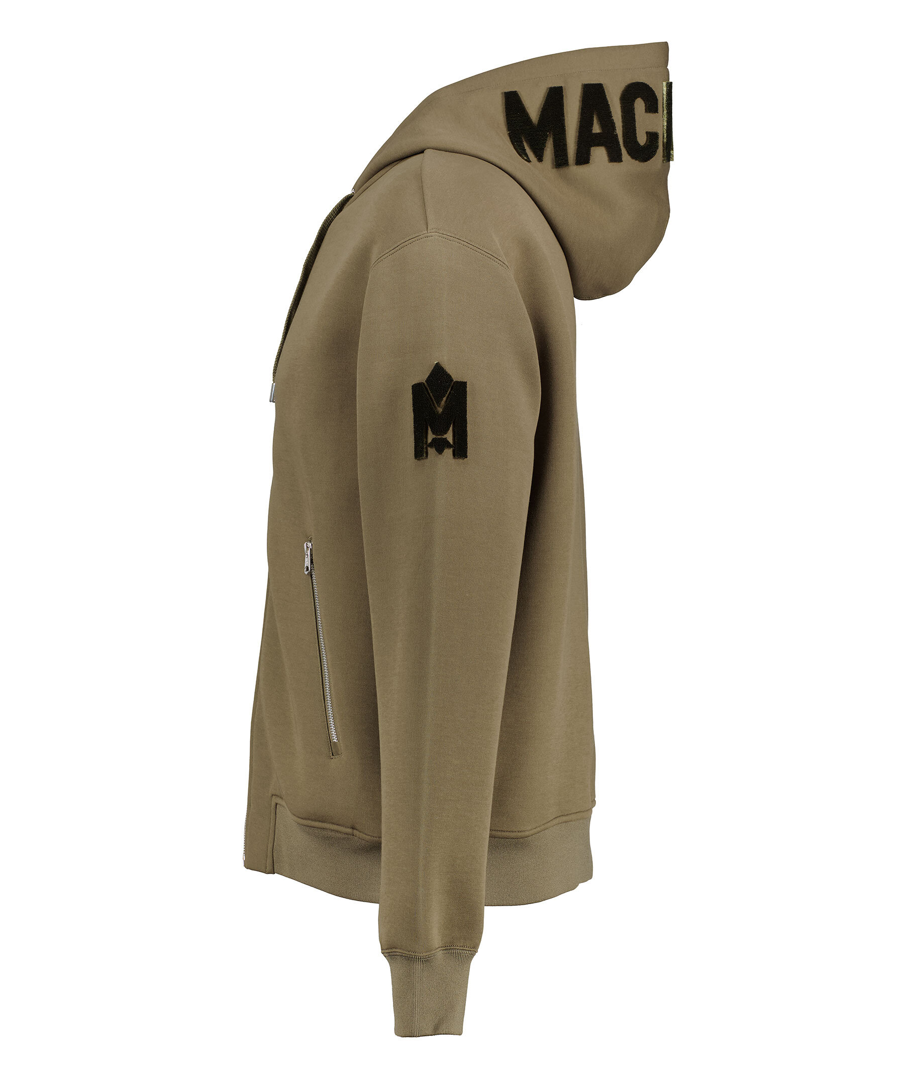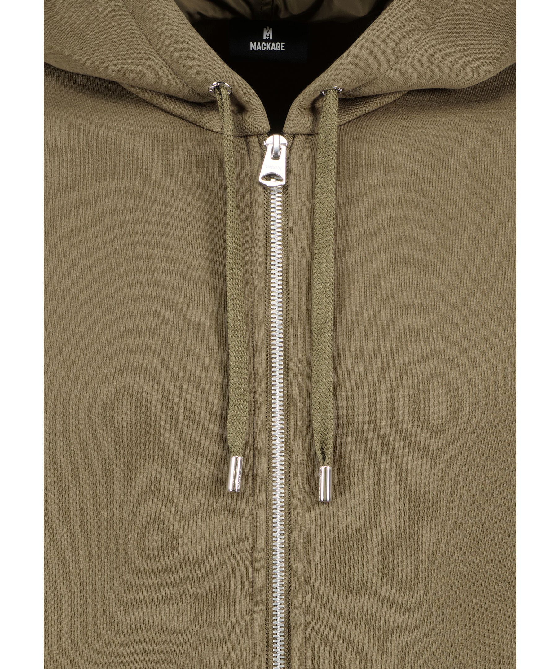 Olivgrön hoodie som stängs med dragkedja från Mackage. Luva med snörning och ribbstickade muddar vid ärm- och plaggslut. Logotyp i textiltextur på vänster bröst samt på luvan. Fickor i sidorna som stängs med dragkedja. Tillverkad i bomulls blandning.