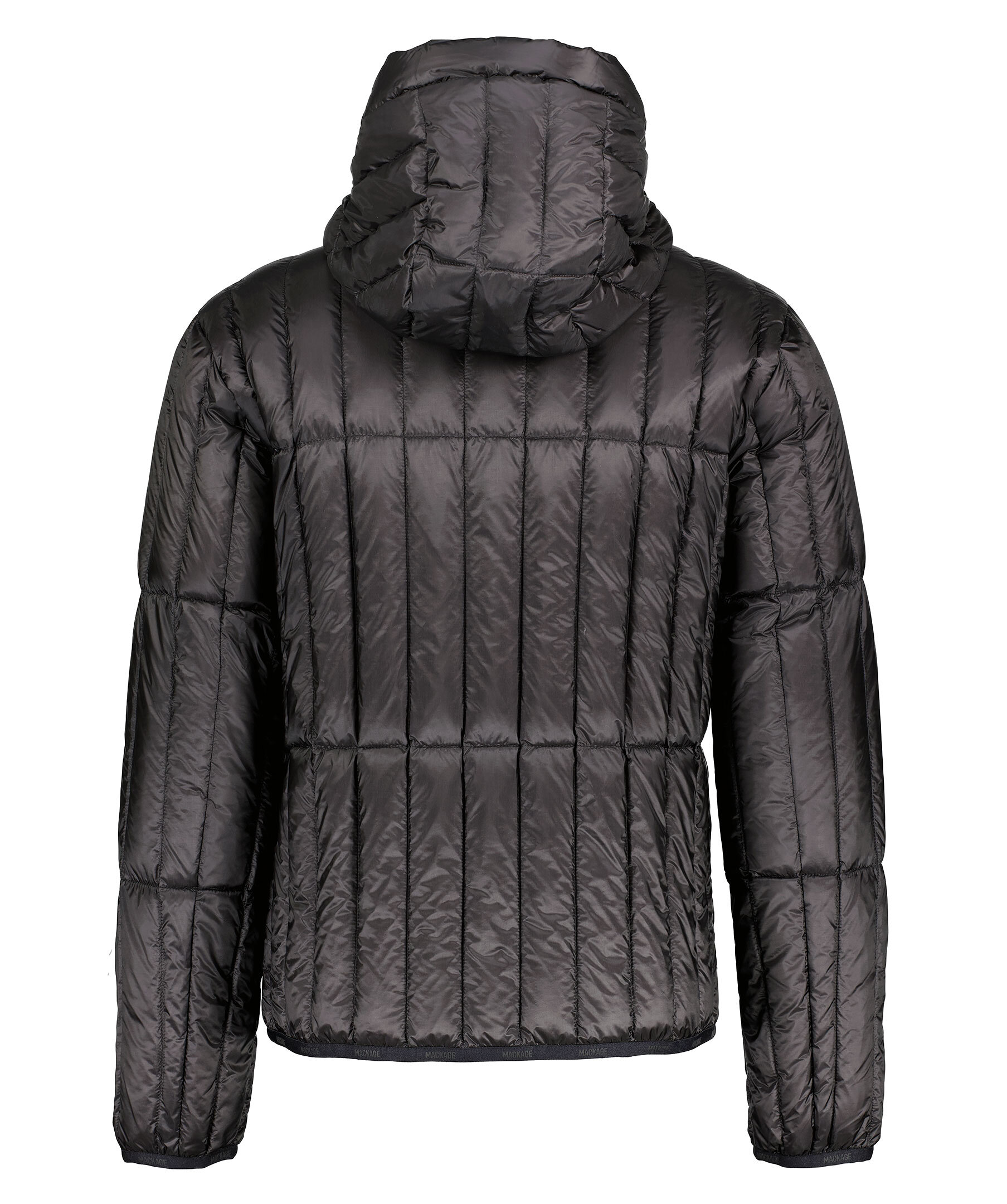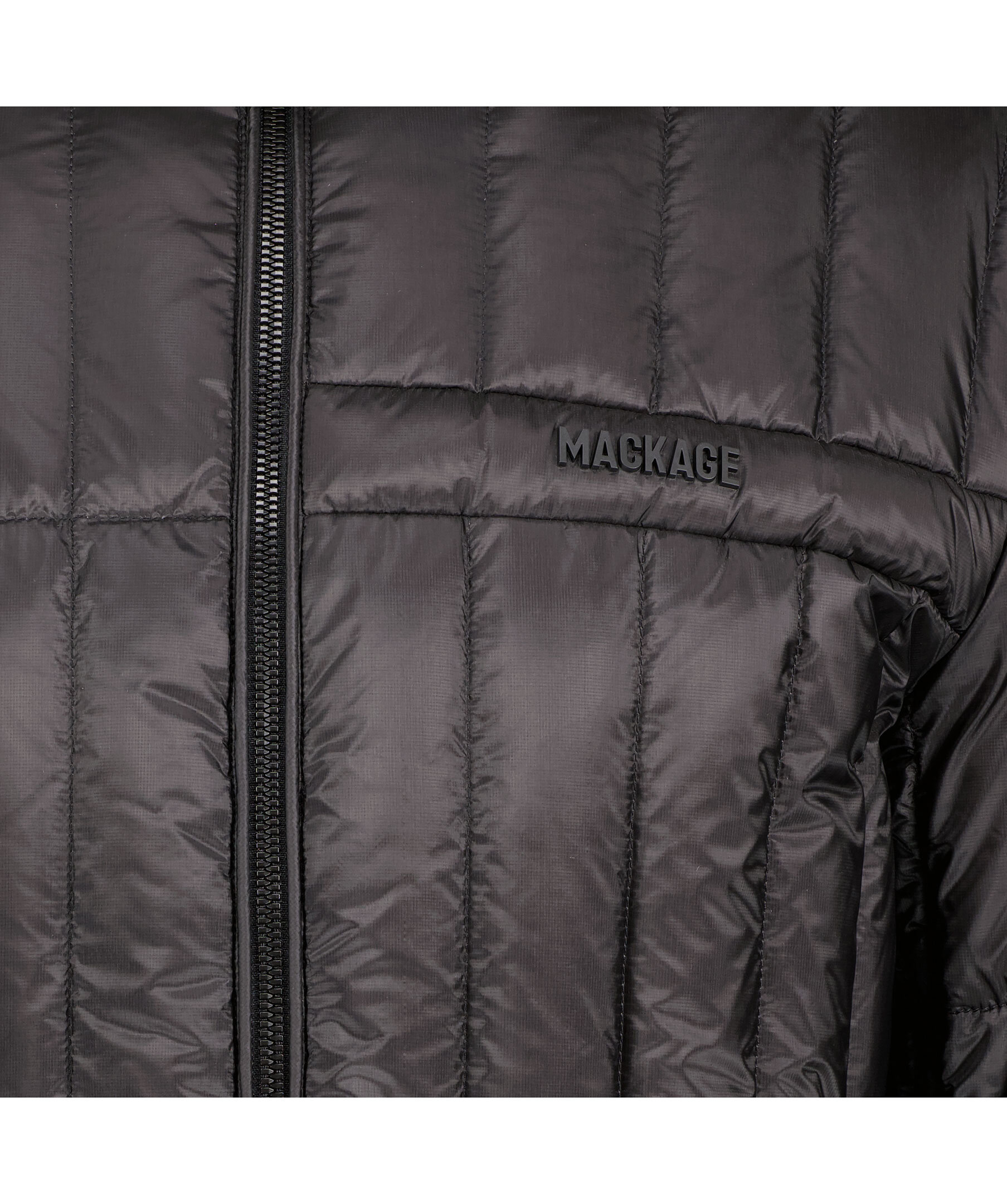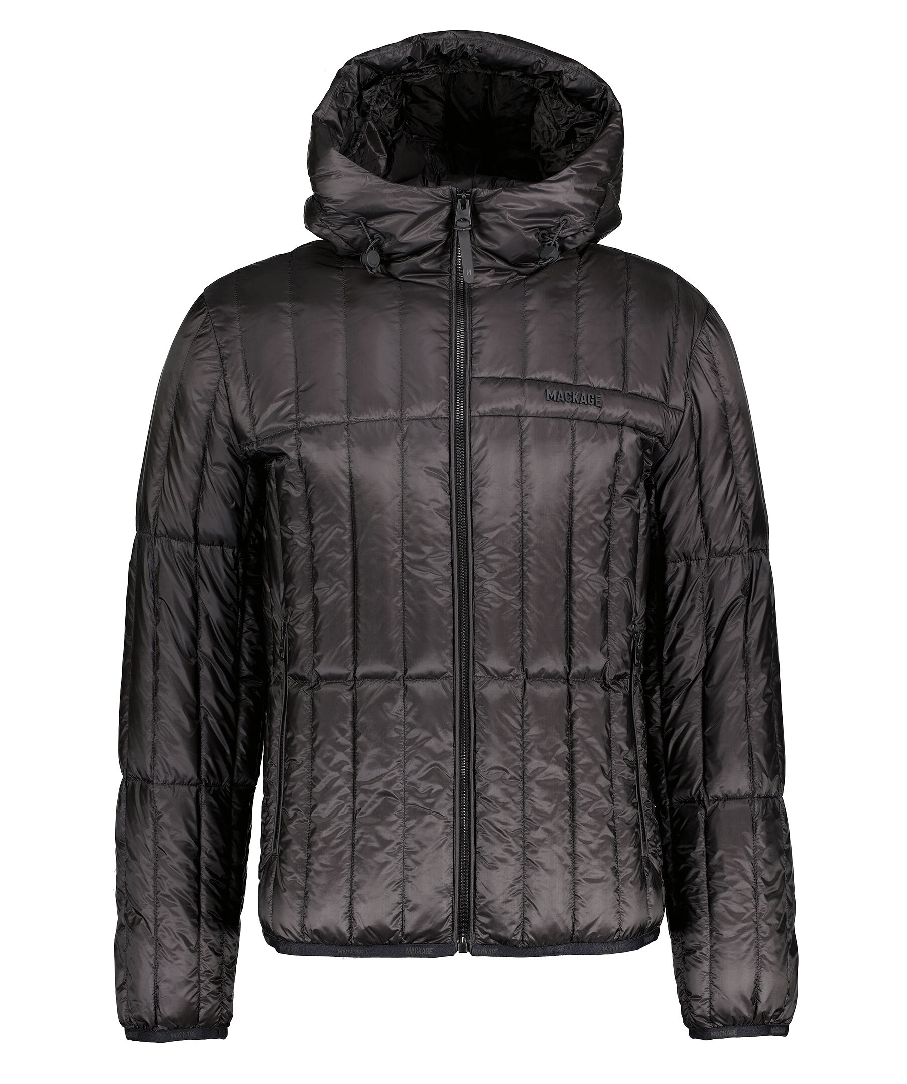 Svart quiltad dunjacka från Mackage. Stängs framtill med dragkedja. Två fickor framtill som stängs med dragkedja. Luva med dragsko. Gummerad logotyp på vänster bröst. Smal elastisk mudd vid ärm- och plaggslut med tryckta logotyper.