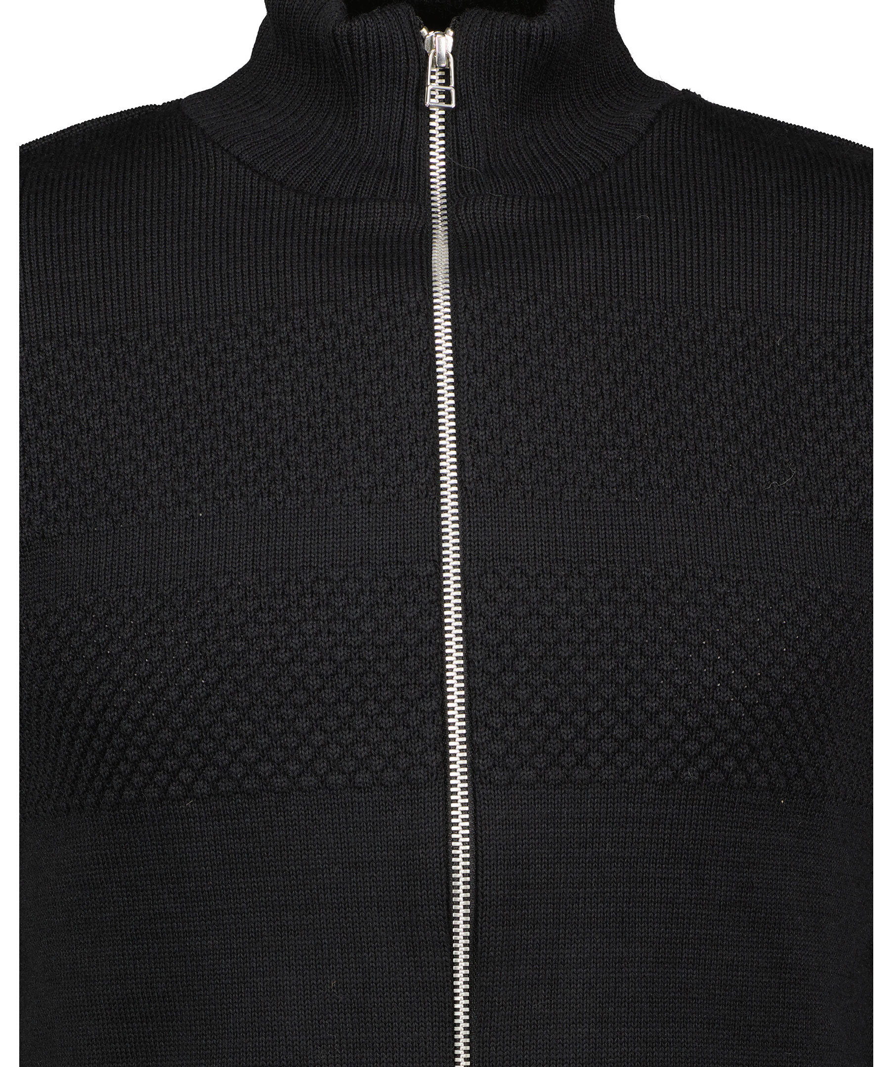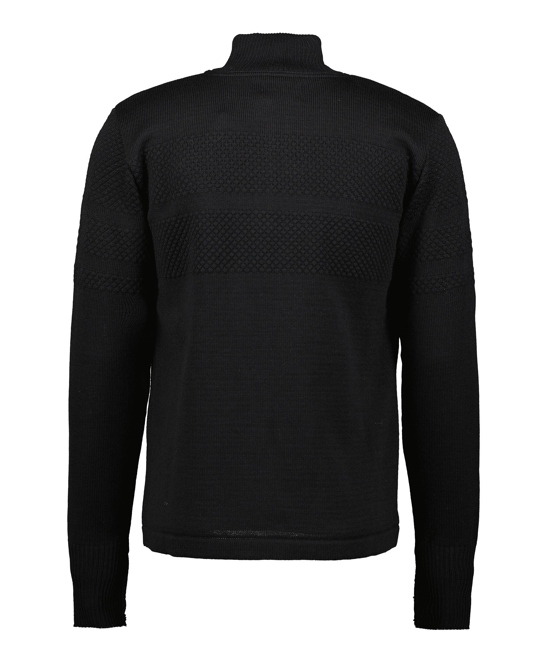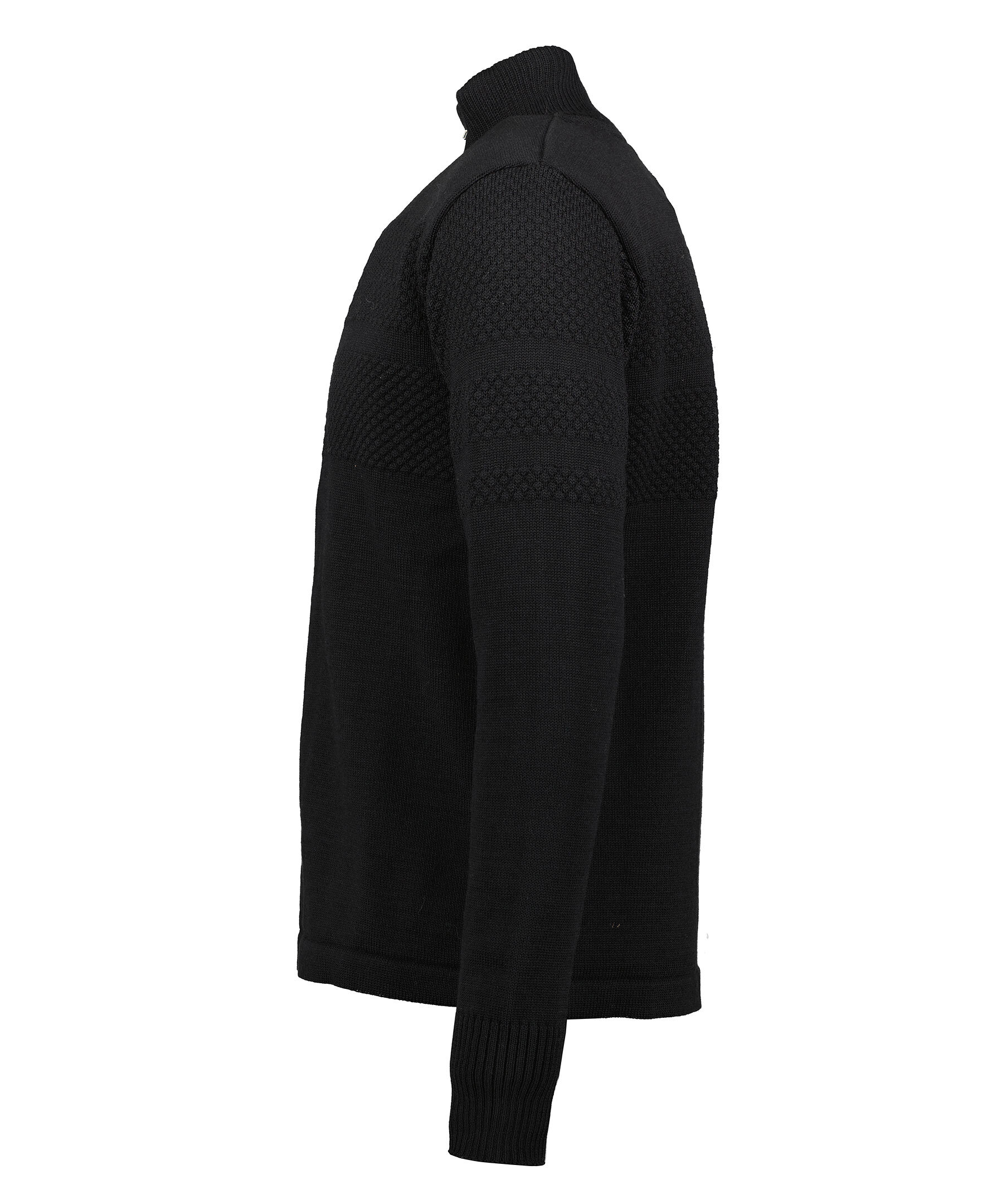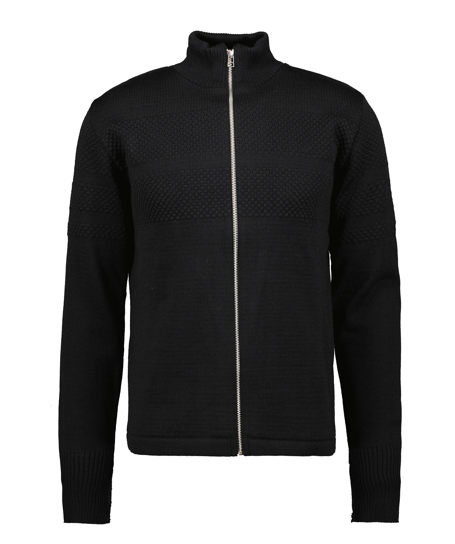 Svart, stickad kofta med heldragkedja från Mads Nørgaard. Tillverkad av 100% ull. Den är tätstickad, tung och den är riktigt varm. Kanterna är ribbstickade, halsen är hög, passformen är tight och stilen är sjöman.